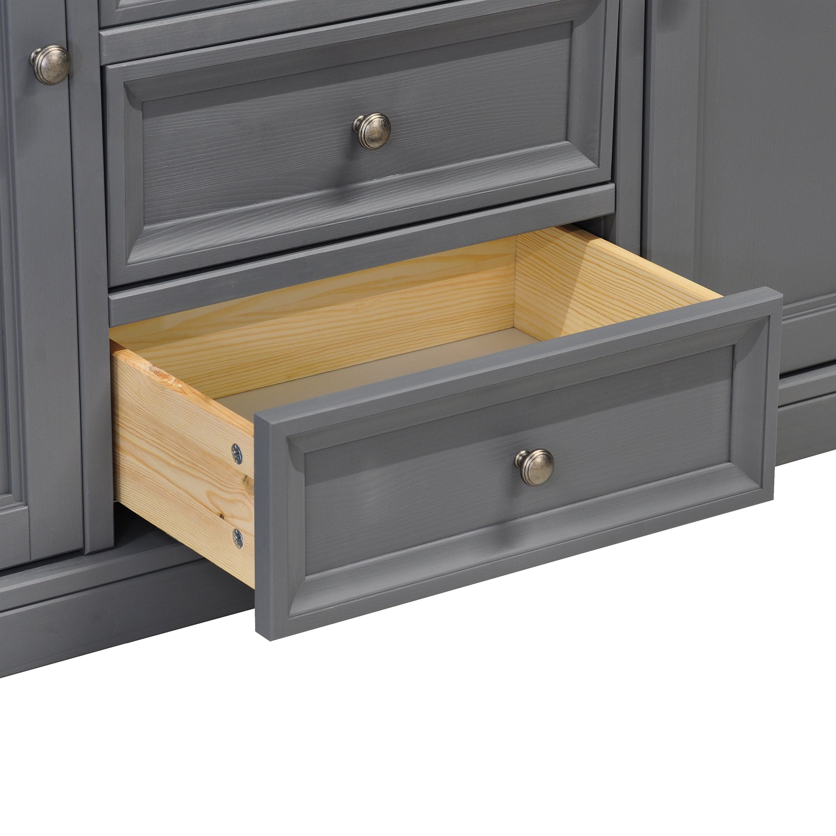 Шкаф витрина имеет 4 распашные двери, которые обеспечивают легкий доступ к содержимому, не занимая при этом много места. Эти стеклянные дверцы защищают ваши вещи от пыли, оставаясь при этом прозрачными, чтобы ваши любимые предметы постоянно были на виду. Шесть съемных полок и 6 ящиков обеспечивают достаточно пространства для хранения вещей и посуды. Максимальная нагрузка составляет до 5 кг на полку и ящик.