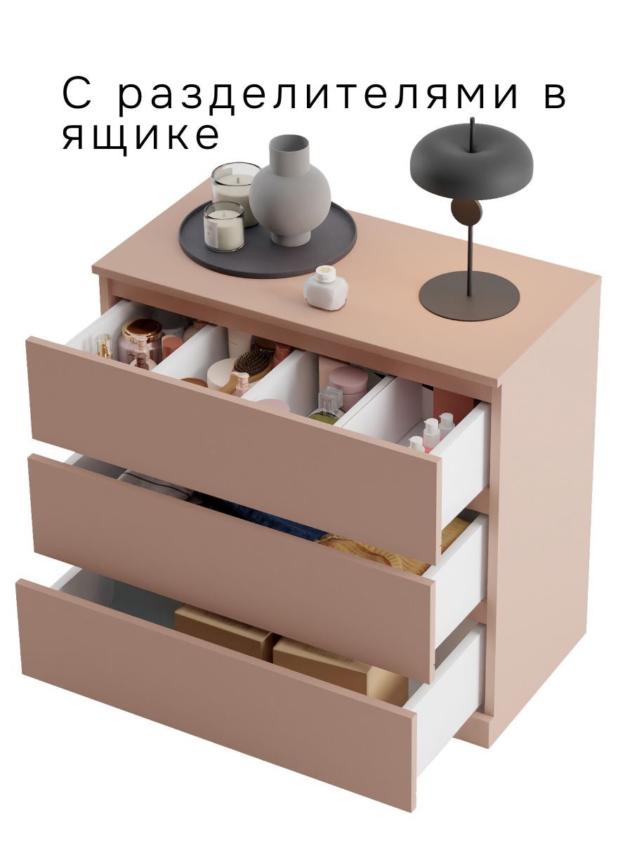Ящики комода Марм можно использовать для хранения вещей одного типа или тематически разделить их по назначению. Например, верхние ящики использовать под носки, перчатки и шарфы, средние - под футболки и майки, нижние - под пижамы и домашнюю одежду. В комплекте с комодом для одежды дополнительно поставляется органайзер для хранения. Комплект представляет собой 3 разделителя, которые можно установить внутри выдвижного ящика при сборке в нужном количестве. Также улучшили направляющие - теперь комод комплектуется деревянными направляющими, которые будут плавно выдвигаться и тихо закрываться, более надежны и долговечны.