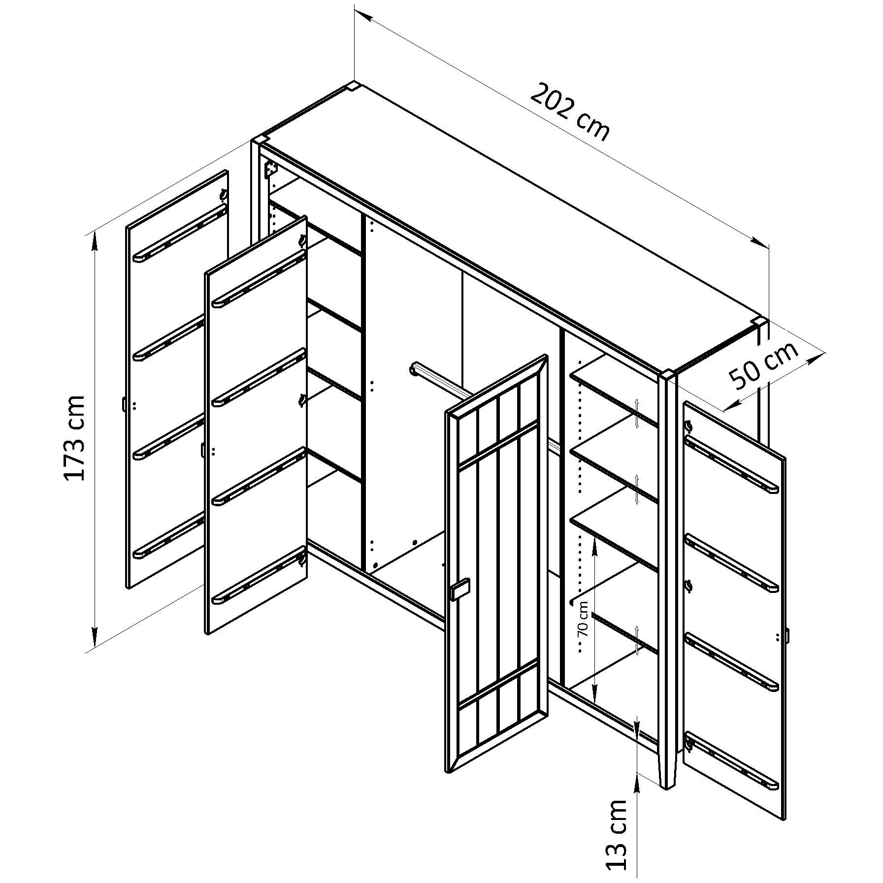С габаритами 202x50x173 см Карлос легко впишется в пространство вашей комнаты, а высота ножек в 13 см обеспечит надежную стабильность и удобство использования. Напольный белый шкаф для спальни изготовлен из натурального массива сосны, корпус, фасады, ручка - из массива сосны толщиной t=18 мм, стенки, полик, перегородки толщиной t=14 мм, задняя стенка из ДВП толщиной t=3 мм, сечение ножек - 50х40 мм.