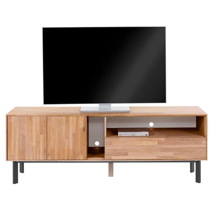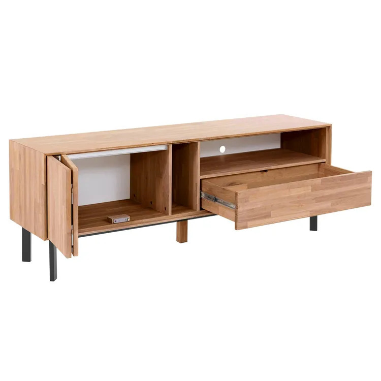 Тумба под телевизор Виби изготовлена из высококачественного дуба, что обеспечивает долговечность и устойчивость к износу. Металлические ножки придают ей современный индустриальный вид, что особенно понравится поклонникам минимализма и лофта в интерьере. Эта тумба под телевизор прекрасно сочетает в себе элегантность натурального дерева и надежность металла.