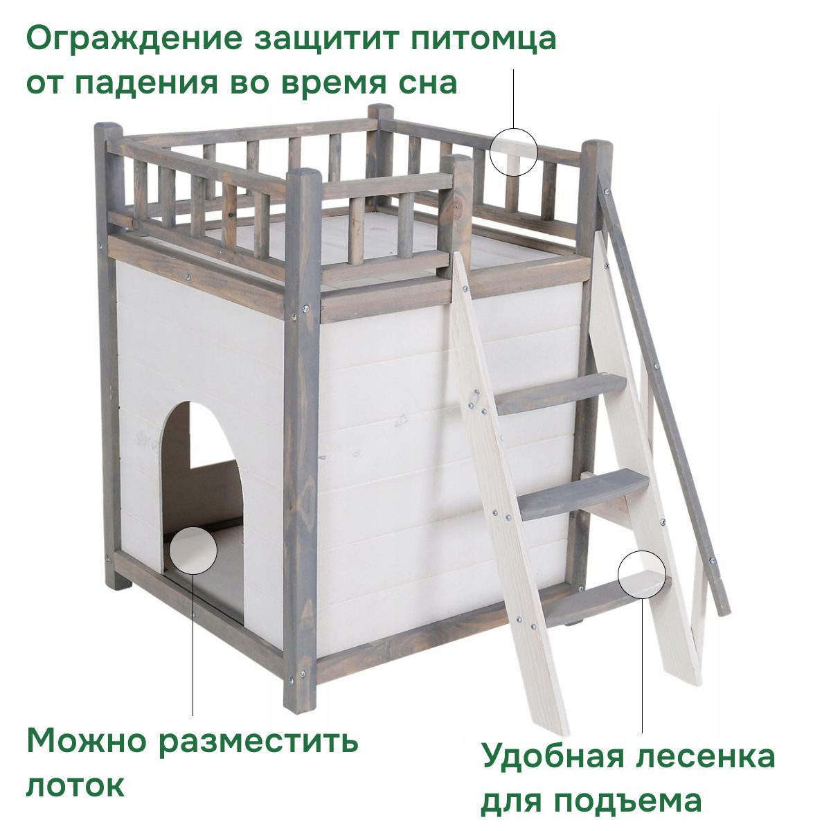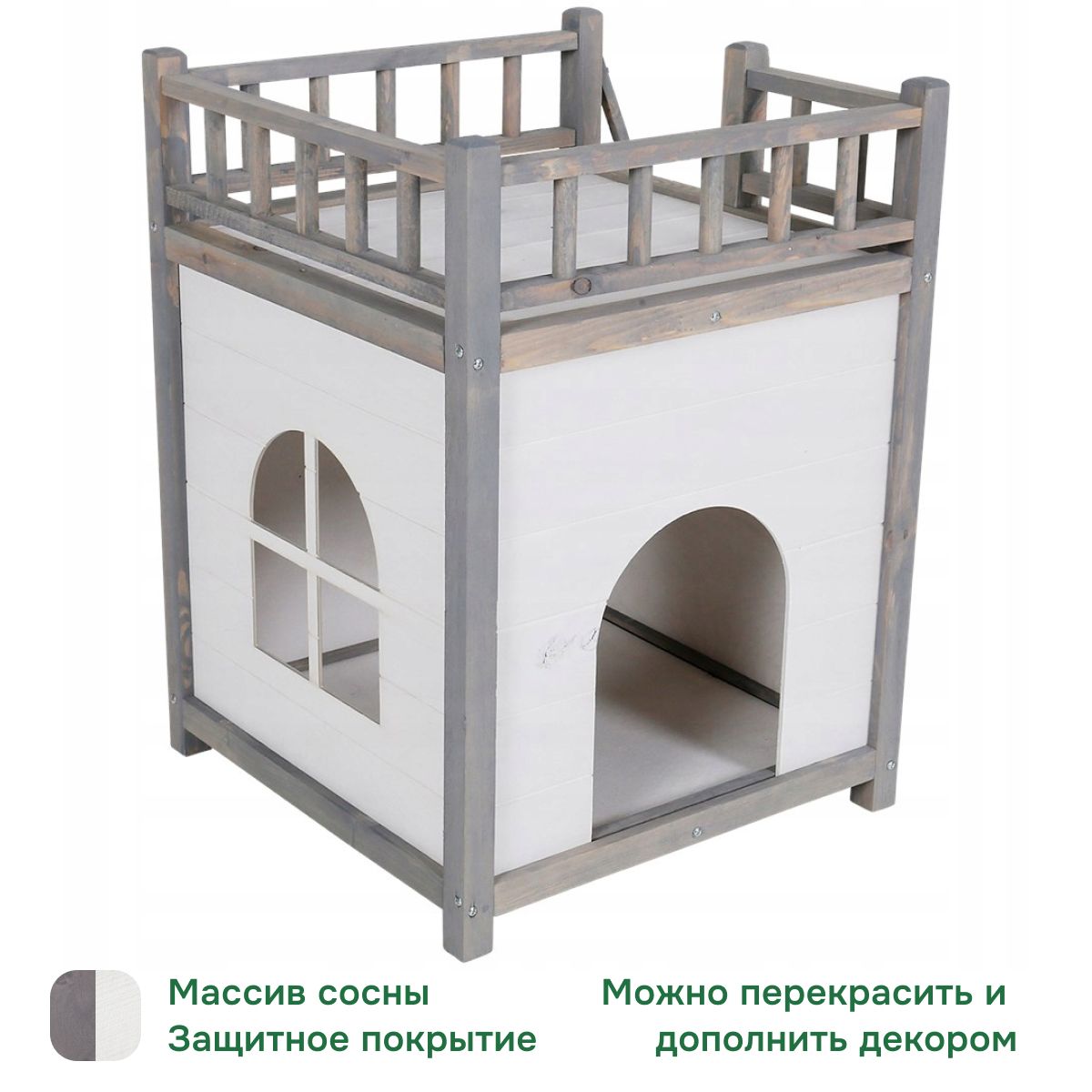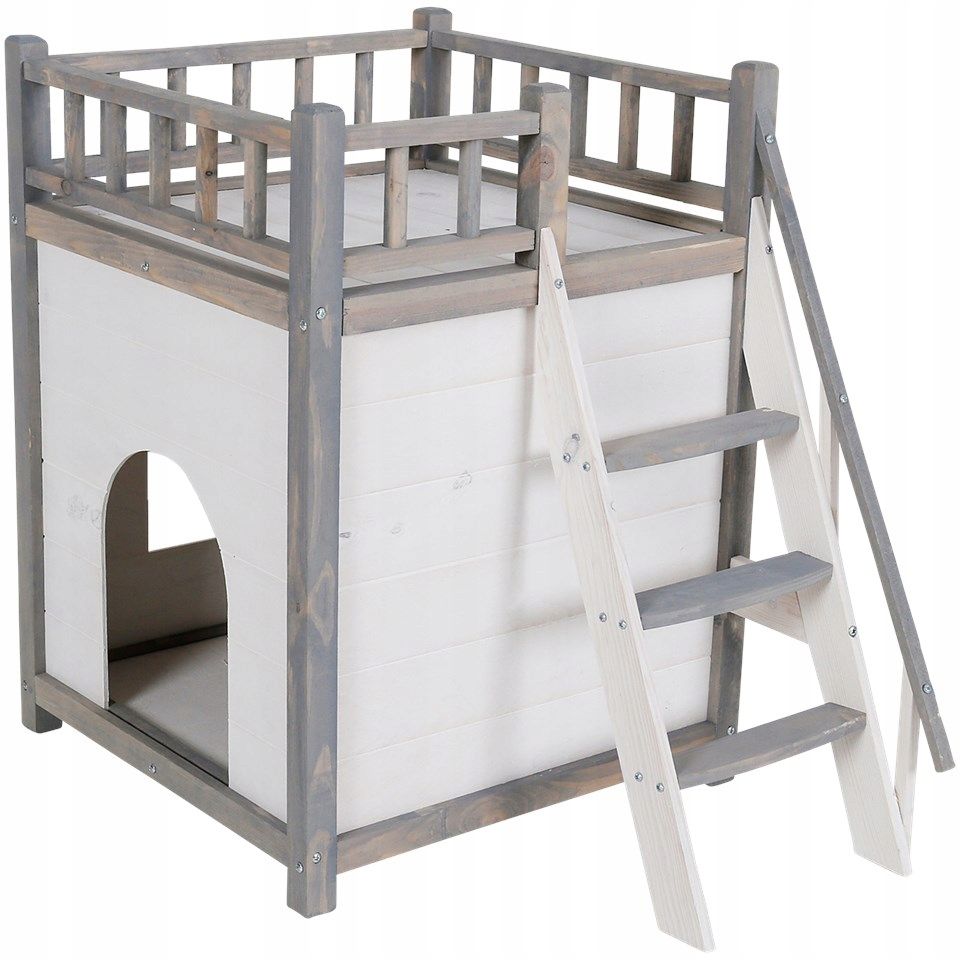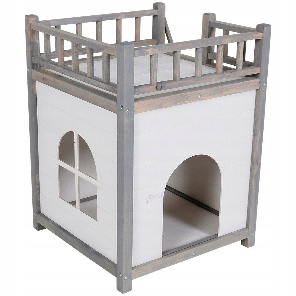 Натуральные белые и серые цвета дерева придают домику для животных особый шарм и позволяют он гармонично вписываться в любой интерьер. Дом для кошки имеет 2 этажа и лестницу для подъема на 2 этаж. На 2 этаже имеется декоративное ограждение, на 1 этаже имеется проход вырез в виде окна - размеры прохода домика Ширина х Высота - 19х25 см. Он подойдет для дома, квартиры, дачи или загородного дома, а также стилей интерьера, таких как скандинавский, рустик, кантри, минимализм и лофт.