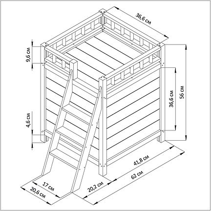 Размер самого домика для животных Глубина х Ширина х Высота - 62х41.8х56 см, что обеспечивает комфортное пространство для вашего питомца. Лестничный проход составляет 17 см, позволяя легко подняться на второй этаж, где имеется декоративное ограждение. На первом этаже находится проход в виде окна размером 19х25 см.