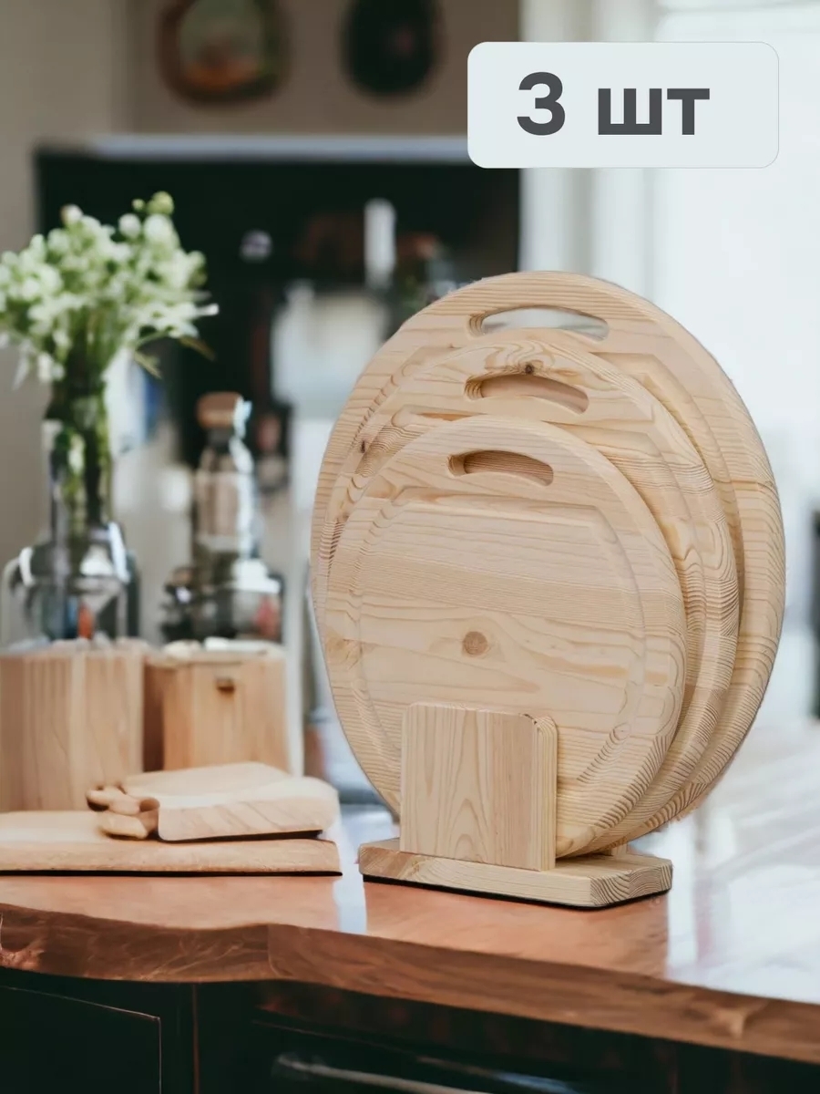 Набор разделочных досок состоит из трех деревянных досок и деревянной подставки. Материал производства набора разделочных досок на подставке - сосна.