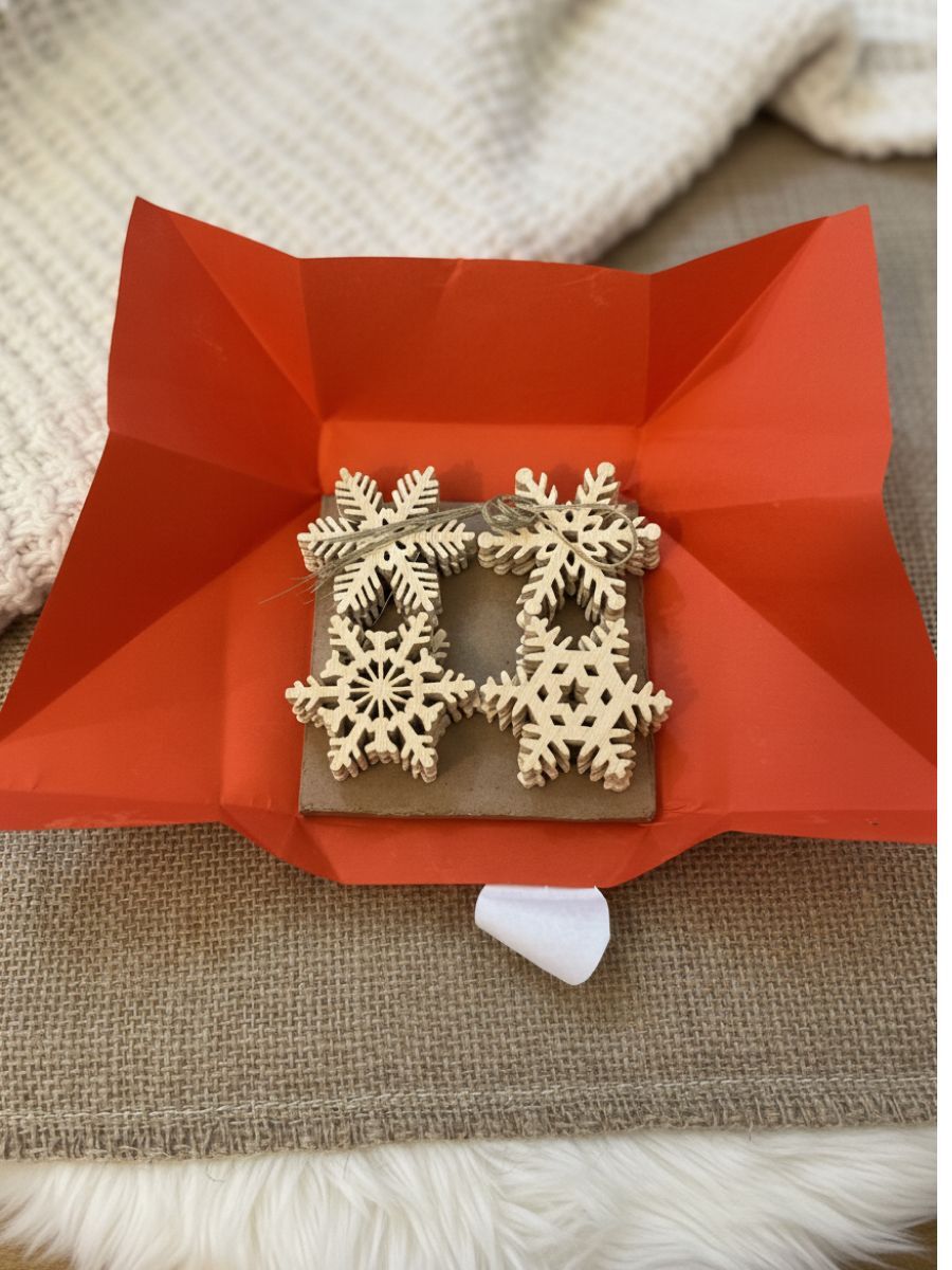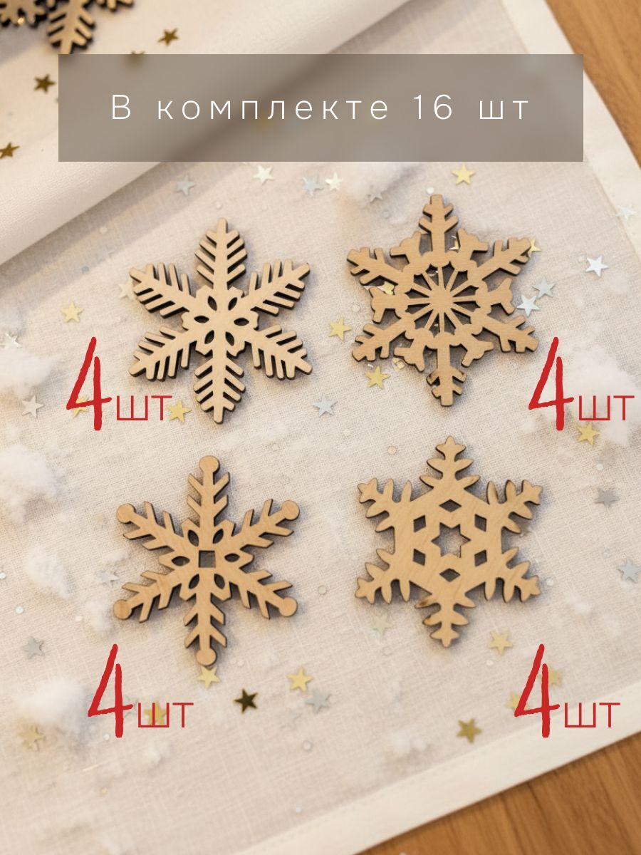 Снежинки из дерева (16 шт.), подарочная упаковка, золотистые нитки
