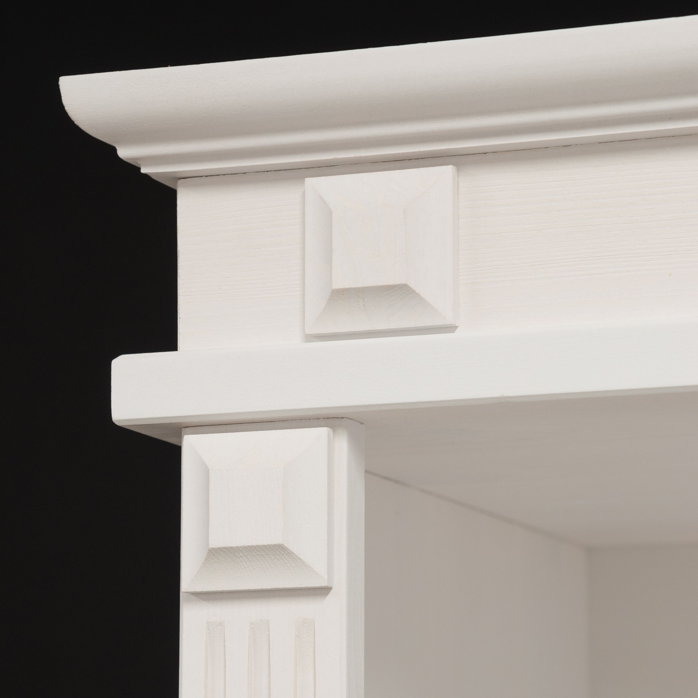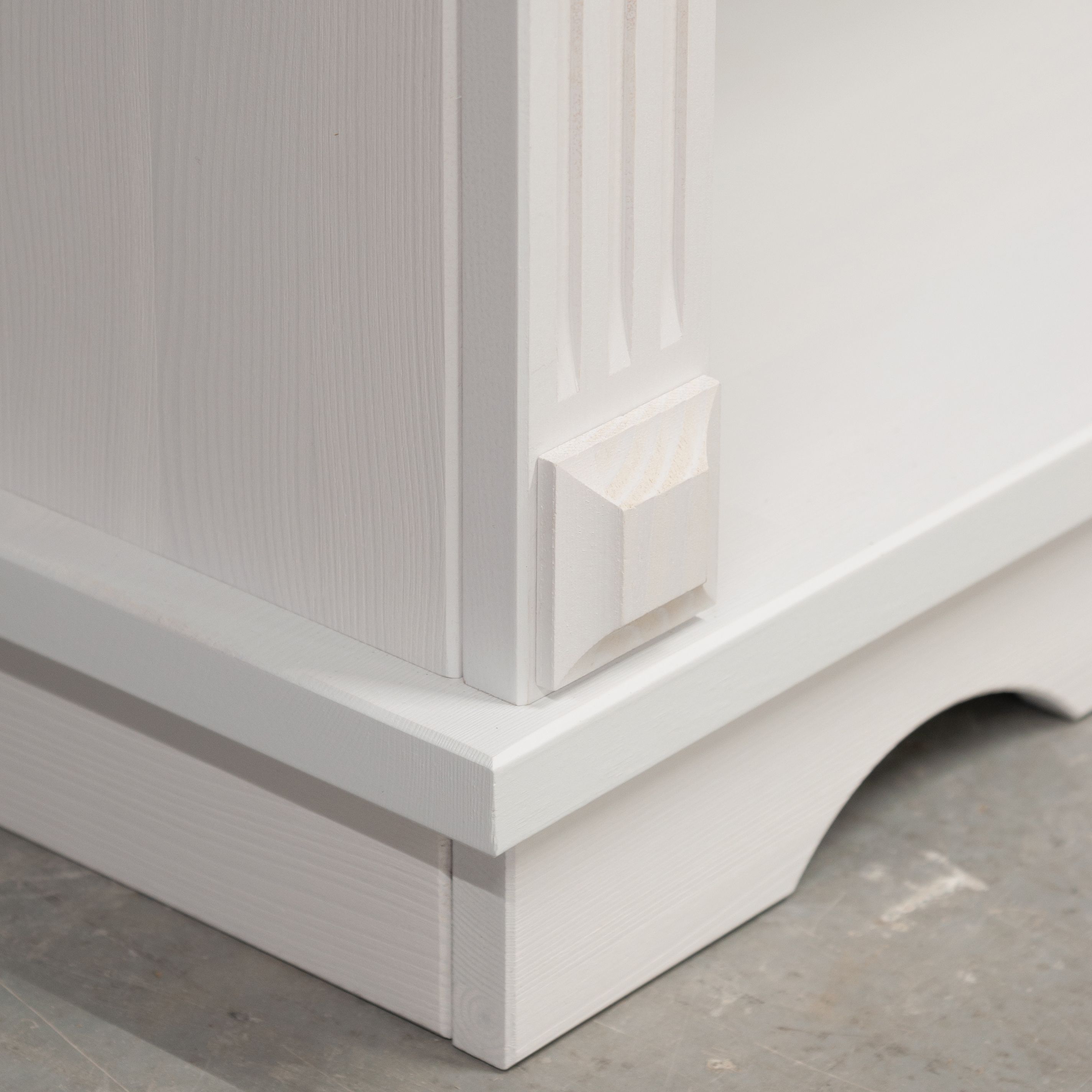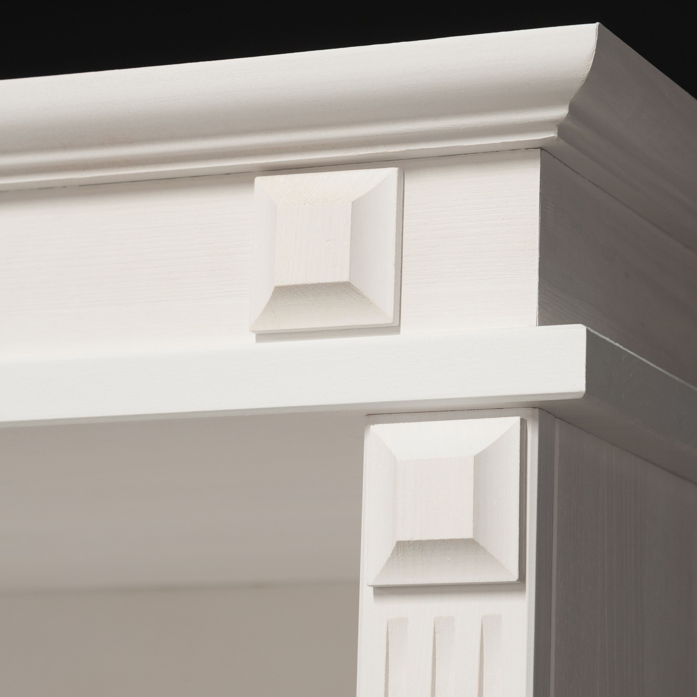 Мы использовали массив натуральной сосны для создания корпуса и фасадов шкафа. Задняя стенка выполнена из белого ДВП.
