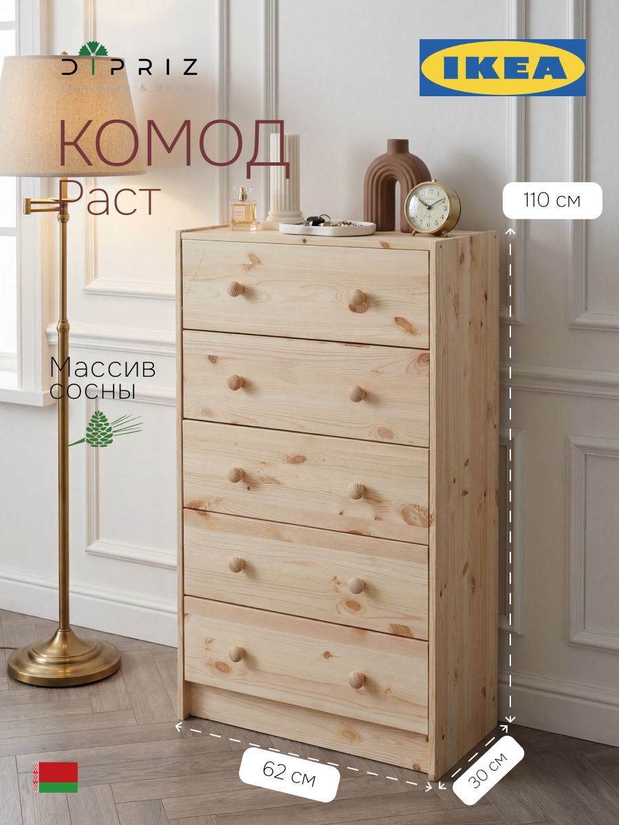 Комод в стиле ИКЕА Раст – это современное сочетание стиля и функциональности. Минималистичный дизайн и просторные ящики делают его идеальным выбором для хранения вещей и создания стильного интерьера. Стильный комод из массива сосны отлично впишется в комнаты современного и скандинавского стиля, бохо, лофт, минимализм. Подчеркните уникальность и создайте свое уютное домашнее пространство с нашей мебелью. Мы заботимся о Вашем удобстве!