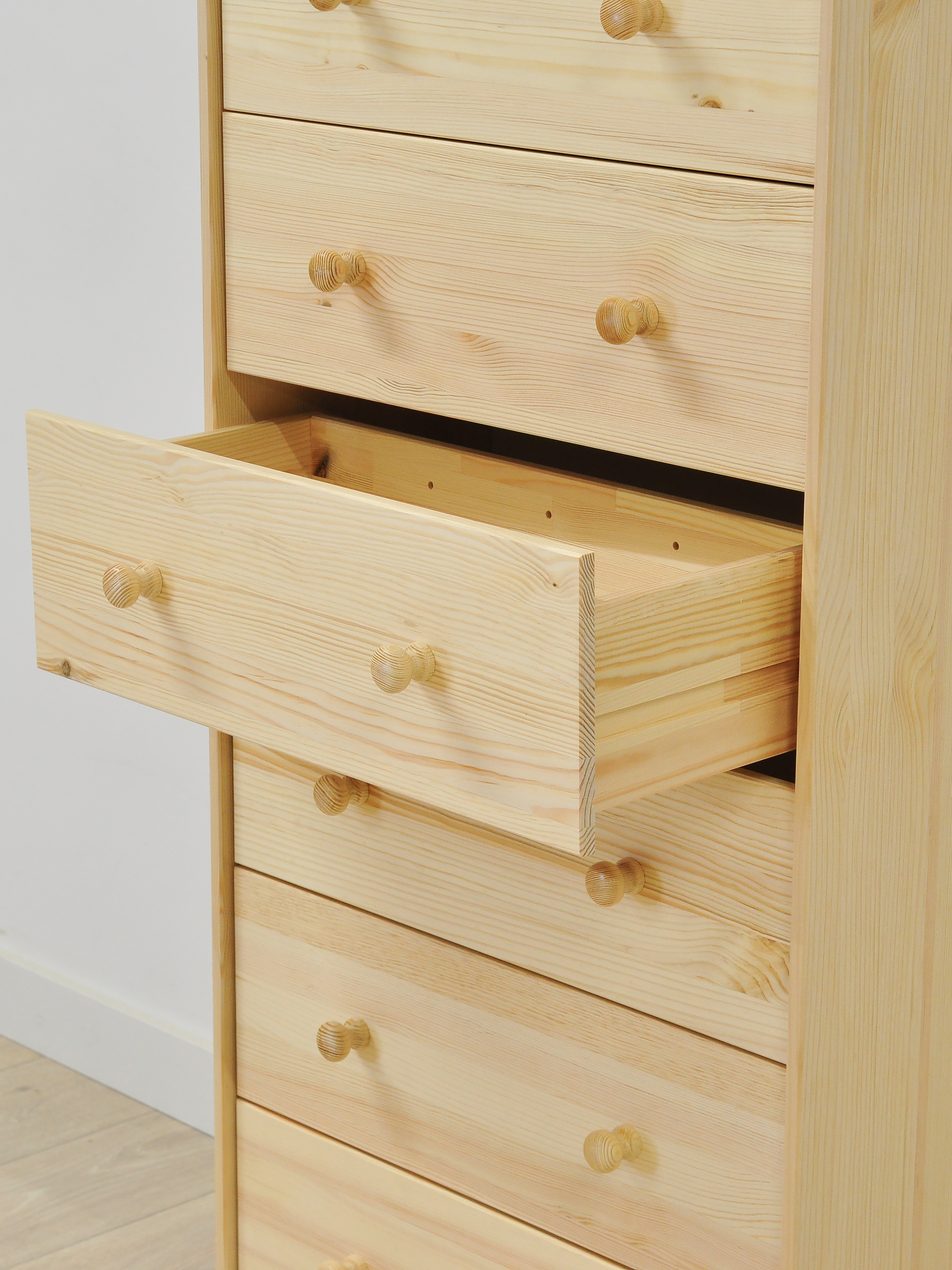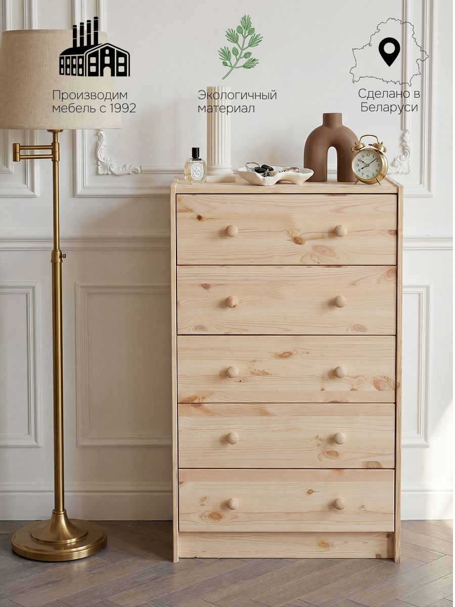 Комод Раст от белорусского производителя Dipriz изготовлен из экологически чистого материала - натурального дерева - массива сосны, которое отличается высокой прочностью и долговечностью.