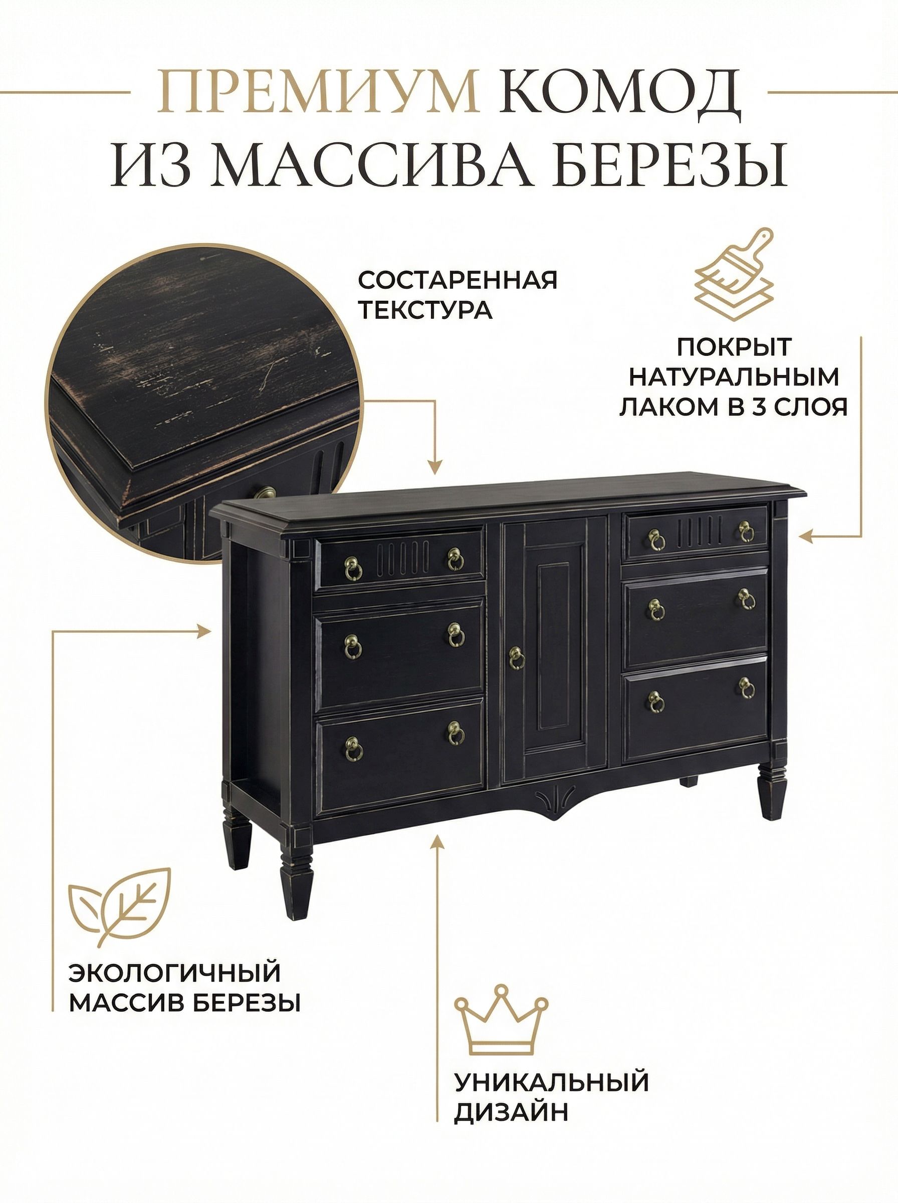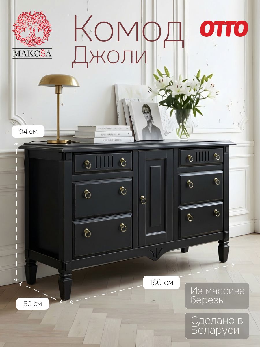 Комод 160х50х94, Джоли, с шестью ящиками для одежды, в спальню, прихожую, гостиную, массив березы, черный, Makosa