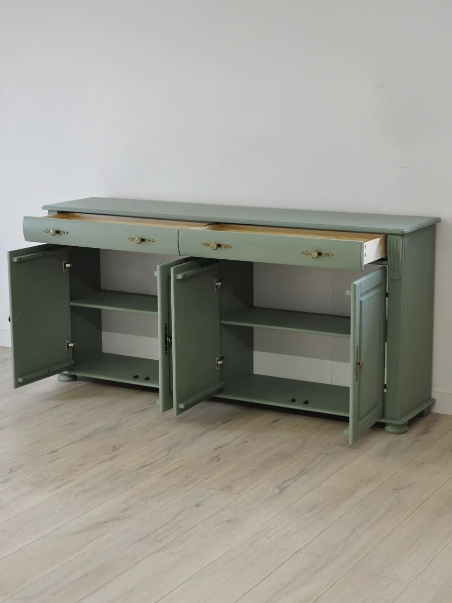 - Конструкция: 4 двери с полками внутри и 2 широких ящика – идеально для хранения одежды, постельного белья, посуды или аксессуаров.