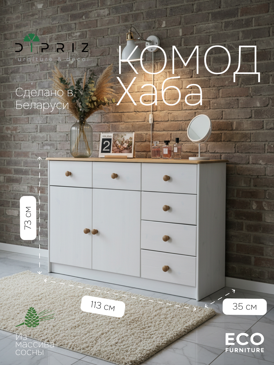 Комод "Хаба" из массива сосны — это сочетание домашнего уюта и современного минималистичного дизайна, которое подчеркнет стиль и комфорт вашего интерьера. Его изысканная поверхность с видимой структурой древесины и белое восковое покрытие в отделке "белый антик" создают атмосферу естественной красоты и тепла.