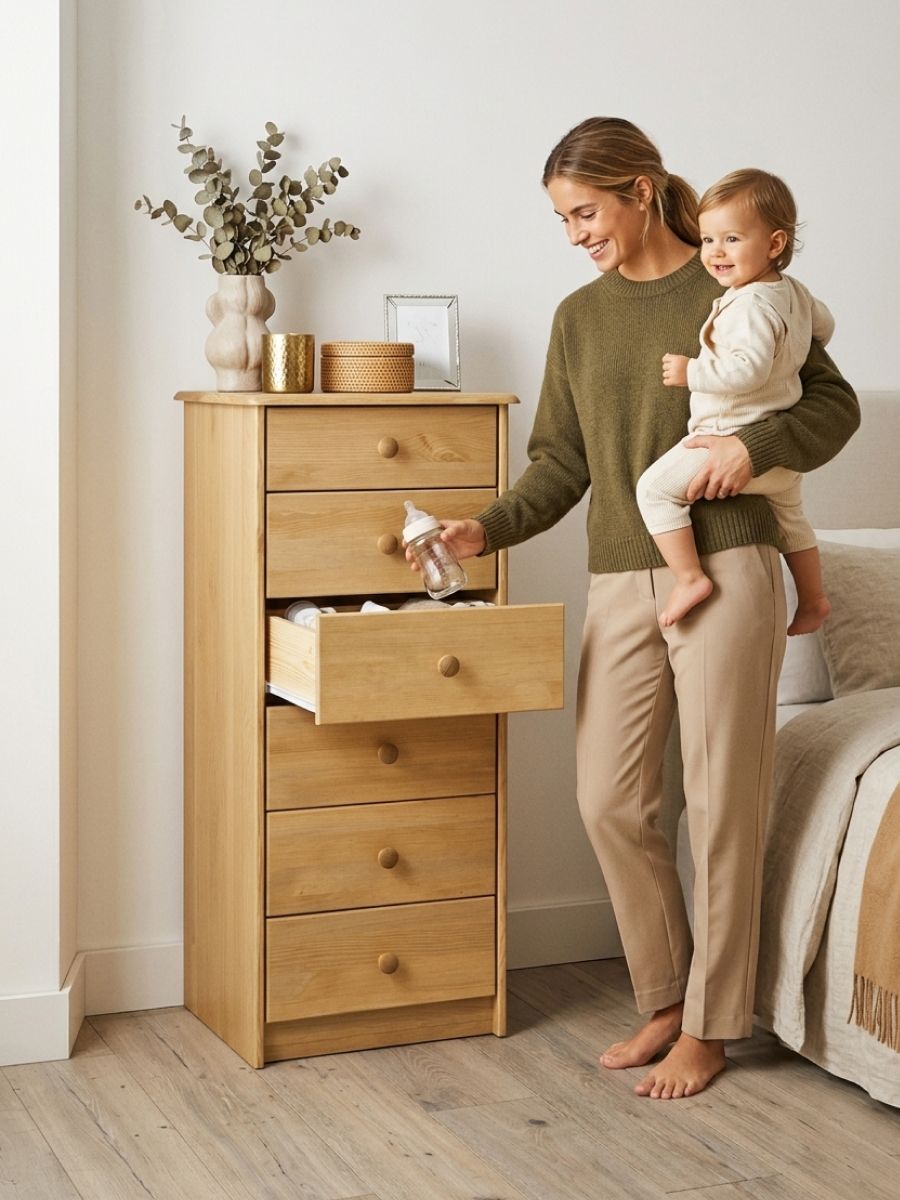 Ширина всего 43 см. Благодаря этому комод узкий встает там, где обычная мебель не помещается: в прихожей, между шкафом и кроватью, в детской или даже в ванной. При этом высота 101,7 см дает полноценную вместительность, а значит, это не временное решение, а продуманный комод в прихожую для обуви и ключей, комод детский для игрушек и первых личных вещей или надежный комод в спальню для повседневной одежды.