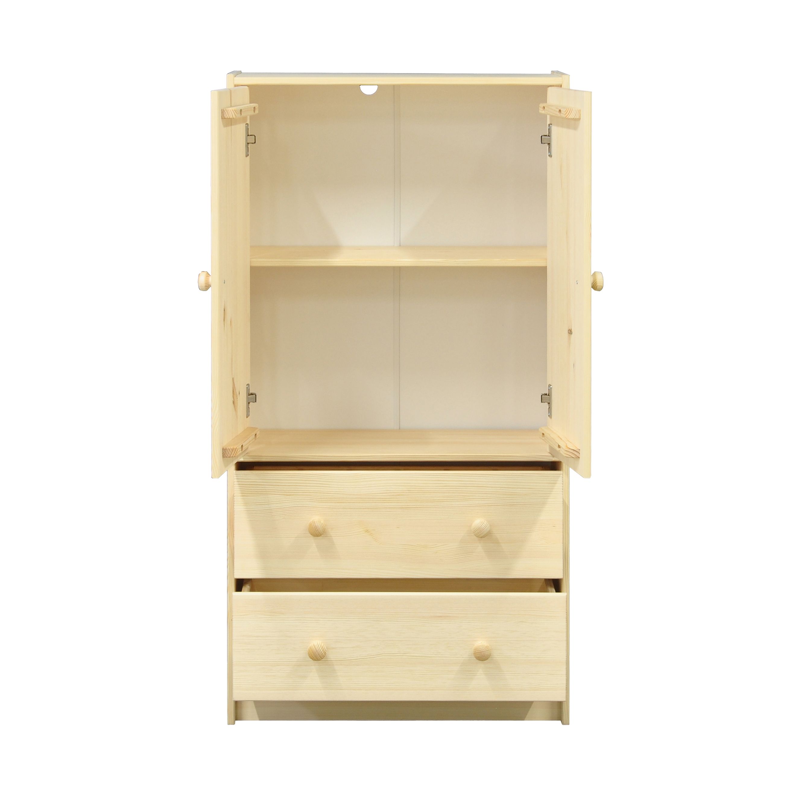 Конструкция комода включает в себя 2 распашные двери с ручками-кнопками, 2 выдвижных ящика на деревянных направляющих с разделителями внутри ящика, 1 съемную полку за дверцами с регулировкой по высоте в нескольких положениях. Габариты комода в собранном виде (Ширина х Глубина х Высота, см) составляют: 62х30х120 см. Внутренние размеры ящика - 54х25х19 см. Комод легко собирается благодаря подробной инструкции и полному комплекту фурнитуры, которые идут вместе с изделием.