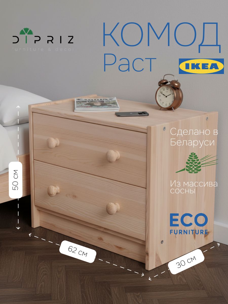 Комод Rast идеально подойдет для творческих людей, которые желают создать уникальный дизайн своего комода. Комод можно оставить и без покраски в натуральном цвете дерева. Все поверхности уже прошлифованы и готовы к эксплуатации. Благодаря своему компактному дизайну данный комод легко превратить в широкий комод, поставив несколько комодов вместе. Из нескольких комодов можно получить вместительный комод под телевизор. Комод с 2-мя ящиками будет отлично смотреться как мебель в прихожую, гостиную, детскую комнату, спальню и ванную комнату. Комод РАСТ изготовлен в классическом скандинавском стиле, обладает компактными размерами и лаконичным дизайном, и поэтому идеально впишется в любую комнату вашего дома: поставьте комод в детскую, чтоб получился замечательный комод для игрушек. Добавьте его в комнату к набору детской мебели. Поставьте его в спальню и получится хороший комод для вещей с ящиками. Может использоваться как прикроватная тумба тумбочка. Комод из массива сосны легко собирается. Стильный комод из массива дерева подойдет для стиля арт-деко, лофт, бохо, современный, скандинавский, ретро. Для прихожей, ванной комнаты, коридора, спальни, деткой комнаты, балкона, дачи, офиса.