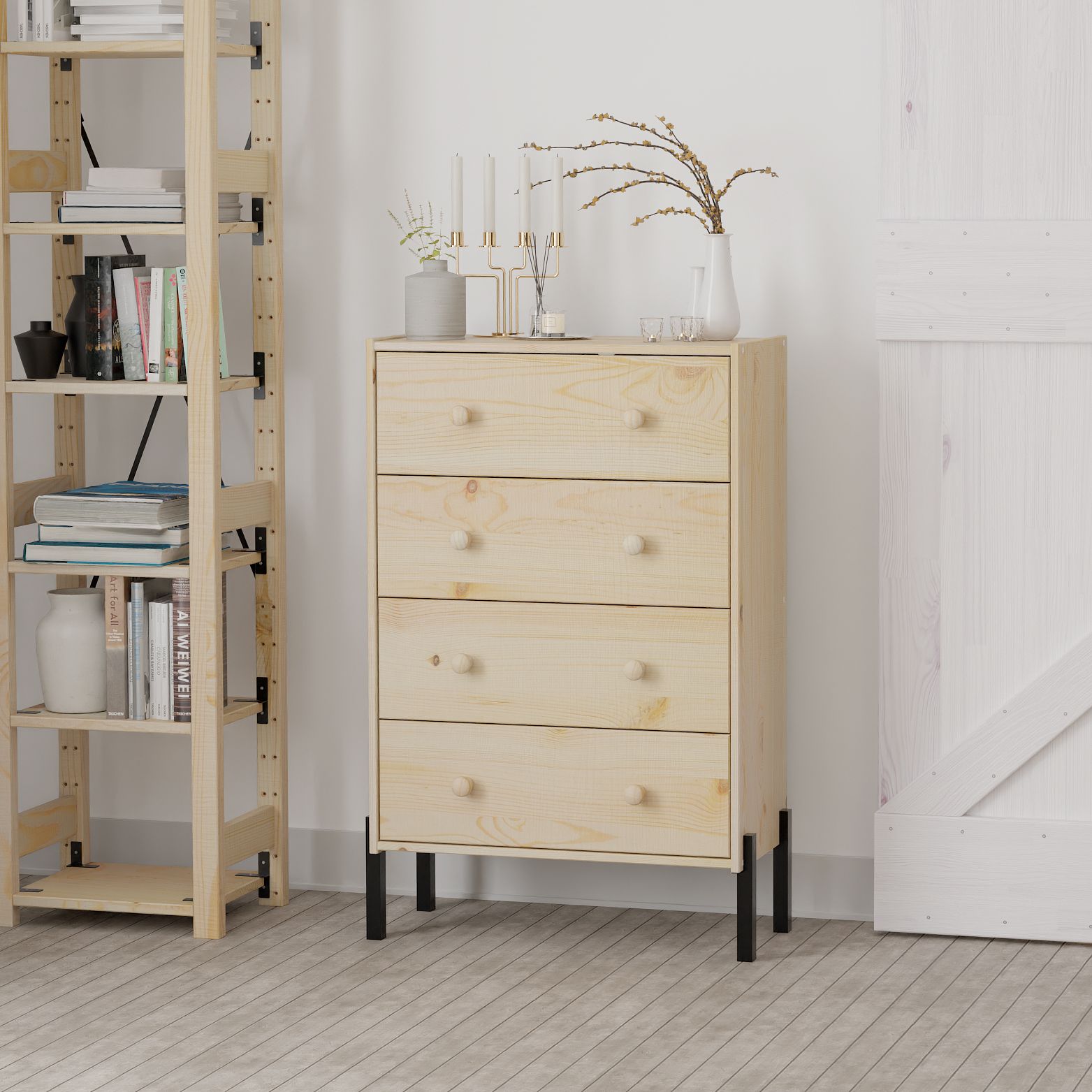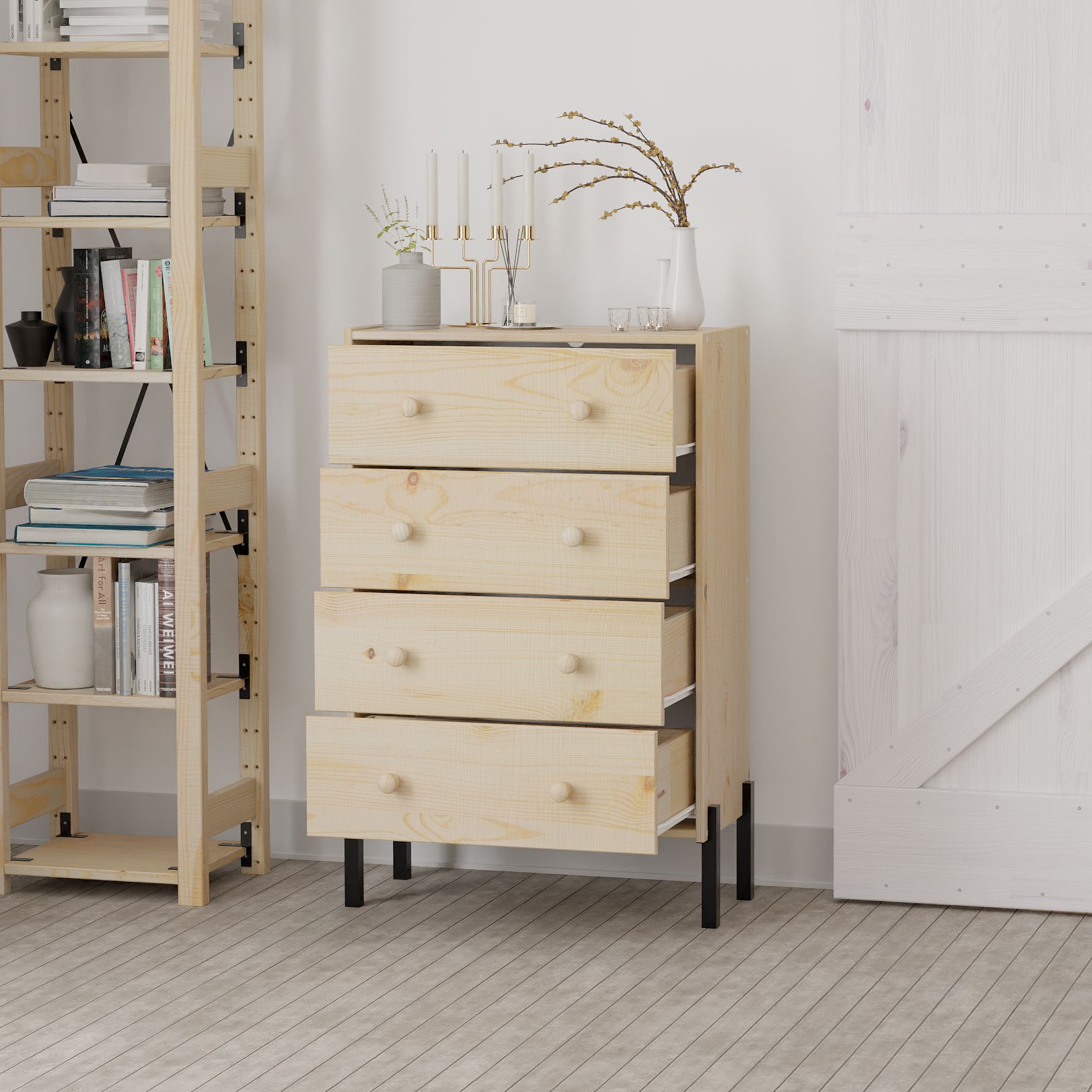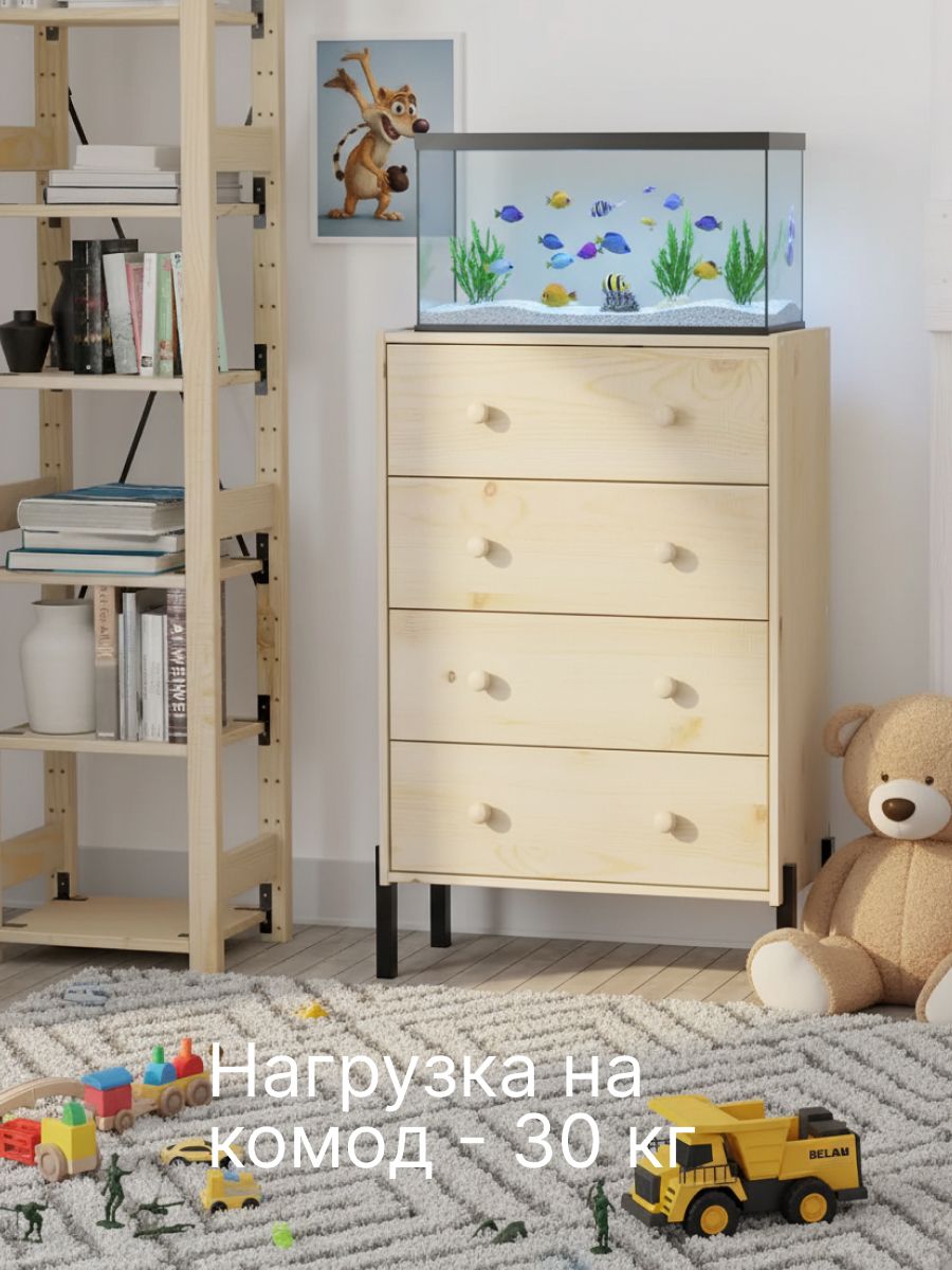 Комод идеально подходит для организации пространства. Данный комод с 4 просторными ящиками можно оставить в натуральной цветовой гамме дерева. Каждый ящик можно использовать для хранения разных категорий вещей: верхние - для аксессуаров, средние - для верхней одежды, а нижние - для домашней одежды.