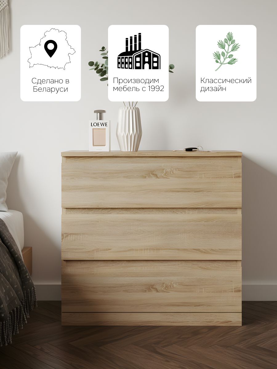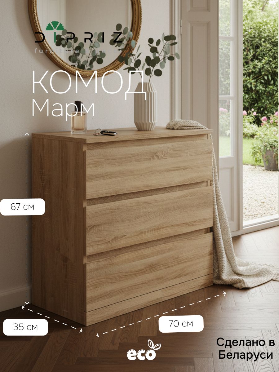 Комод изготовлен белорусским производителем "Диприз" из высококачественного ЛДСП. Для задней стенки комода и дна ящиков использовалось ДВП.