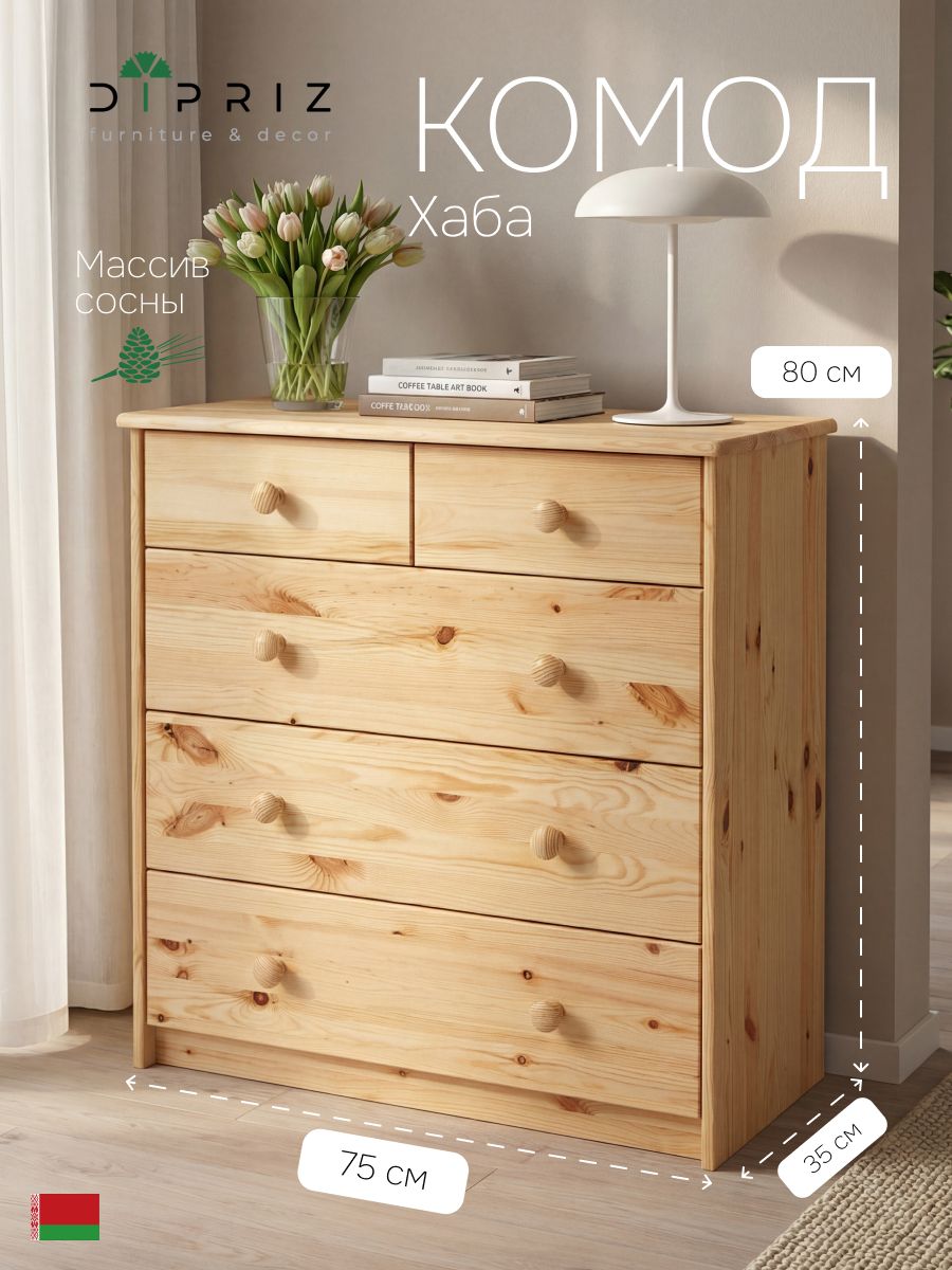 Комод "Хаба" изготовлен из натурального дерева с использованием экологически чистых отделочных материалов. Отделка комода для одежды с ящиками - лак. Поверхность комод массив, покрытая этим составом, обладает шелковисто-бархатным блеском, выглядит богато и приятна на ощупь. Комоды с ящиками сохраняют максимально естественный внешний вид. Главное достоинство этого вида отделки - это видимый признак благородного происхождения материала. Неоднородность текстуры сосны с богатством цветовых переливов не скрывается отделкой и подчеркивает всю красоту натурального дерева. Классический дизайн комода деревянного хорошо подойдет для помещений с многими стилями интерьера, а большое количество ящиков создаст достаточно места для хранения самых различных вещей. Комод с ящиками будет хорошо смотреться в прихожей, гостиной и спальни.Комод для вещей большой изготовлен из массива сосны, задняя стенка и низ выдвижных ящиков из ДВП Комод легко собирается. Инструкция прилагается. Гарантия - 24 месяца.