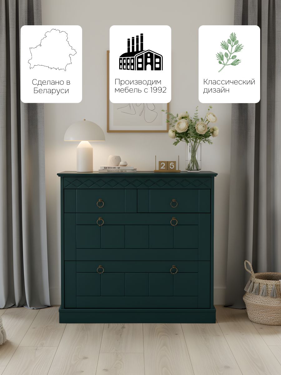 Элегантный комод в насыщенном изумрудном цвете для вашей прихожей или спальни. Классический дизайн с фрезеровками и ручками под состаренную латунь легко впишется в интерьер.