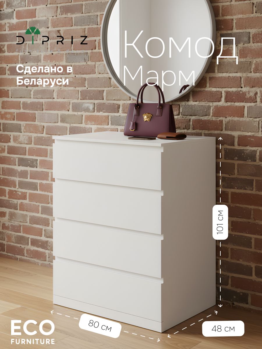 Комод «Марм» белого цвета — практичное и стильное решение для организации пространства в любом помещении вашего дома. Изготовленный белорусским производителем «Диприз» из экологичного ЛДСП высокого качества, этот комод обеспечит надежность и долговечность при ежедневном использовании. Размеры комода (ширина 80 см, высота 101 см, глубина 48 см) делают его универсальным для хранения игрушек, детских вещей, белья, одежды, косметики, книг и даже инструментов.