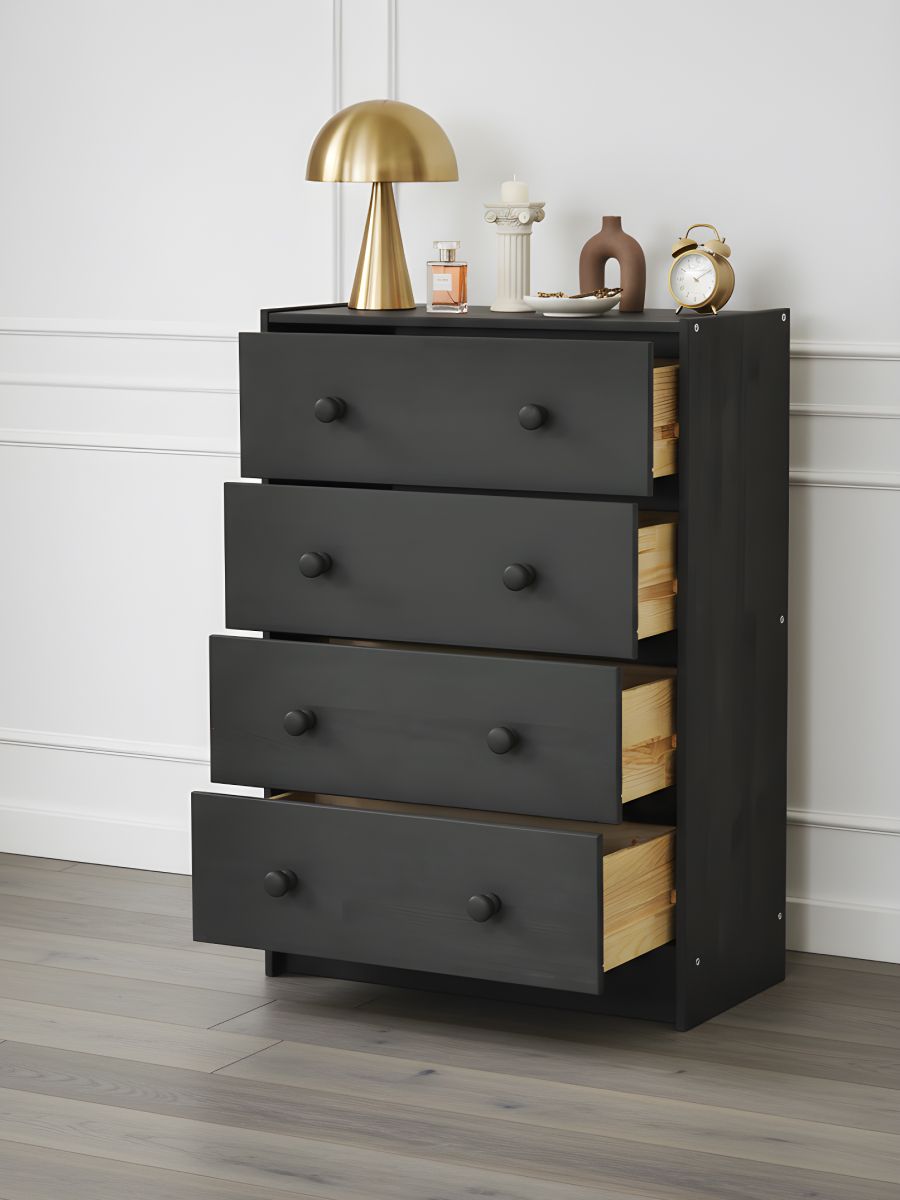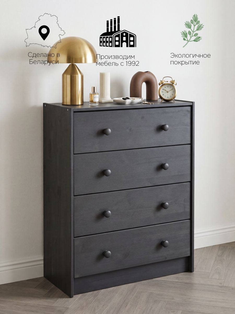 Серый комод для вещей Раст от белорусского производителя мебели изготовлен из экологически чистого материала - натурального дерева массива сосны, которое отличается высокой прочностью и долговечностью. Комод включает 4 выдвижных ящика с роликовыми направляющими.