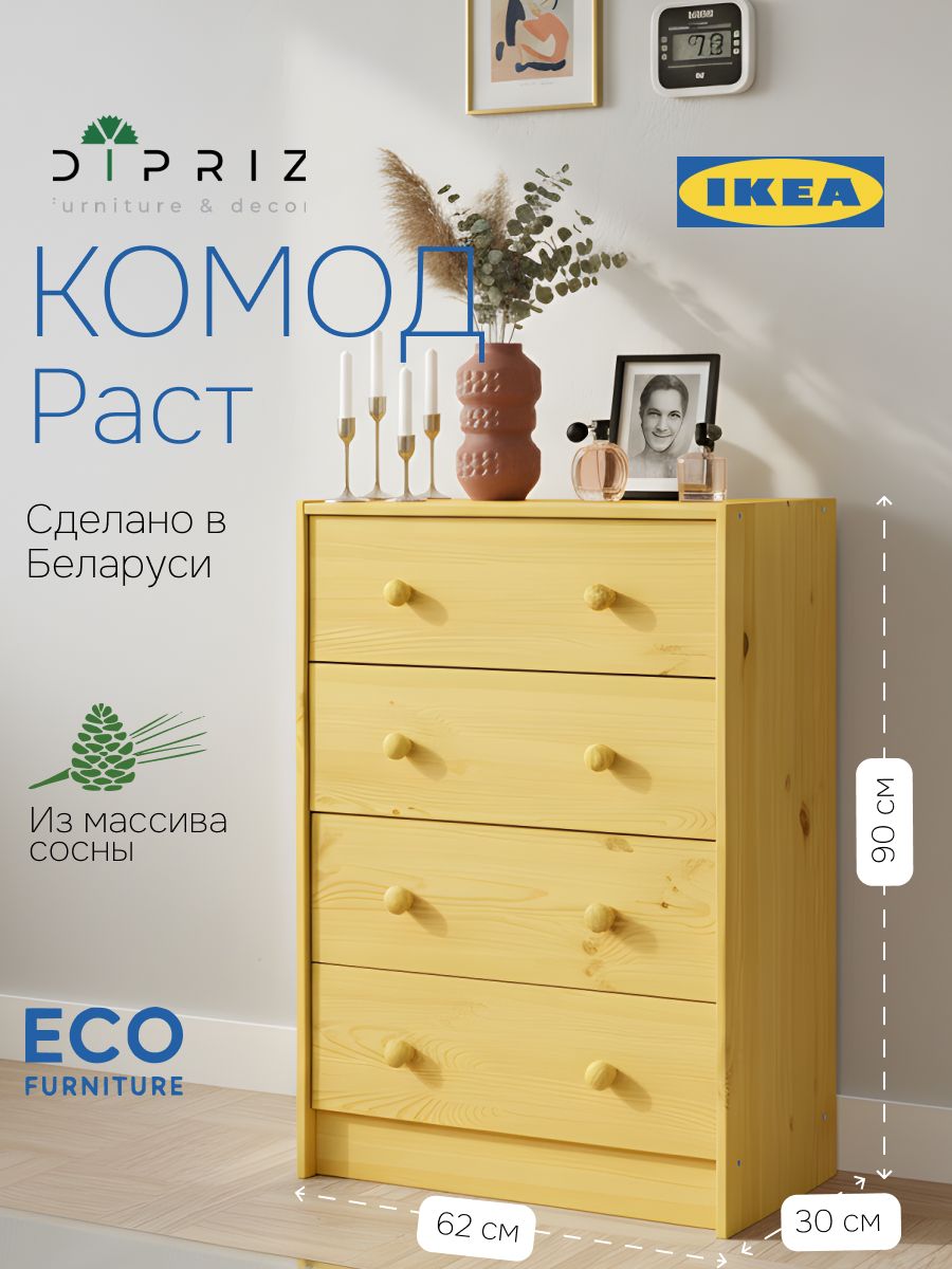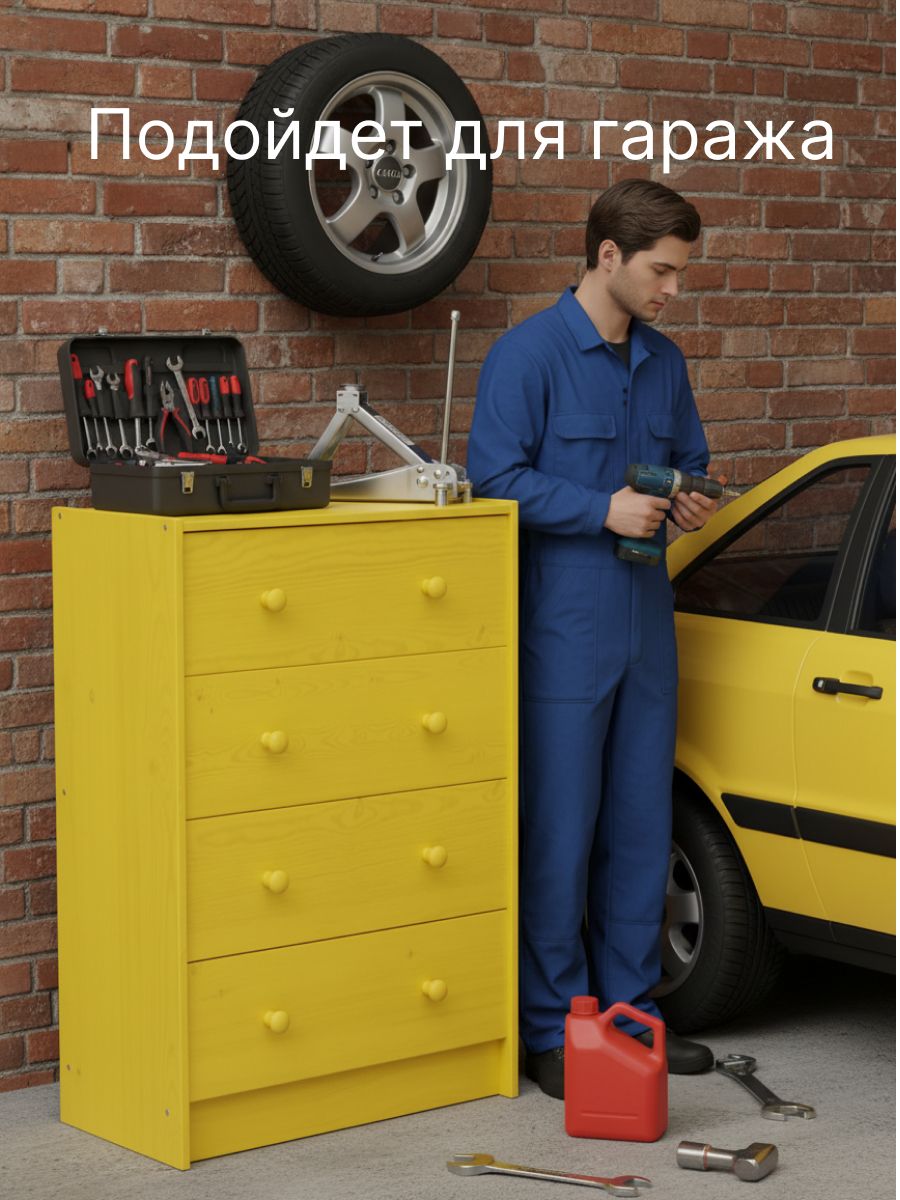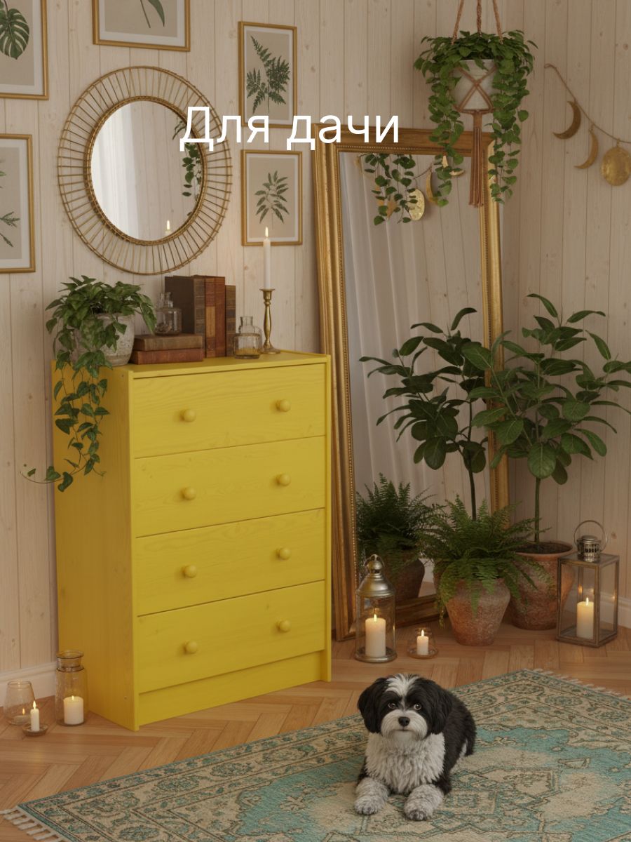 Желтый комод для вещей Раст от белорусского производителя мебели изготовлен из экологически чистого материала - натурального дерева массива сосны, которое отличается высокой прочностью и долговечностью. Комод включает 4 выдвижных ящика с роликовыми направляющими.