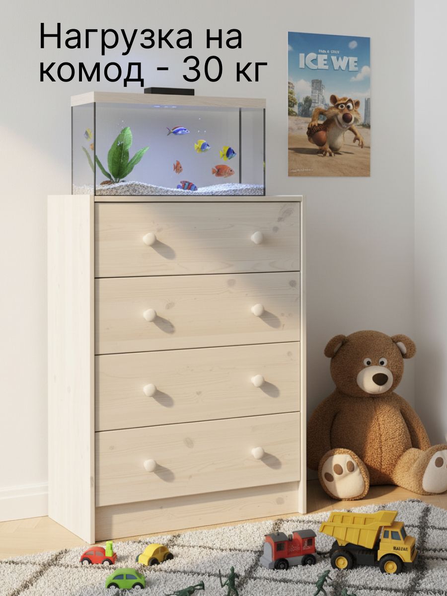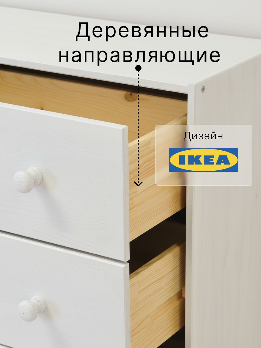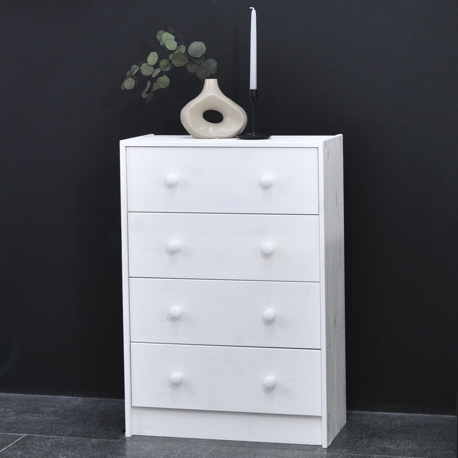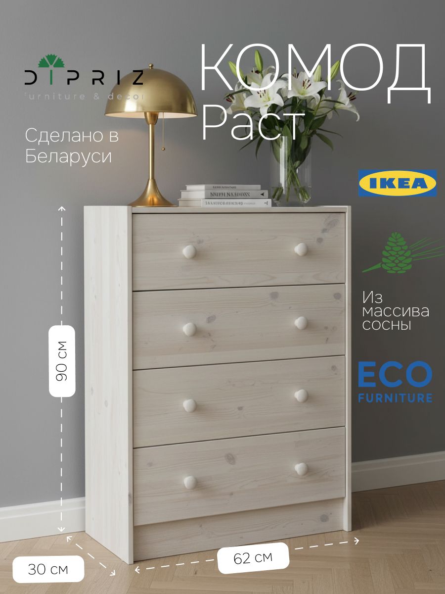 Комод белый для вещей Раст от белорусского производителя мебели изготовлен из экологически чистого материала - натурального дерева массива сосны, которое отличается высокой прочностью и долговечностью. Комод включает 4 выдвижных ящика с деревянными направляющими.