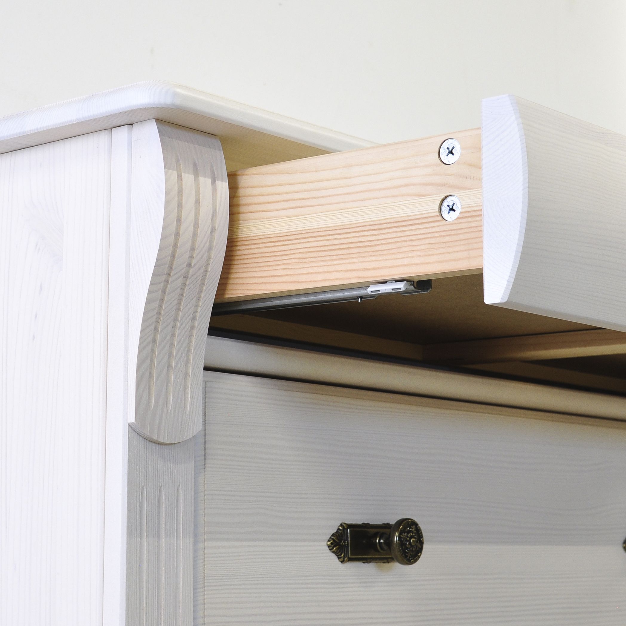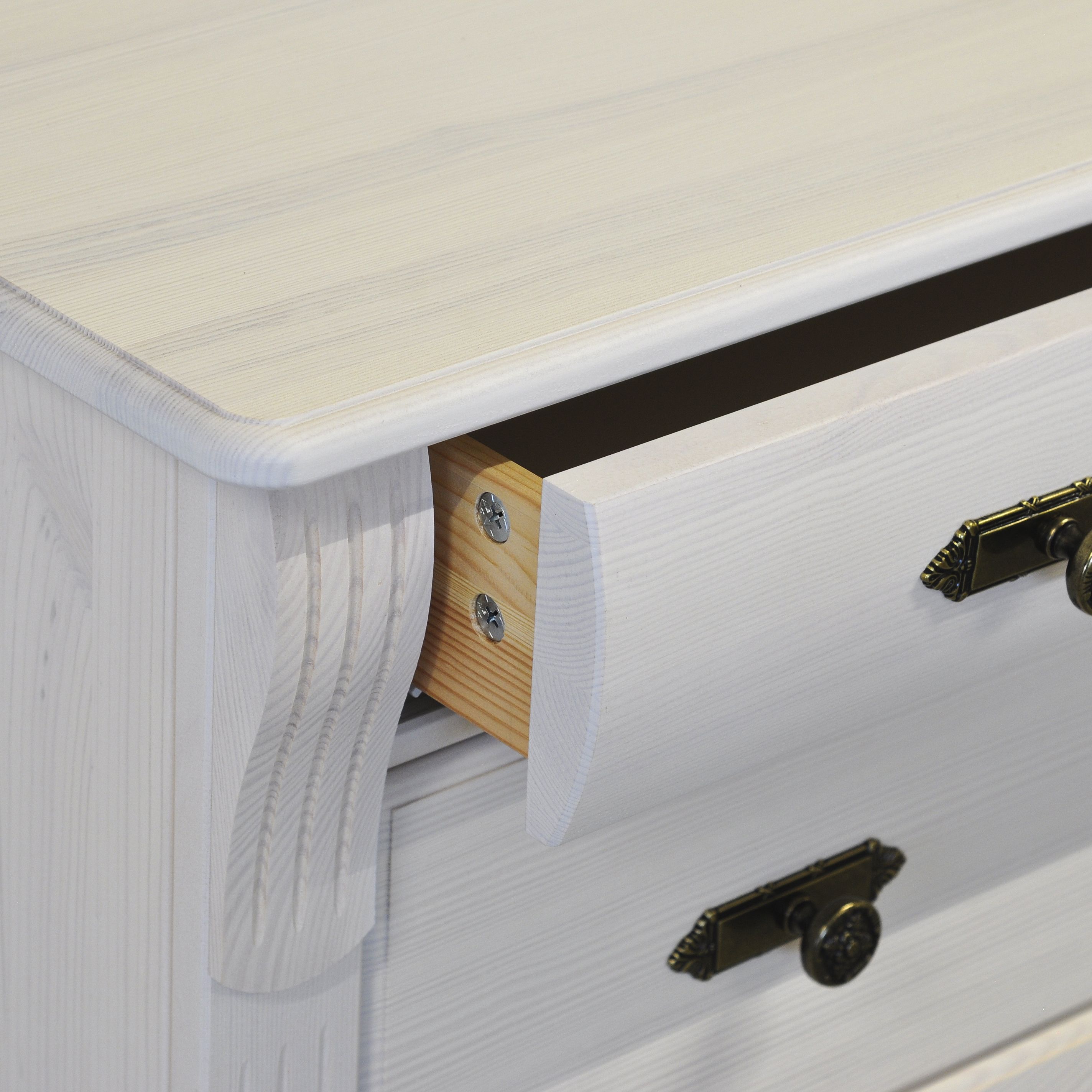 Комод Сюзанна выполнен из натурального массива сосны - экологически чистого долговечного материала. Белое покрытие воском сохраняет приятный хвойный аромат и полезные свойства дерева. Это обеспечивает не только стойкость к внешним воздействиям, но и подчеркивает естественную красоту массива дерева. Задняя стенка и дно ящиков выполнены из ДВП белого цвета для облегчения конструкции изделия. Фасад комода дополнен декоративным решением, которая добавит изысканности в ваше помещение.