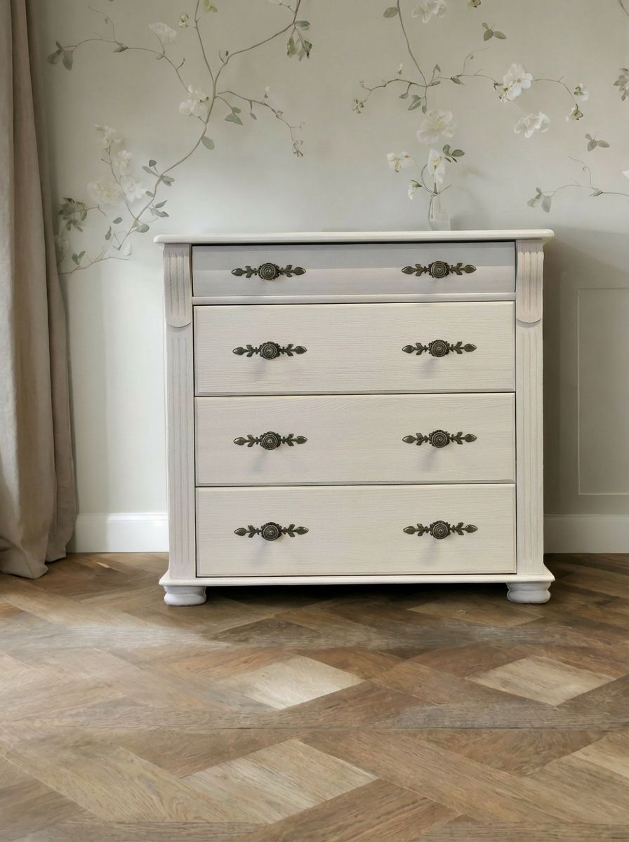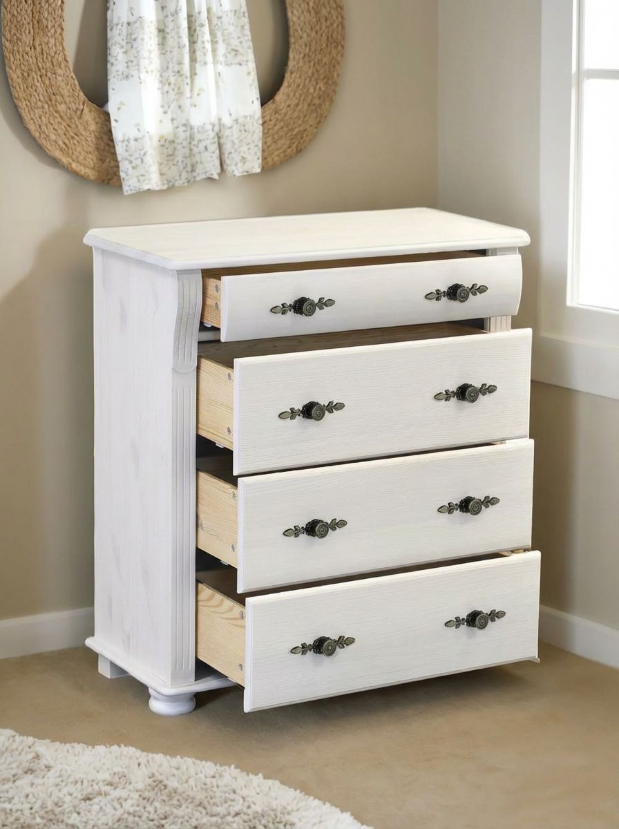 Белый комод Сюзанна с 4 ящиками привнесет нотки элегантности классического стиля и домашнего уюта в Ваше пространство.