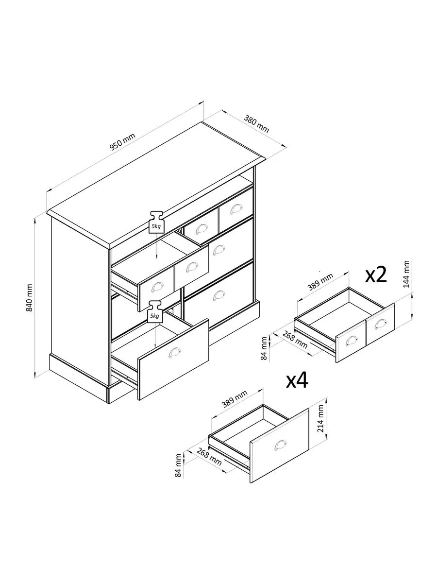 - Внутренние размеры ящиков: 268х389х84 мм