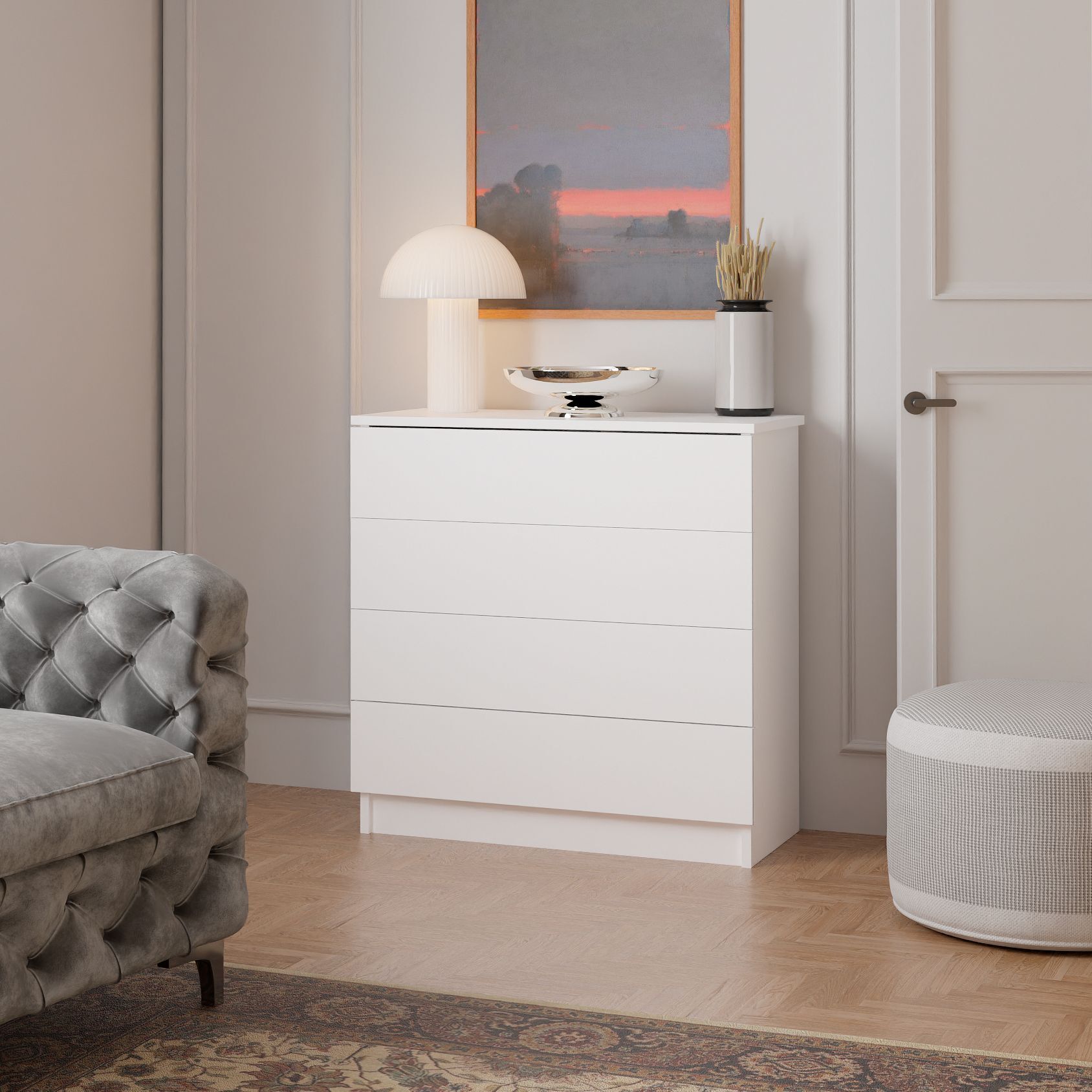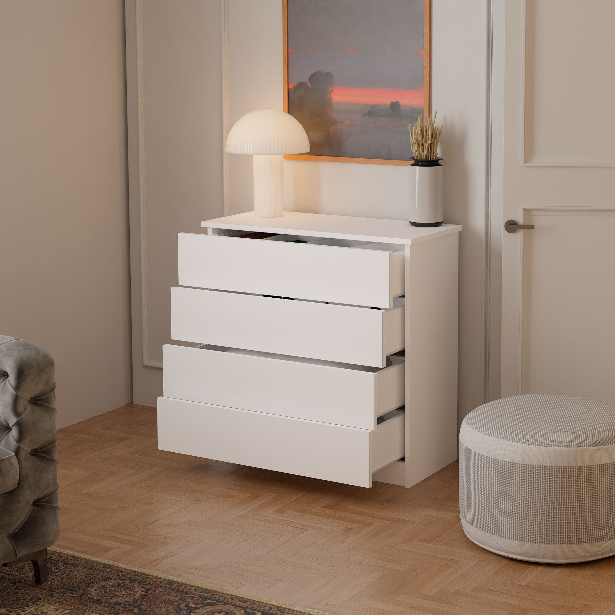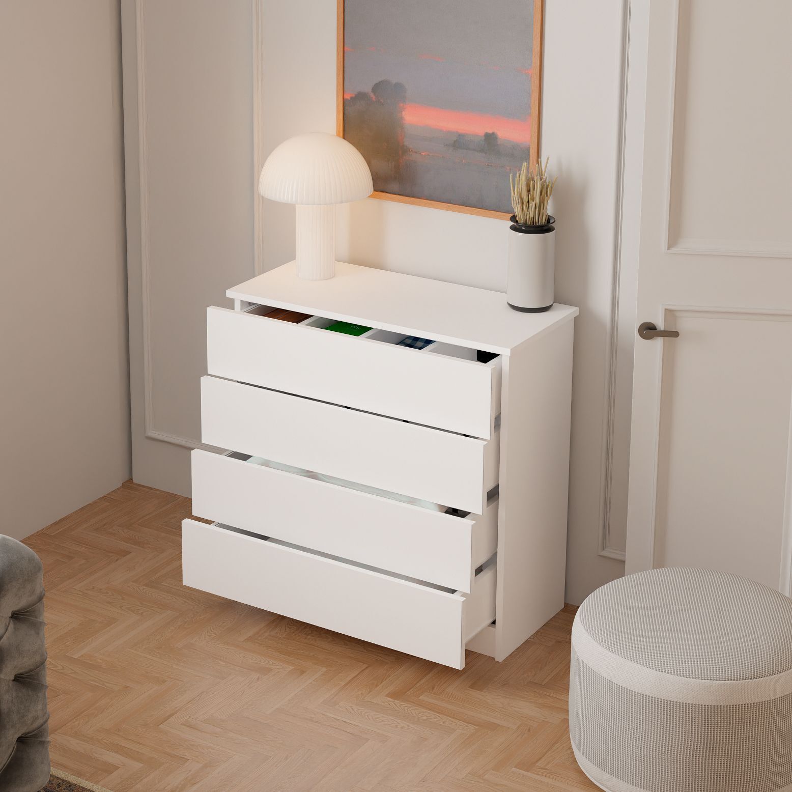 Комод Марм отлично подойдет для игрушек и детских вещей, для белья и одежды, для косметики, для книг и инструментов. Белый комод 4 ящика создаст порядок в любой комнате, будь то прихожая, спальня, гостиная, ванная или детская комната. Комод деревянный может быть использована как тумба под телевизор, особенно если совместить несколько комодов вместе.