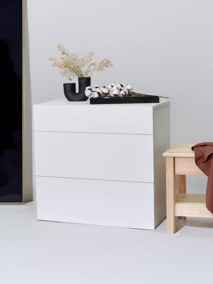 Ящики комода мальм можно использовать для хранения вещей одного типа или тематически разделить их по назначению. Например, верхние ящики использовать под носки, перчатки и шарфы, средние - под футболки и майки, нижние - под пижамы и домашнюю одежду. В комплекте с белым комодом для одежды дополнительно поставляется органайзер для хранения. Комплект представляет собой 3 разделителя для верхнего ящика и 2 разделителя для нижних ящиков, которые можно установить внутри выдвижного ящика при сборке в нужном количестве. Также улучшили направляющие - теперь комод комплектуется металлическими телескопическими направляющими, которые будут плавно выдвигаться и тихо закрываться, более надежны и долговечны.
