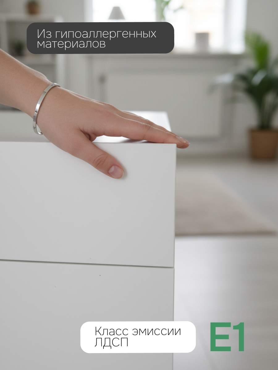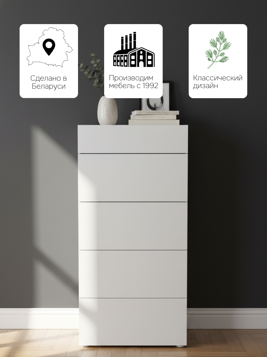 Комод белый с ящиками изготовлена белорусским производителем "Диприз" из высококачественного ЛДСП. Для задней стенки комода белого и дна ящиков использовалось ДВП белого цвета. Комод для вещей выполнено на высокоточном оборудовании, все кромки изделия обработаны ПВХ аккуратно, промышленным методом на современных станках, что обеспечивает ее плотное прилегание и прочность древесного слоя при контакте с влагой, устойчивость к влажности и деформации. Сборка комода для одежды в домашних условиях не вызовет трудностей за счет понятной инструкции по сборке и комплекта необходимой фурнитуры. Комод узкий, но в тоже время очень вместительный. Комод высокий комплектуется металлическими телескопическими направляющими, которые позволят полностью выдвигать ящик, а не на половину, как обычно устанавливаются в комодах. Ящики будут плавно выдвигаться и тихо закрываться, более надежны и долговечны. Комод Оланд белый отлично подойдет для игрушек и детских вещей, для белья и одежды, для косметики, для книг и инструментов. Комод деревянный с 3 вместительными ящиками позволит поддерживать порядок в любой комнате, будь то прихожая, спальня, гостиная, ванная или детская комната. Данная модель комода может быть использована как тумба под телевизор, особенно если совместить два комода вместе. Если повесить над комодом зеркало, выйдет отличное решение для обустройства прихожей. Расположив мебель в прихожей, вы сможете организовать хранение обуви, аксессуаров и других необходимых предметов, сохраняя порядок и чистоту в вашем входном пространстве. Деревянный комод можно использовать с письменным столом для создания удобного офиса. Если вы обустраиваете детскую комнату, наш детский комод станет прекрасным дополнением к интерьеру, чтобы получился замечательный комод для игрушек. Поставьте его в спальню, и получится хороший комод для вещей с ящиками или прикроватная тумба.