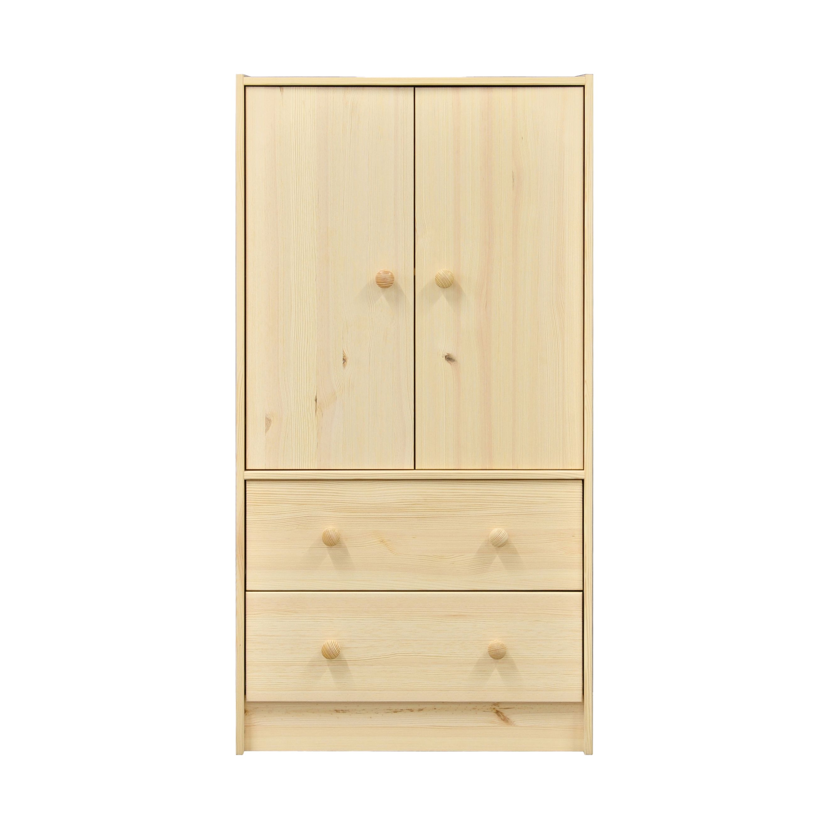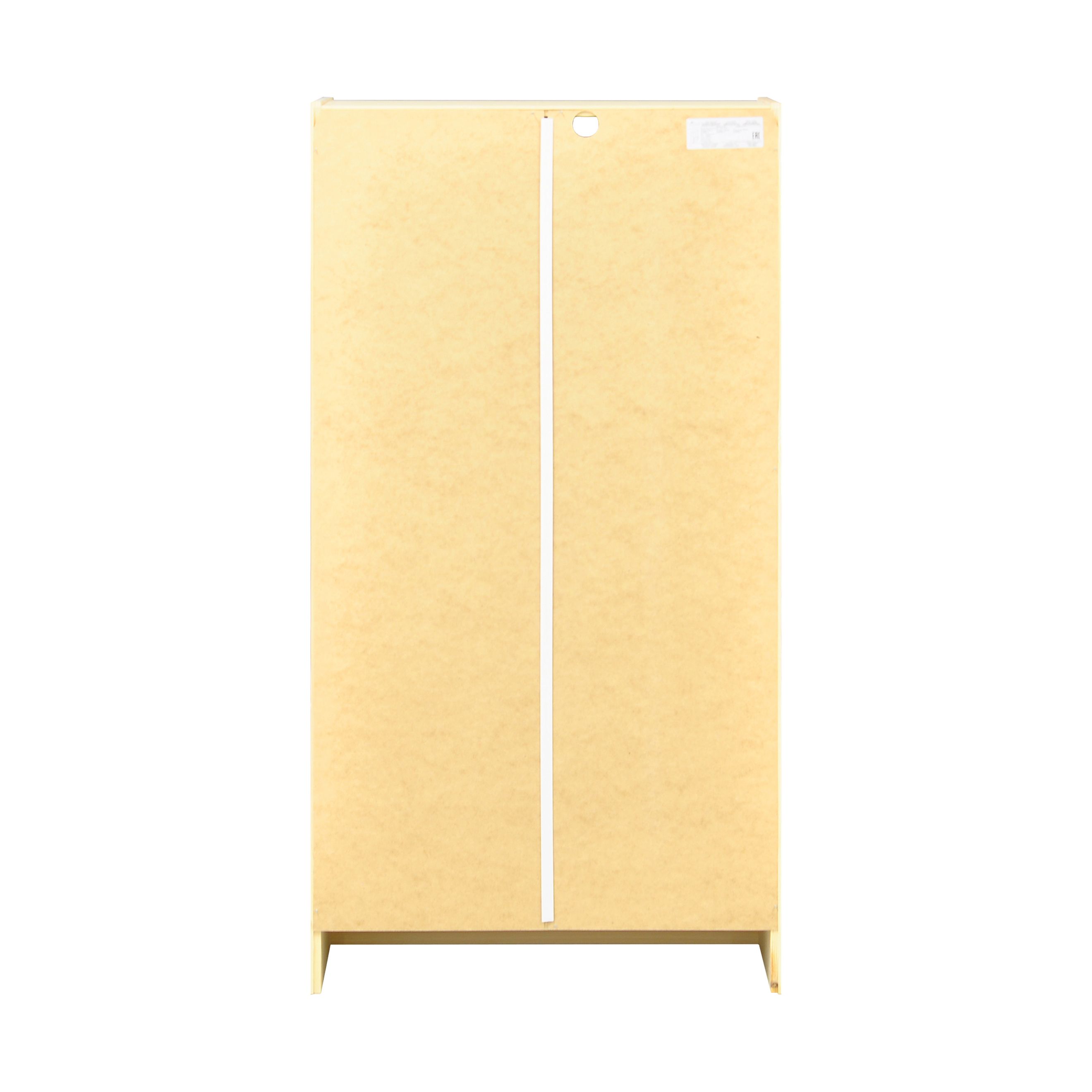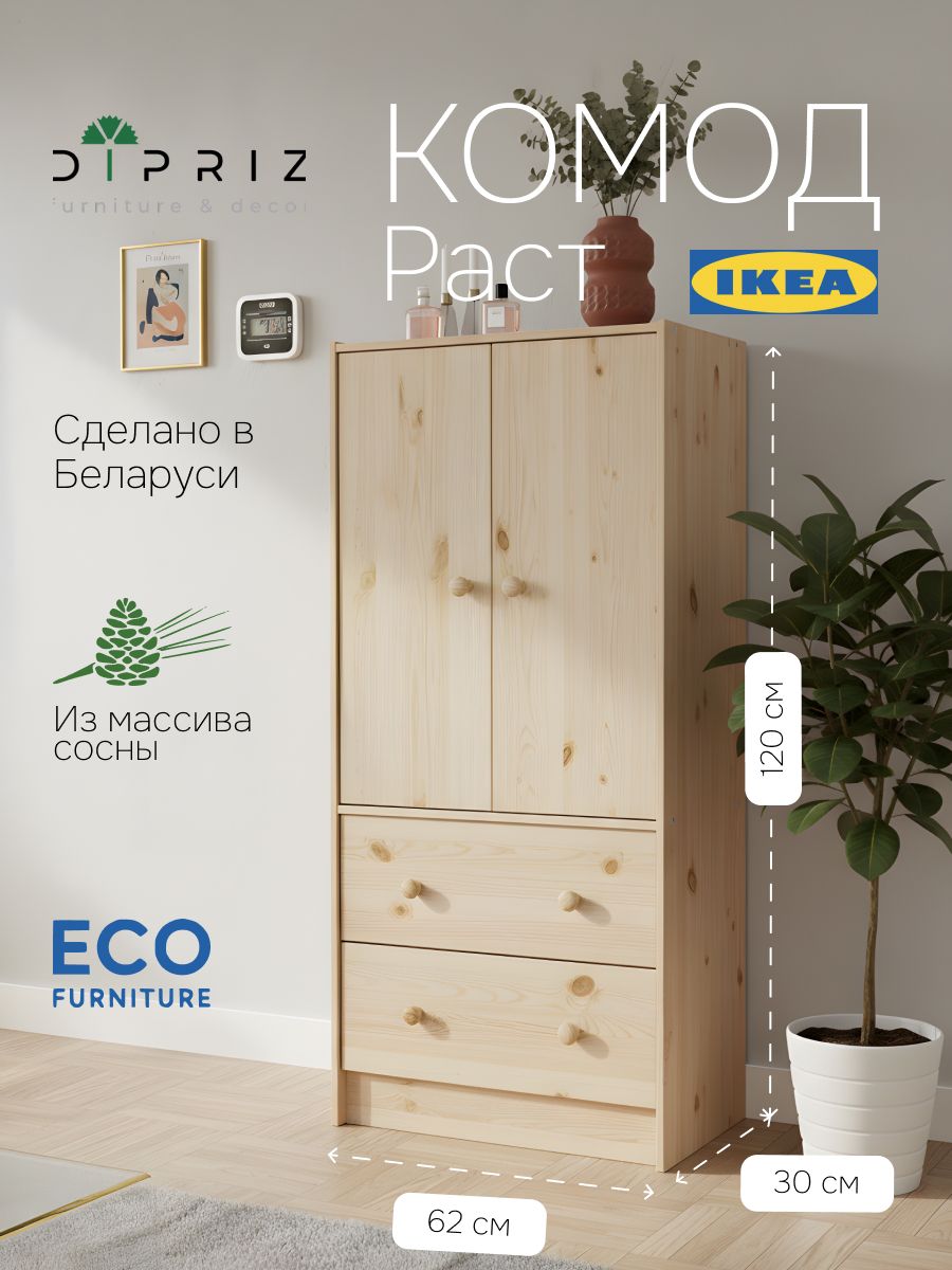 Конструкция комода включает в себя 2 распашные двери с ручками-кнопками, 2 выдвижных ящика на деревянных направляющих с разделителями внутри ящика, 1 съемную полку за дверцами с регулировкой по высоте в нескольких положениях. Габариты комода в собранном виде (Ширина х Глубина х Высота, см) составляют: 62х30х120 см. Внутренние размеры ящика - 54х25х19 см. Комод легко собирается благодаря подробной инструкции и полному комплекту фурнитуры, которые идут вместе с изделием.