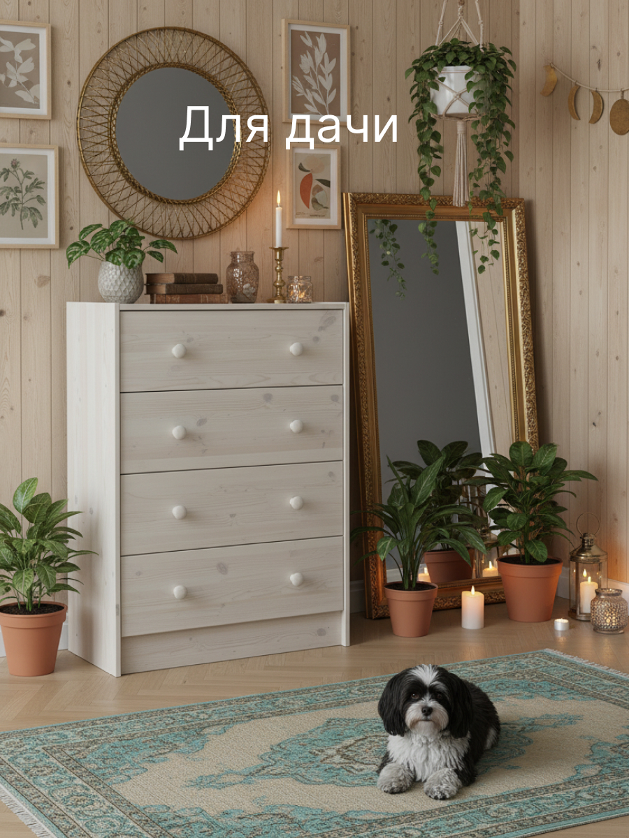 Деревянный комод для вещей производится без отделки, благодаря чему Вы сами можете выбрать желаемый цвет отделки для своего изделия, будь то белый, черный, серый, зеленый или любой другой цвет. Комод с 4 ящиками можно оставить и без покраски в натуральном цвете дерева. Все поверхности уже прошлифованы и готовы к эксплуатации. Комод легко собирается. Дополнительно можно заменить ручки, чтобы еще больше изменить внешний вид изделия. Благодаря своему компактному дизайну его легко превратить в широкий комод, поставив несколько комодов вместе. Из нескольких комодов можно получить вместительный комод для вещей под телевизор. Комод Раст идеально подойдет для творческих людей, которые желают создать уникальный дизайн своего дома.