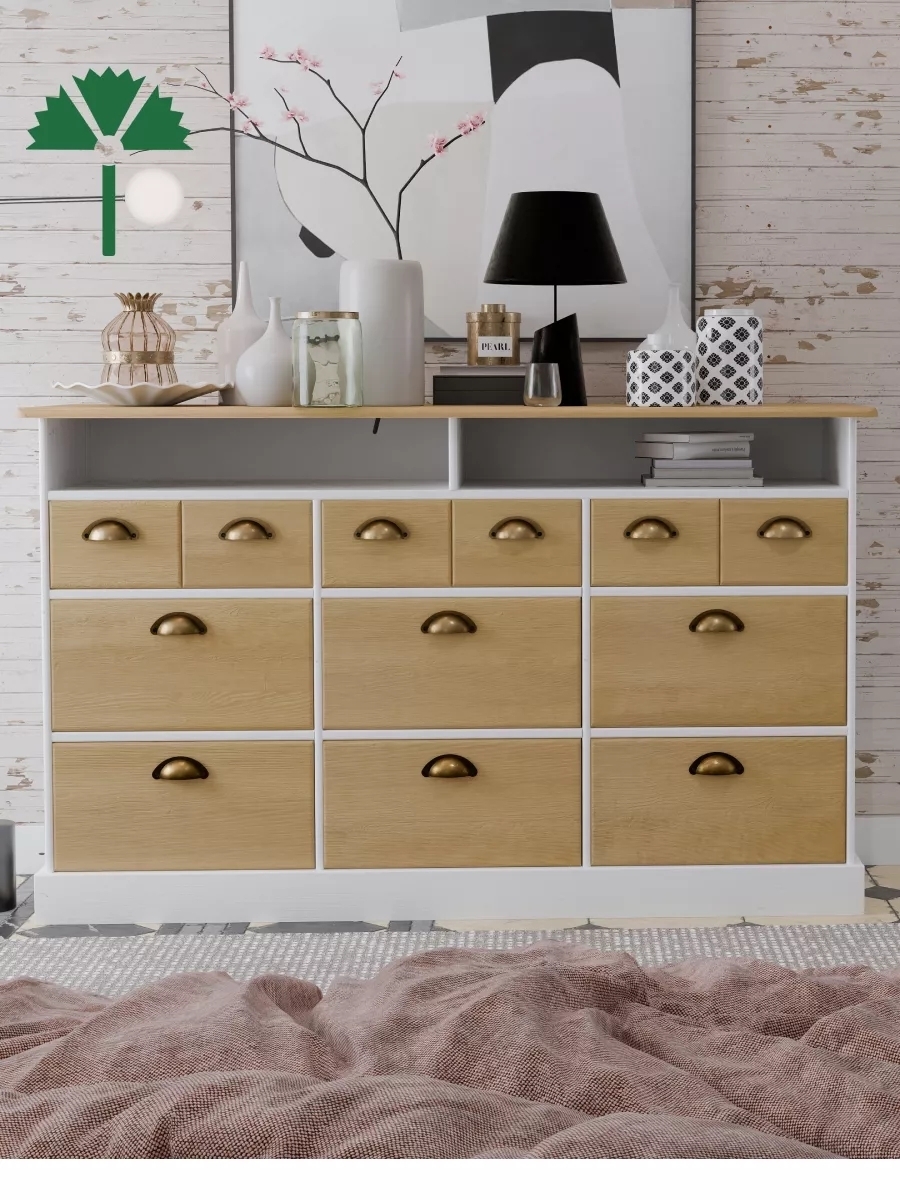 - Разноразмерные ящики: В комоде представлены два типа ящиков: 3 неглубоких для мелких предметов и 6 глубоких для более крупных вещей, что обеспечивает удобную организацию хранения. В глубоких ящиках удобно хранить одежду и текстиль, что делает комод удобным в применении в качестве шкафа комода в спальне.