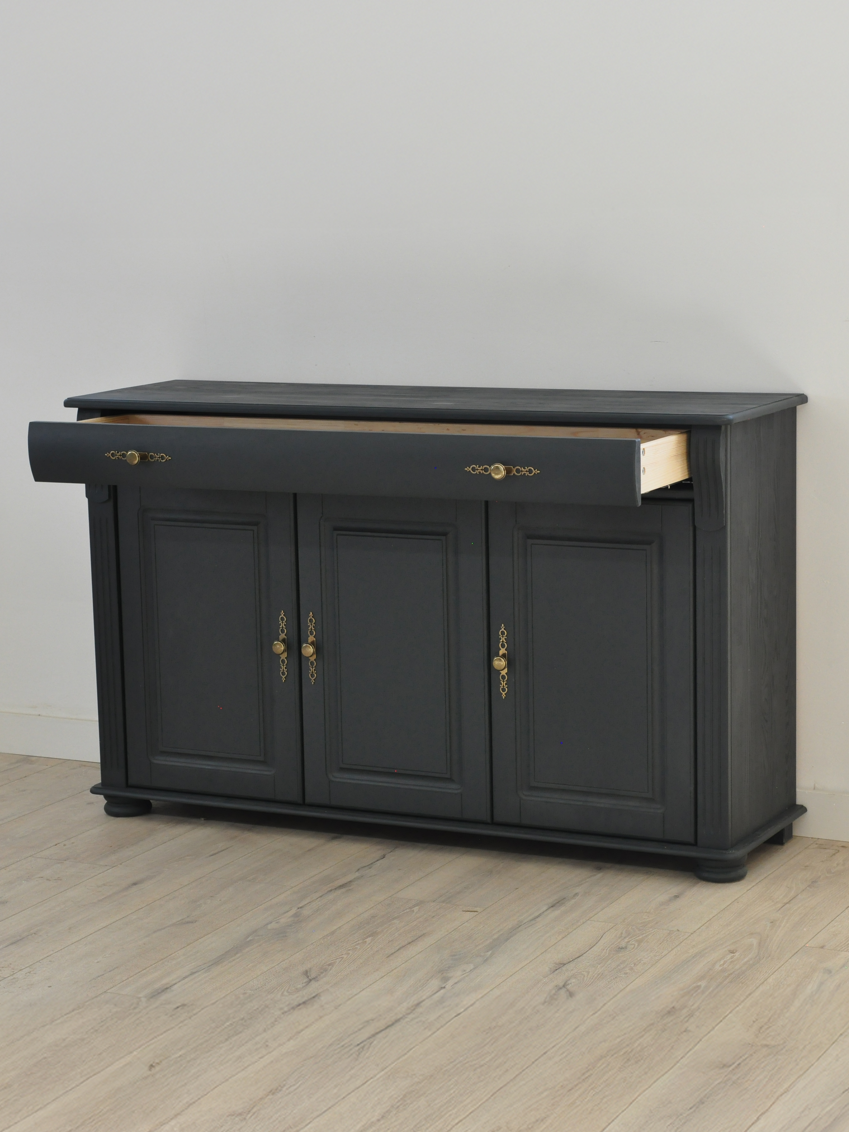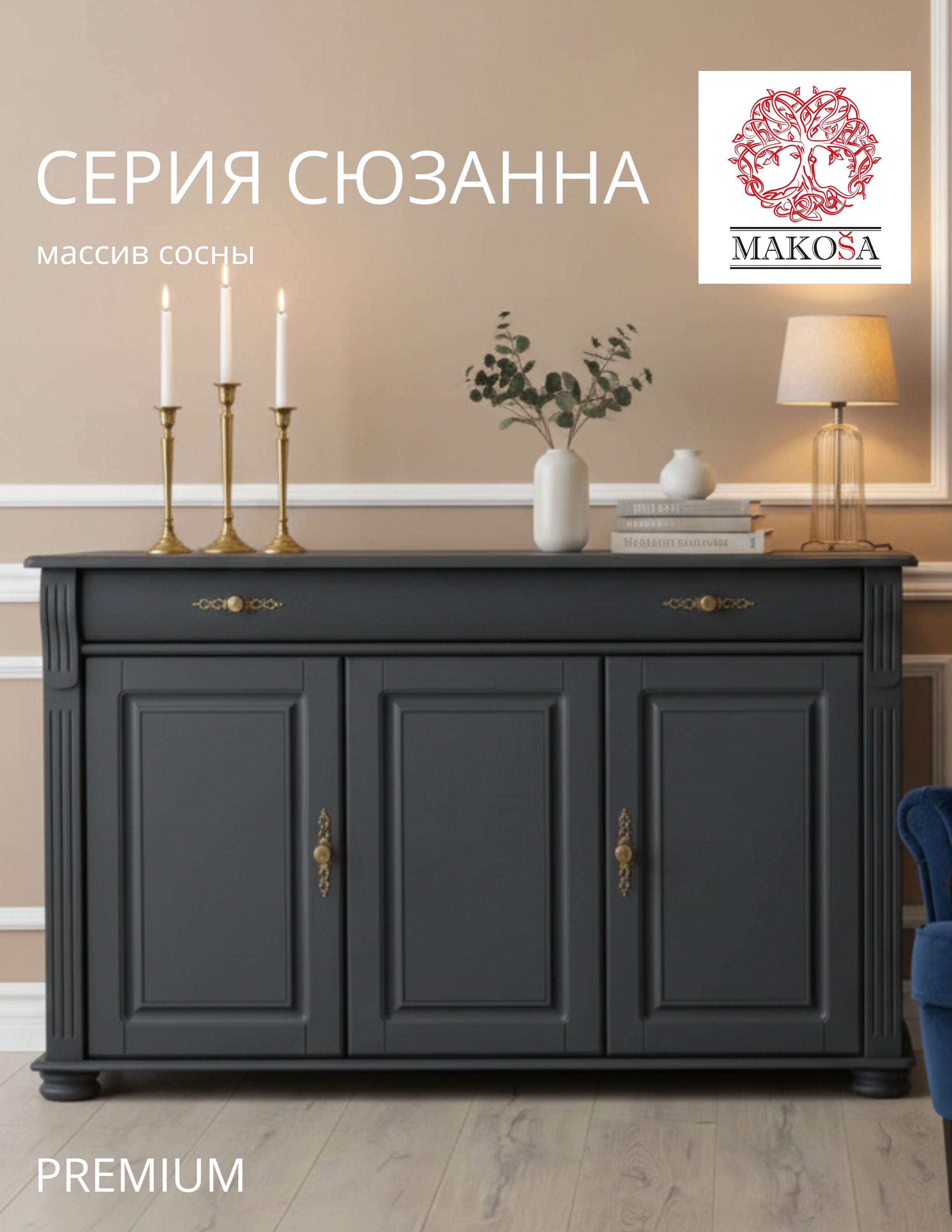 Добавьте элегантности и уюта в ваш интерьер с комодом "Сюзанна"! Изготовленный из натурального массива сосны, этот комод сочетает в себе классический дизайн и практичность. Скандинавский серый цвет и изящные латунные ручки с декоративными элементами придают ему утонченный винтажный шарм, который идеально впишется в спальню, гостиную или прихожую.
