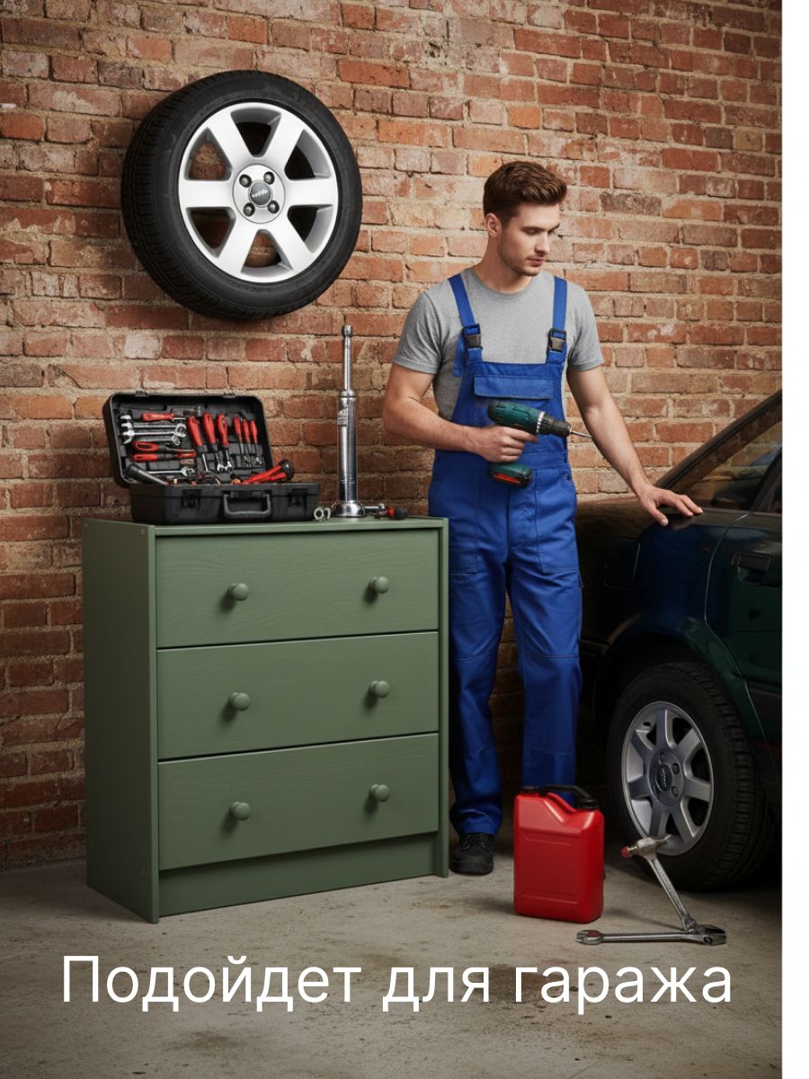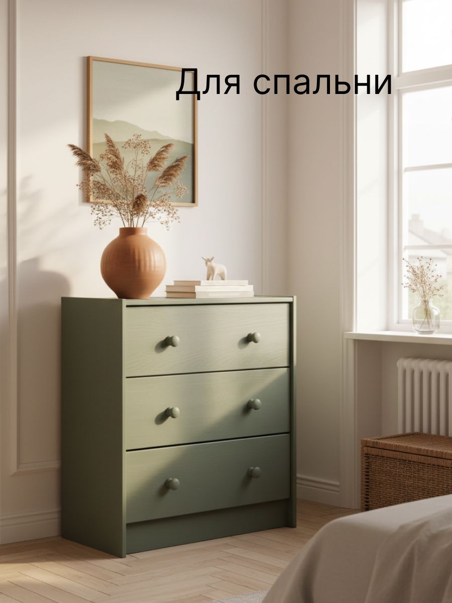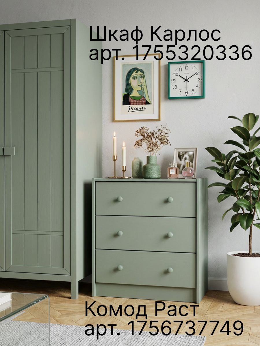 В качестве отделки комода для вещей используется бейц эвкалиптового цвета. Покрытие - экологичное и стильное, подойдет для современных интерьеров. Большой комод легко собирается. Дополнительно можно заменить ручки, чтобы еще больше преобразовать внешний вид изделия. Благодаря своему компактному дизайну его легко превратить в широкий комод, поставив несколько комодов вместе. Из нескольких комодов можно получить вместительный комод для вещей под телевизор. Зеленый комод для одежды Раст идеально подойдет для творческих людей, которые желают создать уникальный дизайн своего дома.