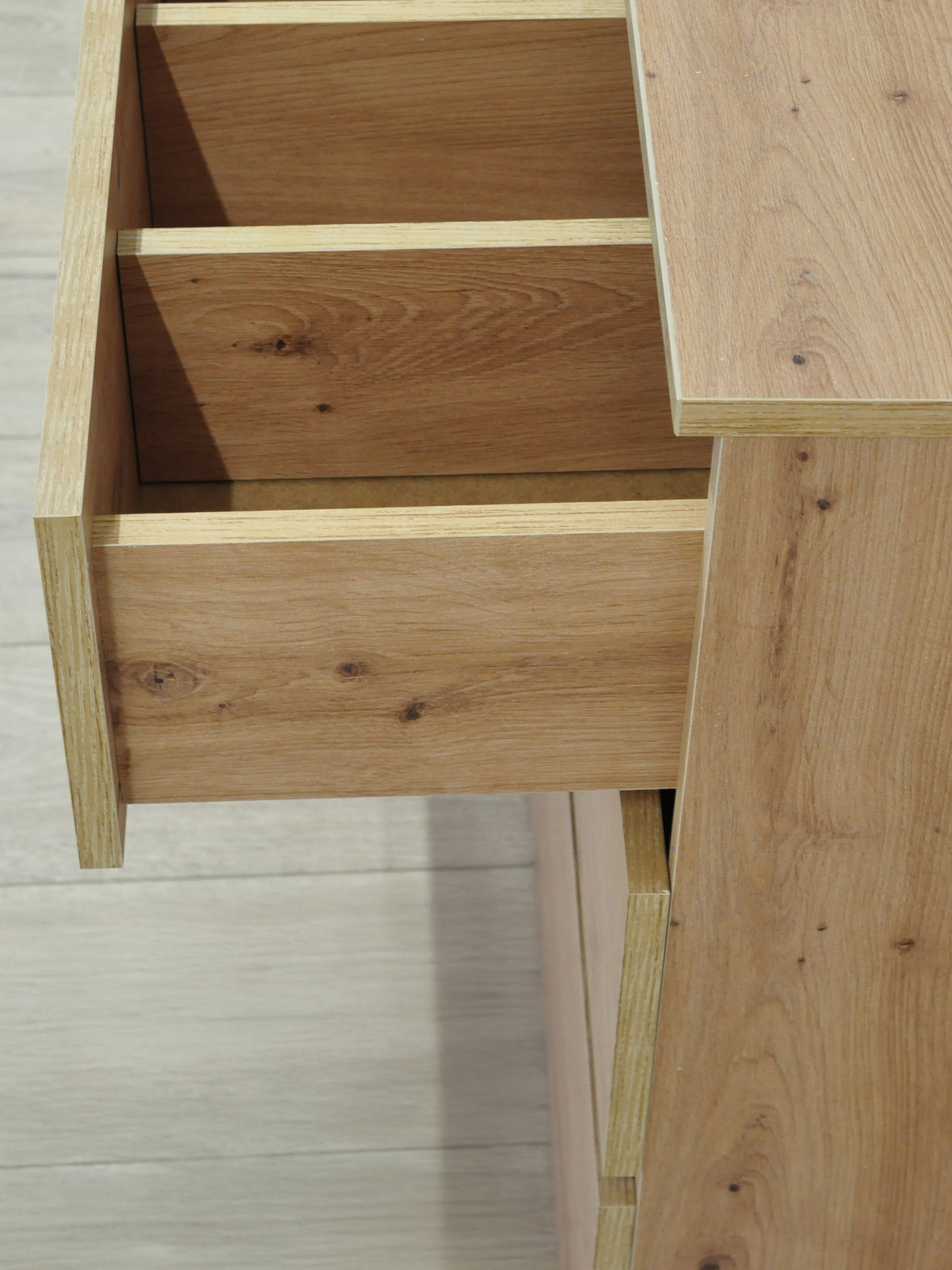 Комод для одежды в цвете артизан изготовлен из высококачественного ЛДСП (содержание формальдегида в плите соответствует классу Е1 - не превышает 10 мг на 100 г плиты), что позволяет безопасно использовать комод даже в детской. Для задней стенки комода и дна ящиков использовалось ДВП. Деревянный комод с ящиками выполнен на высокоточном оборудовании, все кромки изделия обработаны промышленным методом на современных станках, что обеспечивает ее плотное прилегание и прочность древесного слоя при контакте с влагой, устойчивость к влажности и деформации.