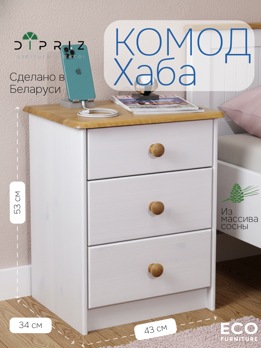 Комод "HABA" с тремя ящиками — это компактный и функциональный предмет мебели, который станет идеальным дополнением интерьера в скандинавском или классическом стиле. Выполненный из натурального массива сосны и покрытый белым воском, он сочетает экологичность и стиль, благодаря чему отлично впишется в прихожую, гостиную или спальню. Натуральные оттенки столешницы и ручек подчеркивают природную красоту дерева и создают уютную атмосферу.