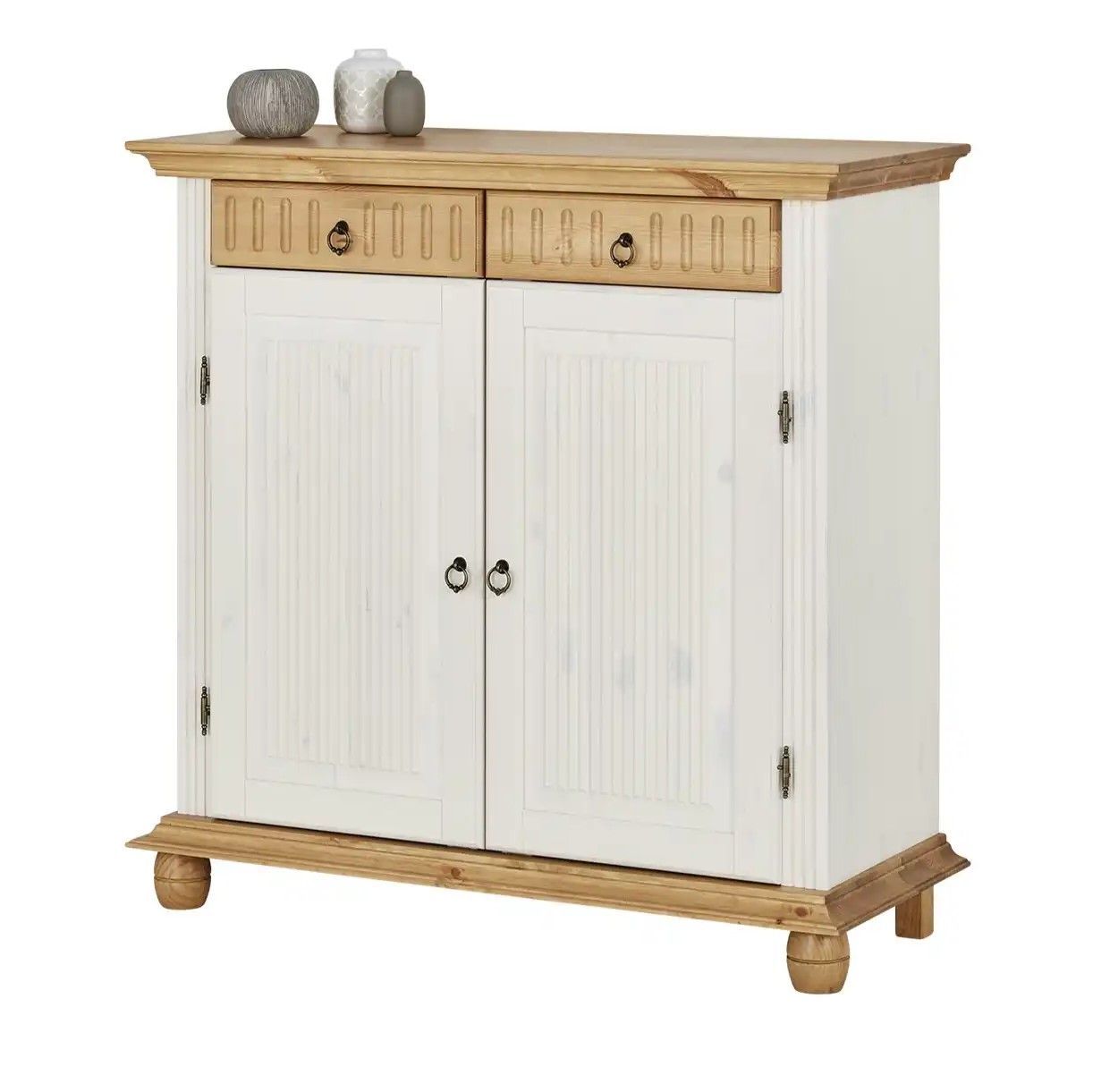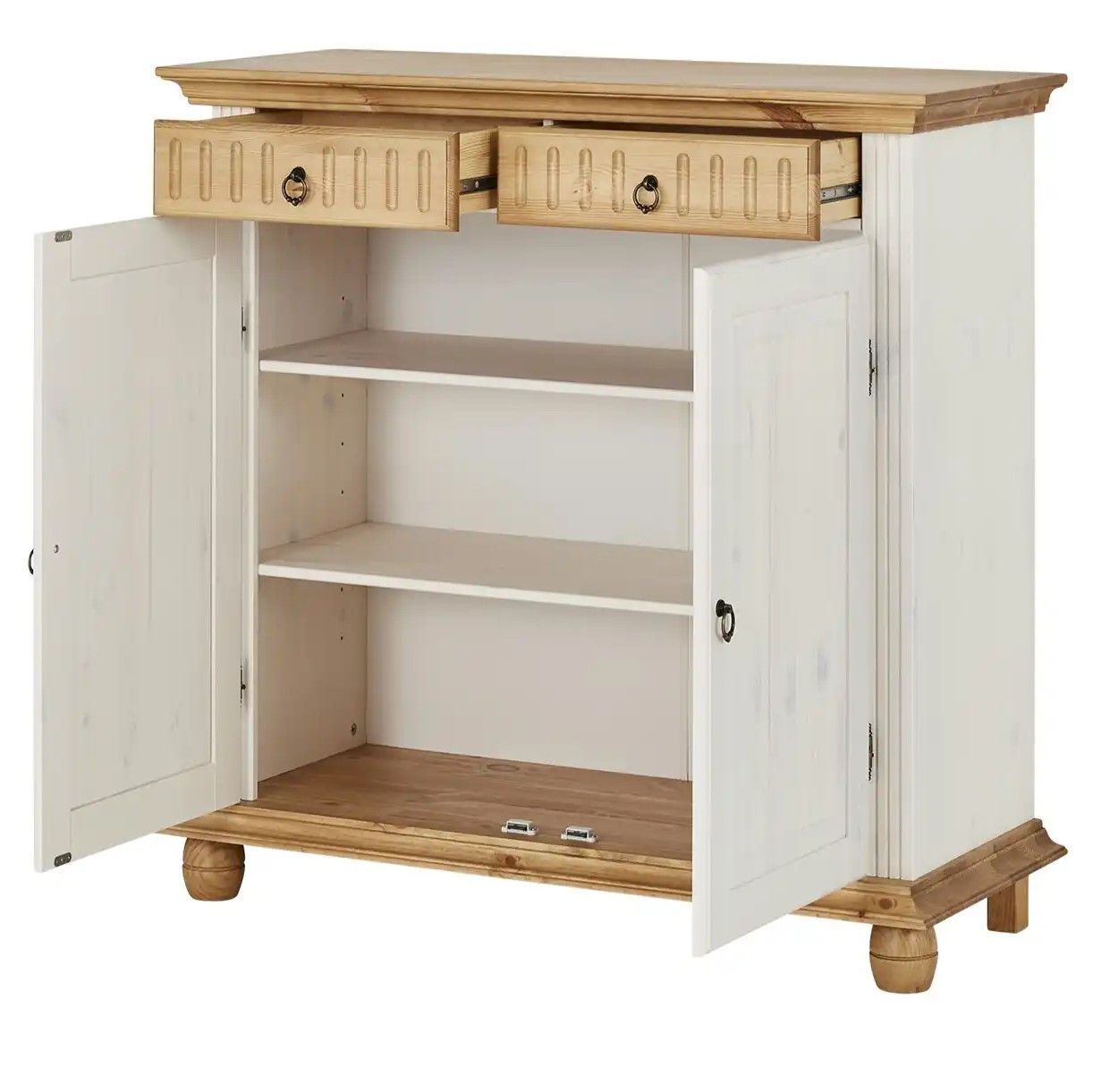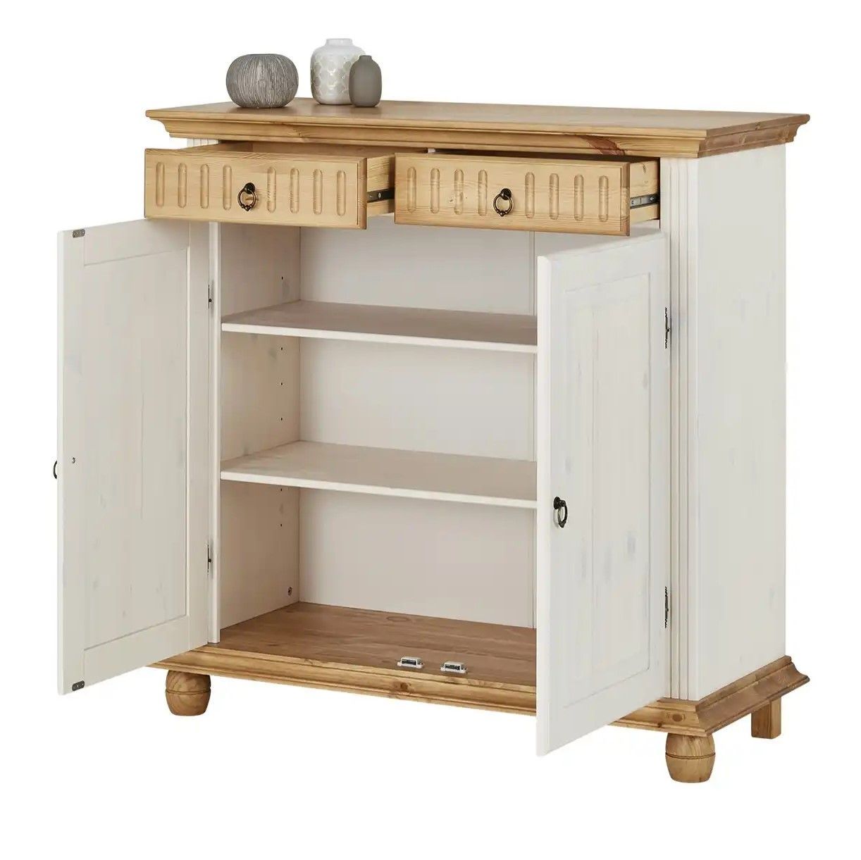 Обувница для прихожей оснащена двумя выдвижными ящиками на шариковых направляющих и двумя распашными дверцами, за которыми располагаются две полки для обуви, предназначенные для размещения до 12 пар обуви. Благодаря удобным мебельным металлическим ручкам Stavanger и уголку для крепления к стене, белый комод обеспечивает не только функциональность, но и безопасность. Его деревянные вставки в цвете антик, декоративная филенка и фрезеровка придают ему изысканный вид, который привлекает взгляд.