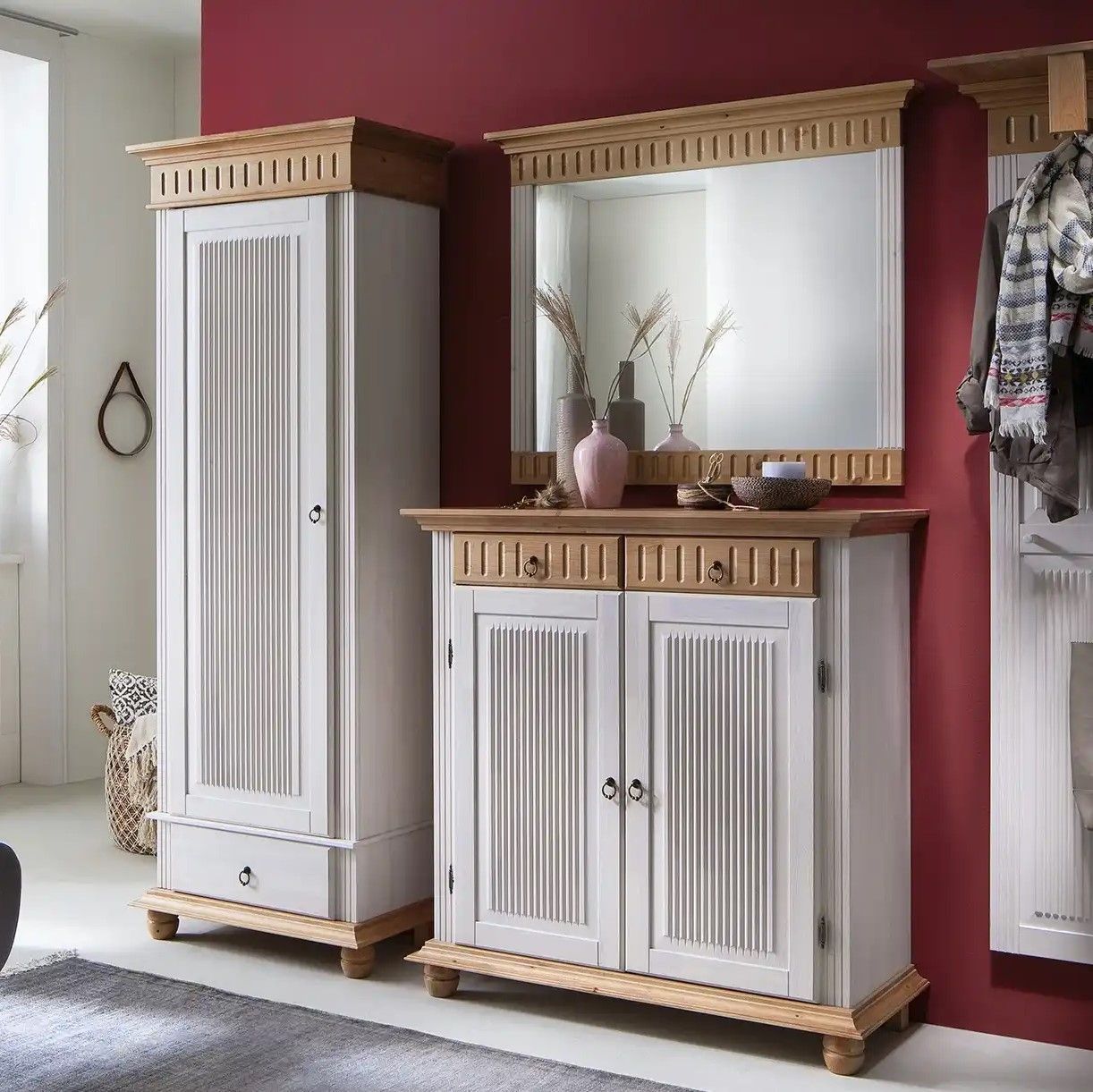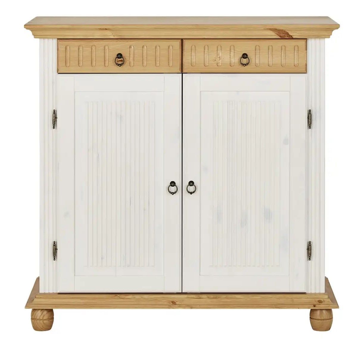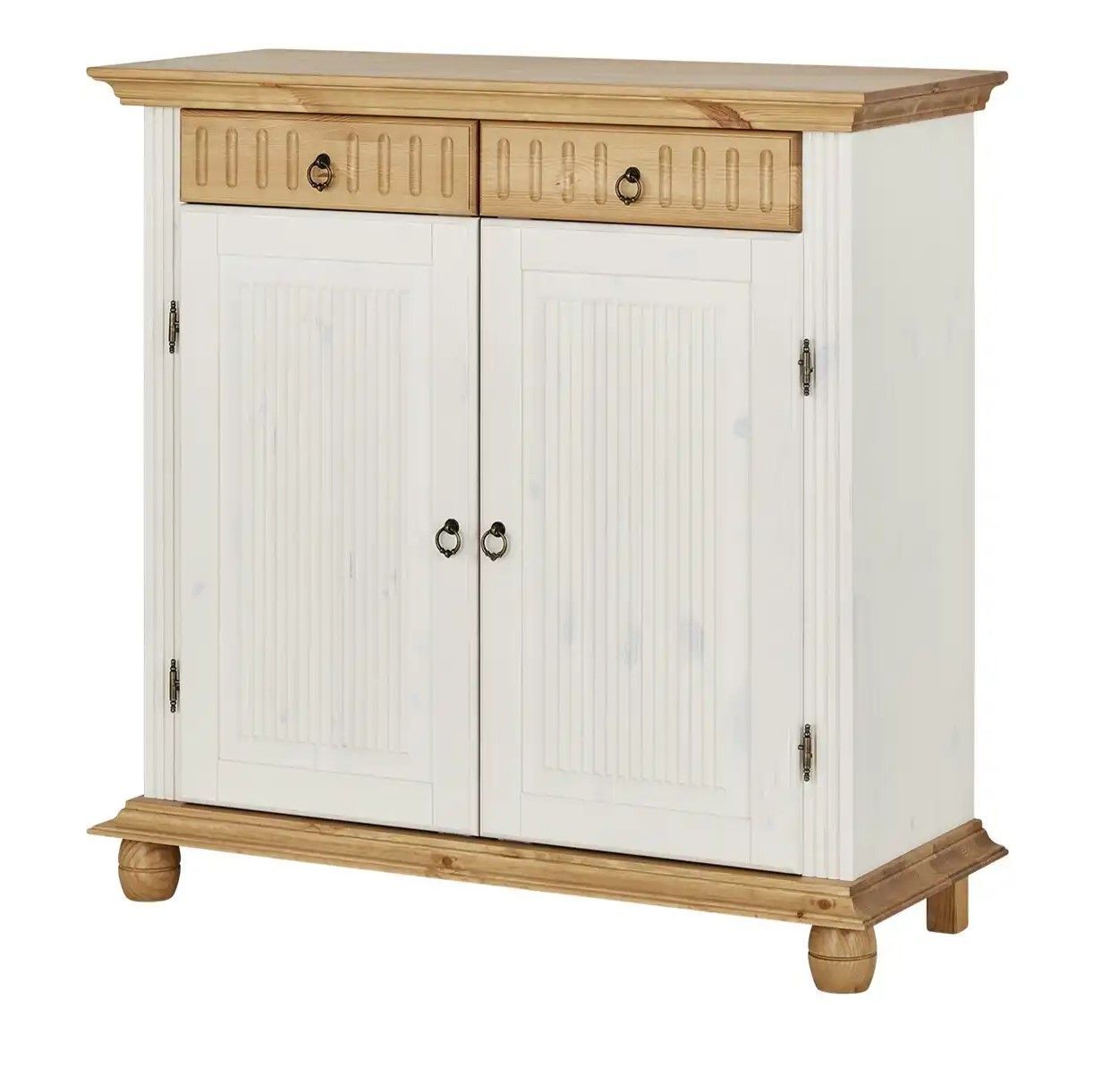 Обувница для прихожей оснащена двумя выдвижными ящиками на шариковых направляющих и двумя распашными дверцами, за которыми располагаются две полки для обуви, предназначенные для размещения до 12 пар обуви. Благодаря удобным мебельным металлическим ручкам Stavanger и уголку для крепления к стене, белый комод обеспечивает не только функциональность, но и безопасность. Его деревянные вставки в цвете антик, декоративная филенка и фрезеровка придают ему изысканный вид, который привлекает взгляд.