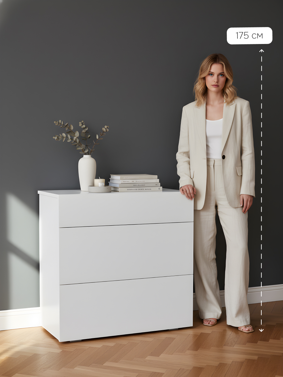Комод Оланд отлично подойдет для игрушек и детских вещей, для белья и одежды, для косметики, для книг и инструментов. Белый комод 3 ящика создаст порядок в любой комнате, будь то прихожая, спальня, гостиная, ванная или детская комната. Данная модель комода может быть использована как тумба под телевизор, особенно если совместить два комода вместе.