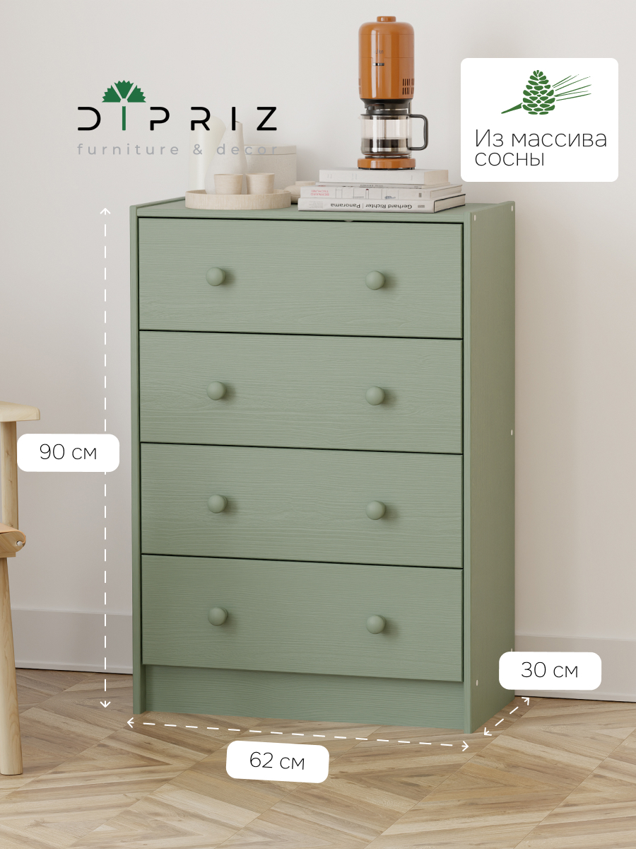 В качестве отделки комода для вещей используется бейц эвкалиптового цвета. Покрытие - экологичное и стильное, подойдет для современных интерьеров. Большой комод легко собирается. Дополнительно можно заменить ручки, чтобы еще больше преобразовать внешний вид изделия. Благодаря своему компактному дизайну его легко превратить в широкий комод, поставив несколько комодов вместе. Из нескольких комодов можно получить вместительный комод для вещей под телевизор. Зеленый комод для одежды Раст идеально подойдет для творческих людей, которые желают создать уникальный дизайн своего дома.