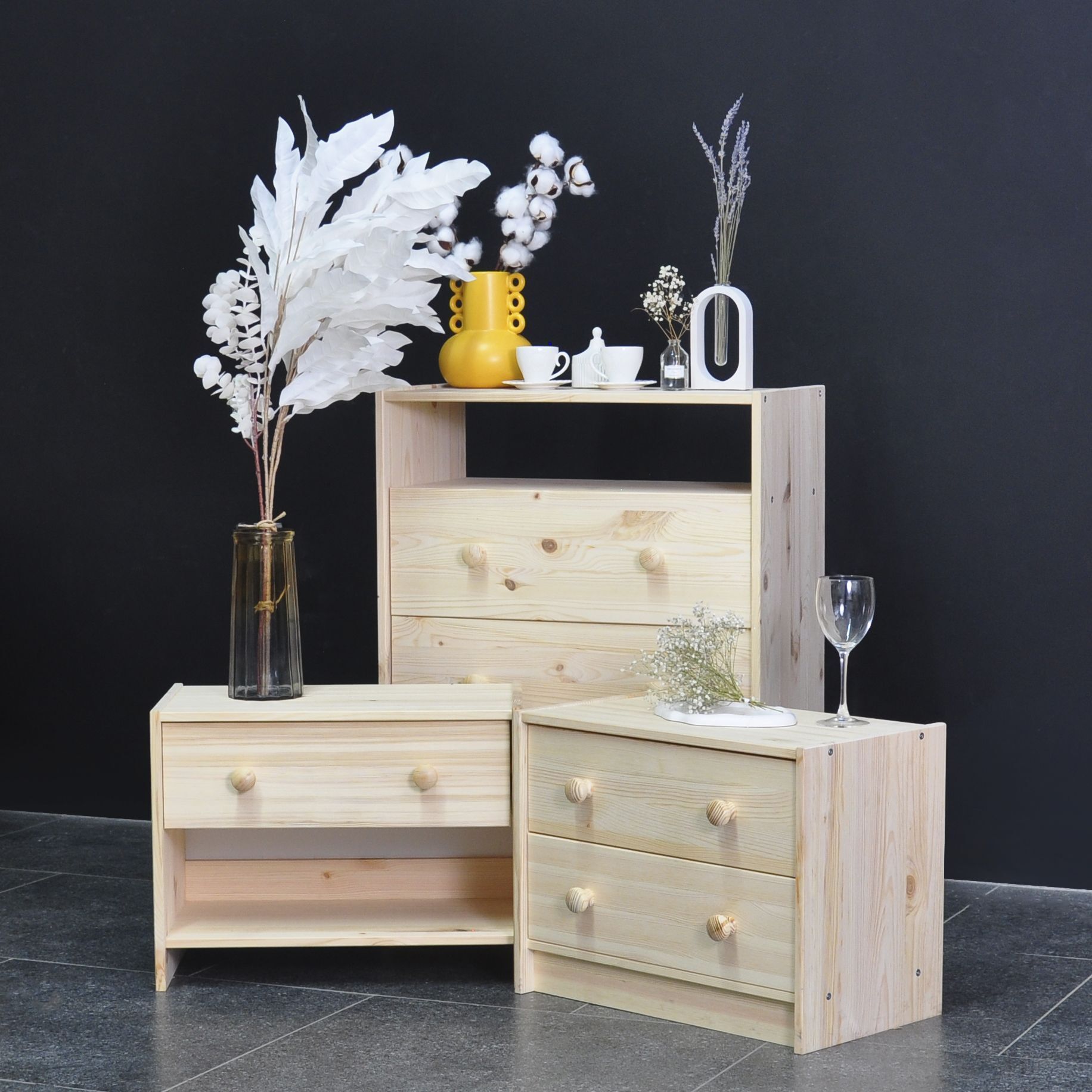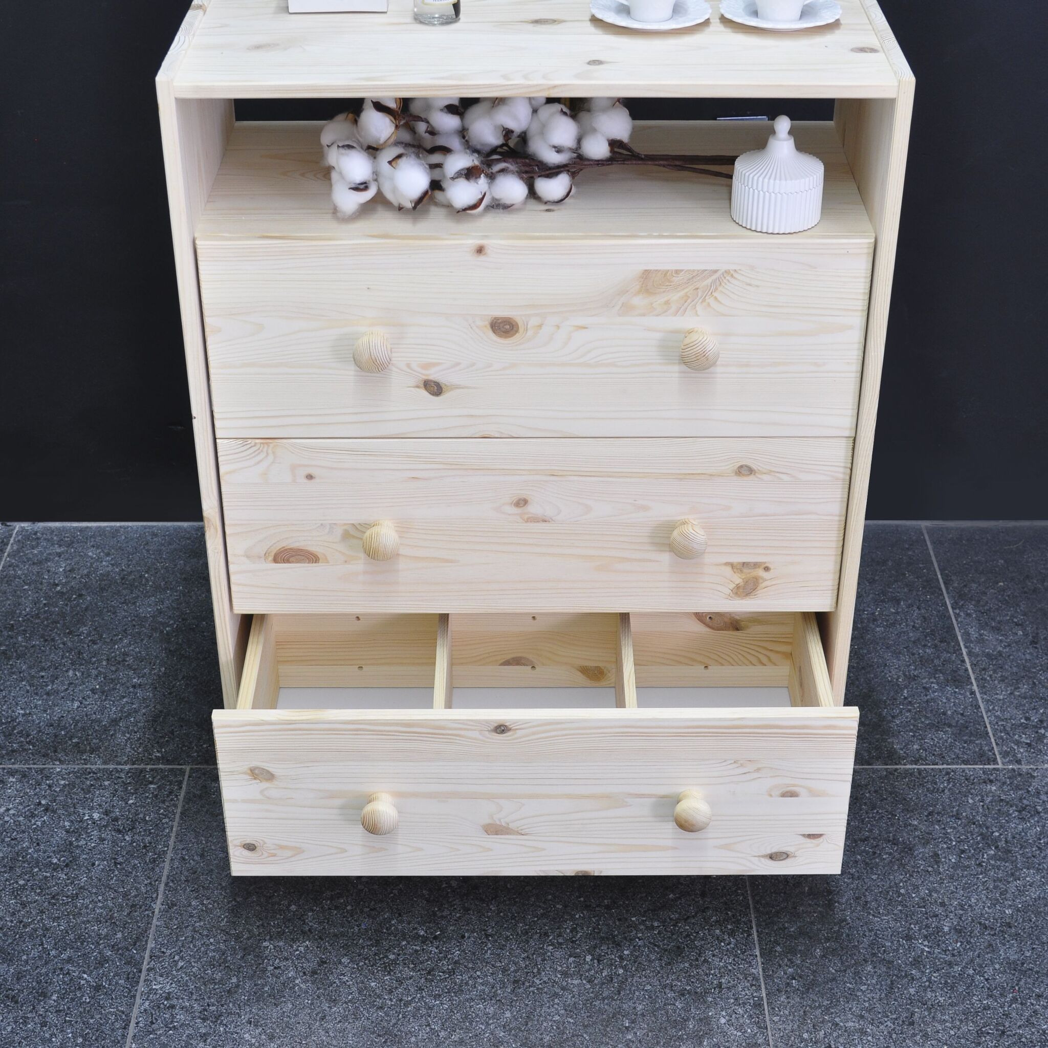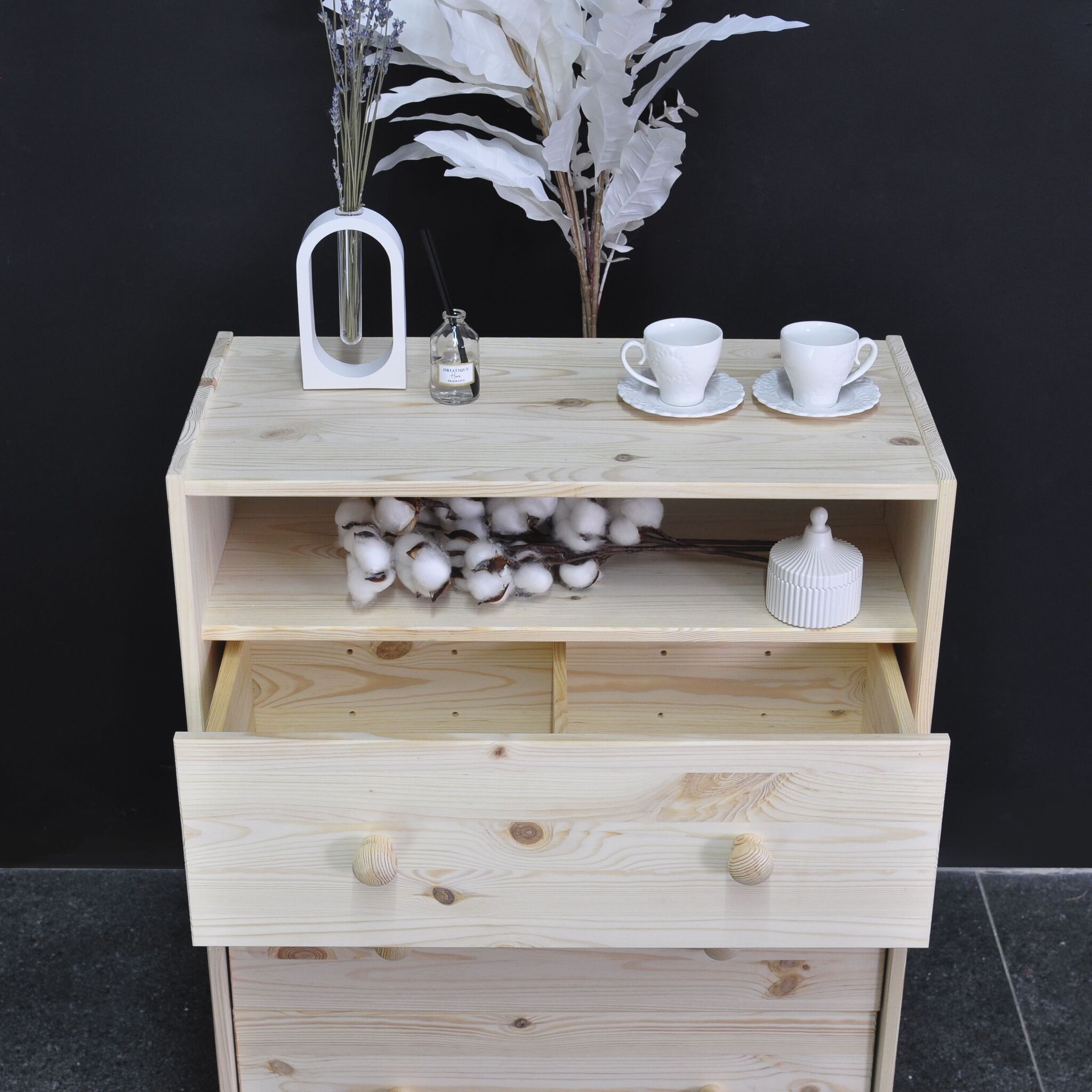 Комод производится без отделки, благодаря чему Вы сами можете выбрать желаемый цвет отделки для своего изделия, будь то белый, черный, серый, зеленый или любой другой цвет. Дополнительно можно заменить ручки, чтобы еще больше изменить внешний вид изделия. Комод с ящиками идеально подойдет для творческих людей, которые желают создать уникальный дизайн своего комода. Комод можно оставить и без покраски в натуральном цвете дерева. Все поверхности уже прошлифованы и готовы к эксплуатации.