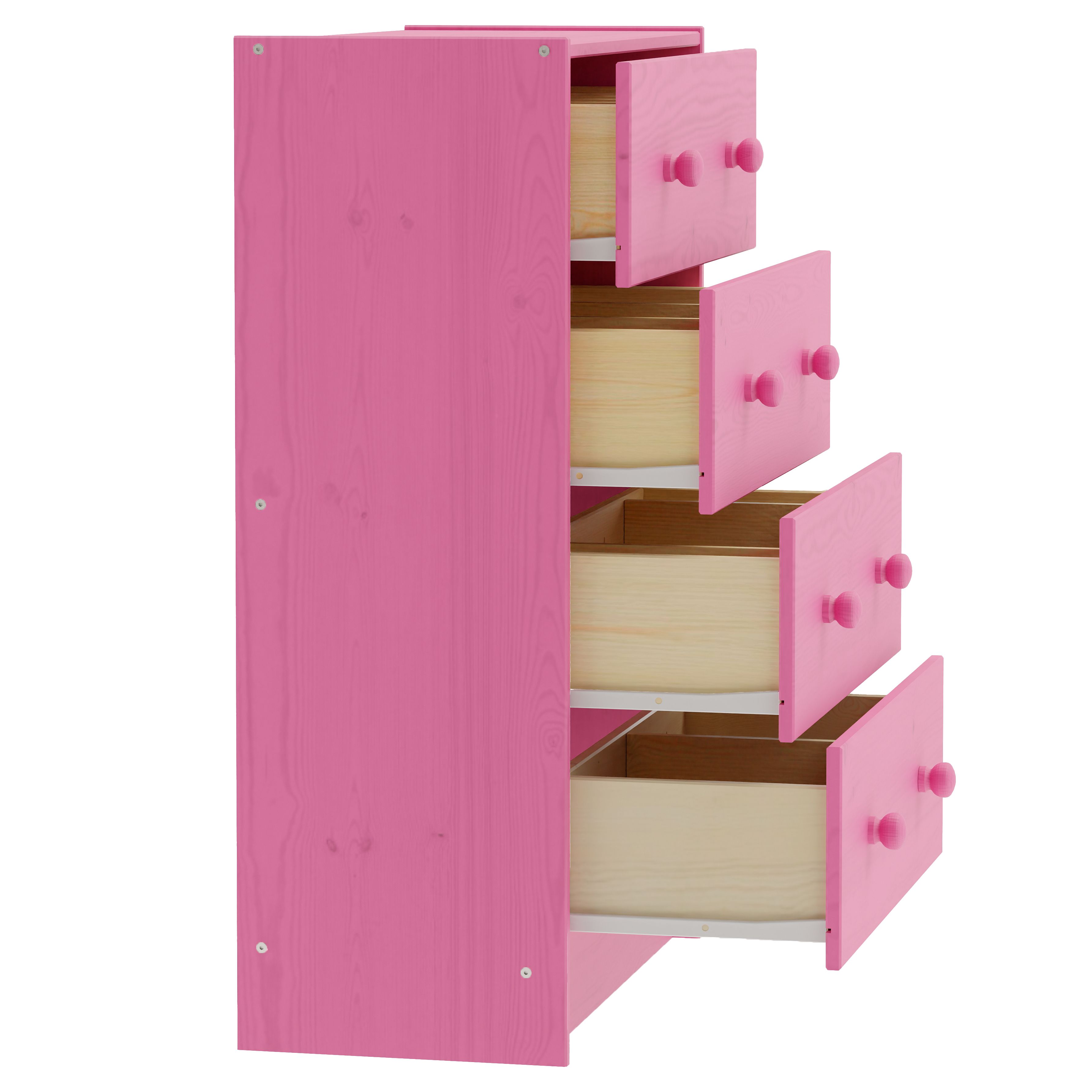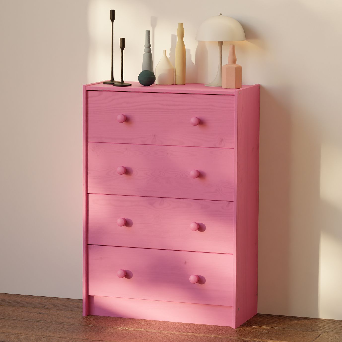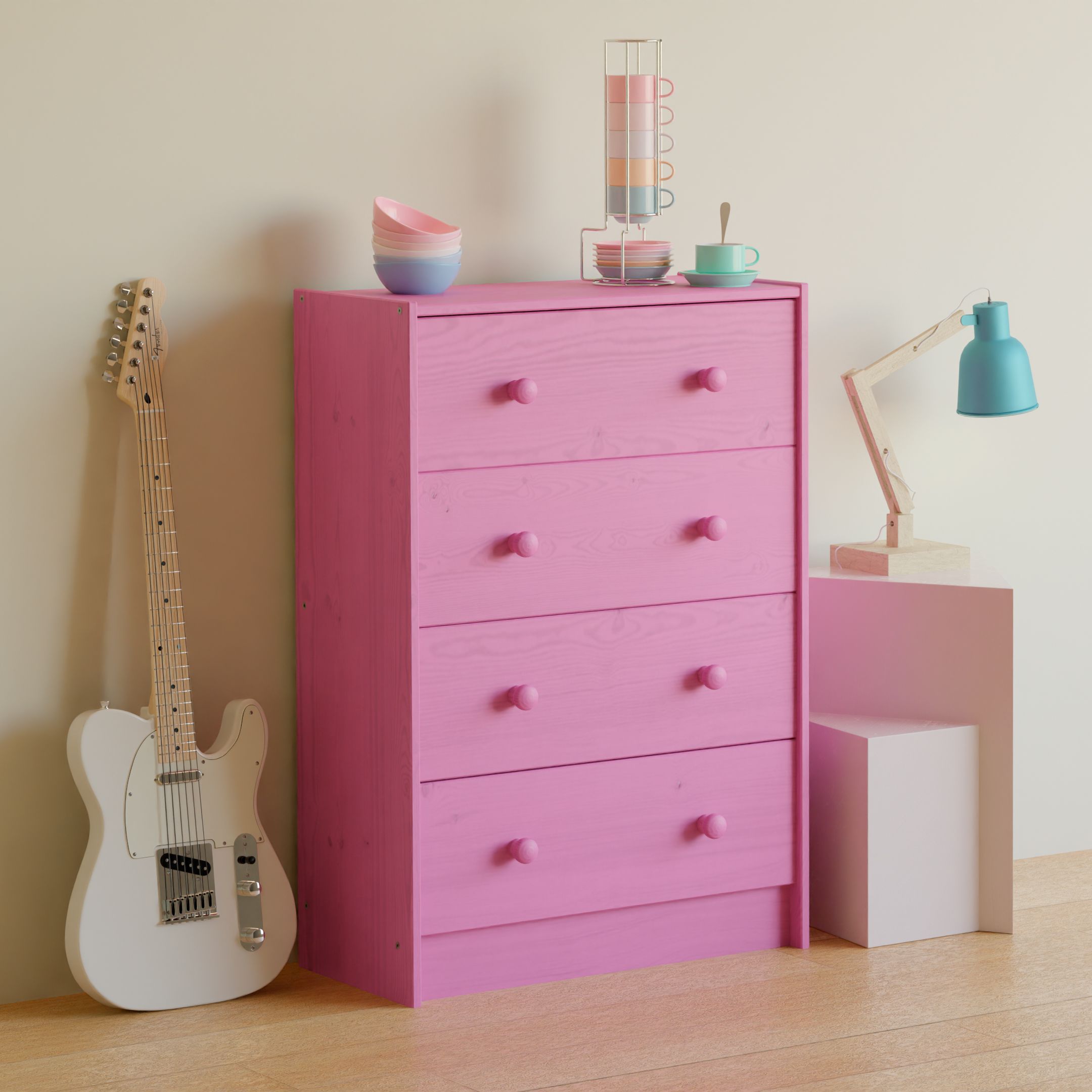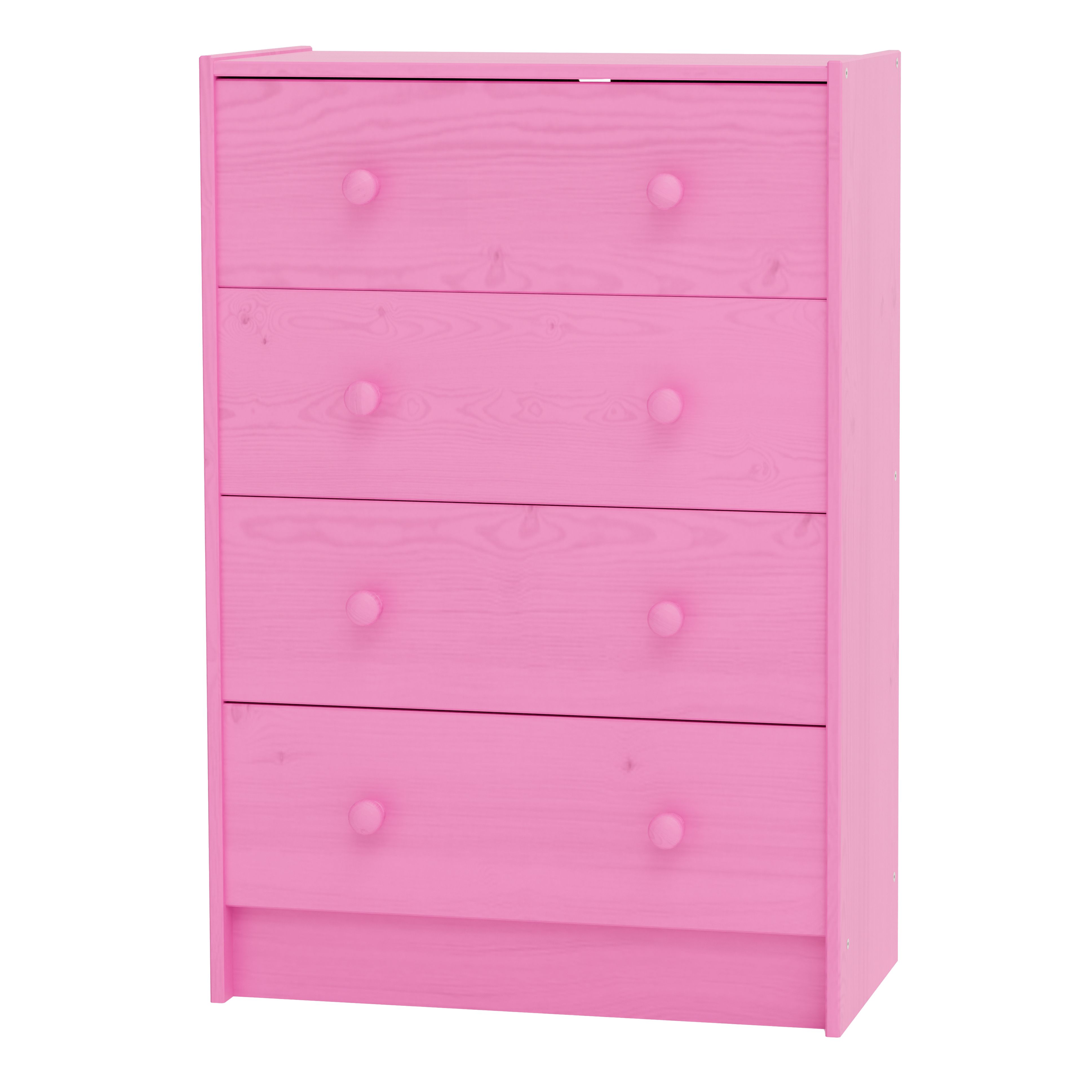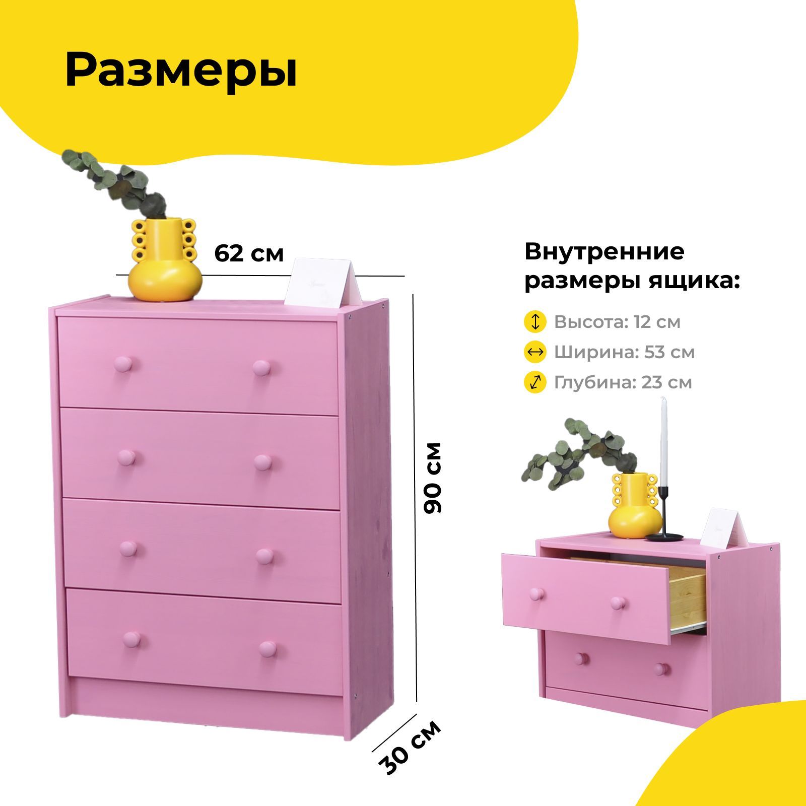 Стильный розовый комод для вещей Раст от белорусского производителя изготовлен из экологически чистого материала - натурального дерева массива сосны, которое отличается высокой прочностью и долговечностью. Комод включает 4 выдвижных ящика с роликовыми направляющими.
