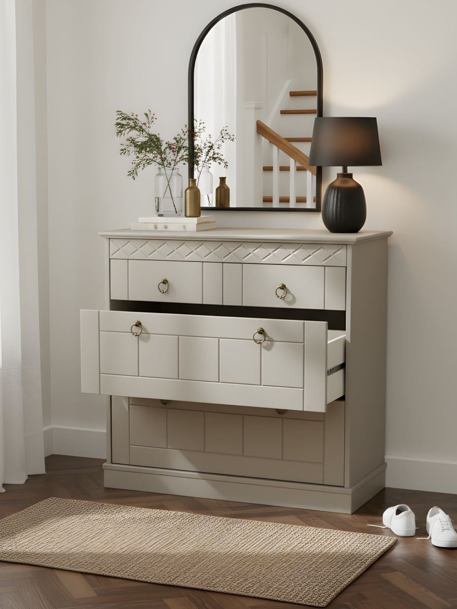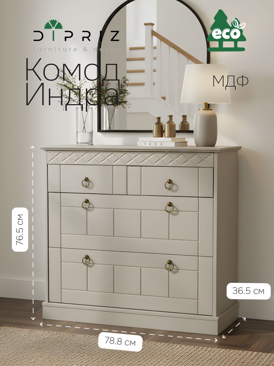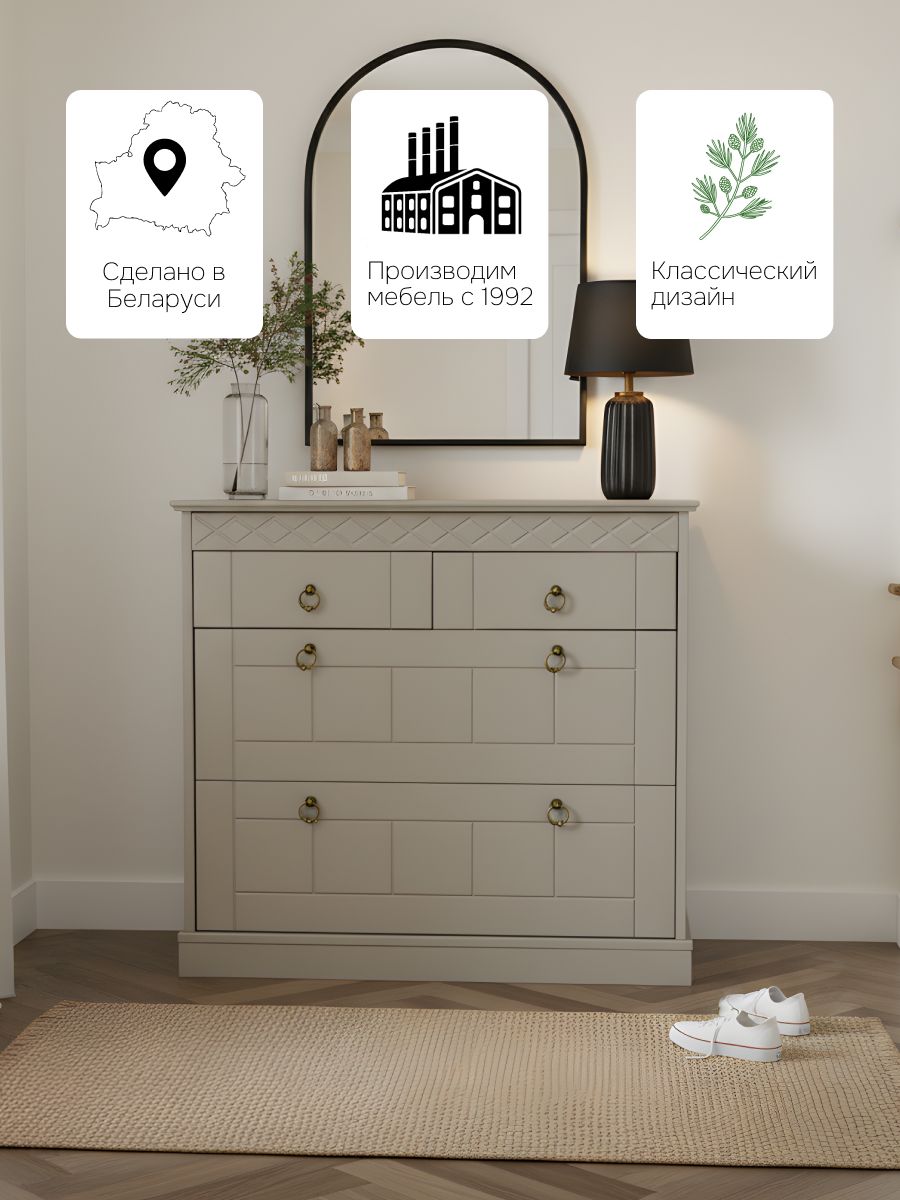 Серый комод "Индра" — это элегантное и практичное решение для вашей прихожей или спальни. Строгий классический дизайн с фрезеровками и ручками под состаренную латунь делает его универсальным элементом интерьера.