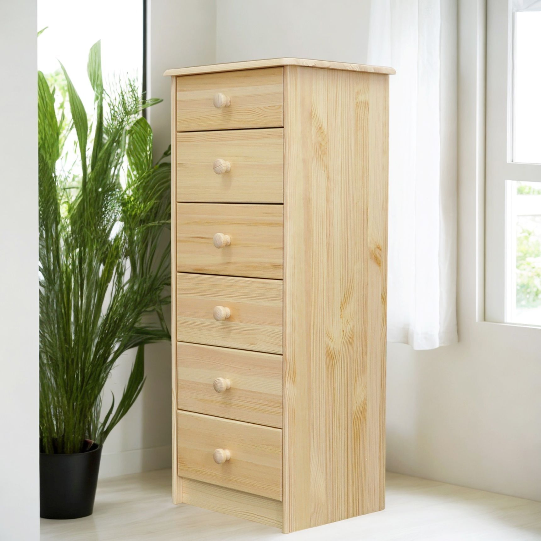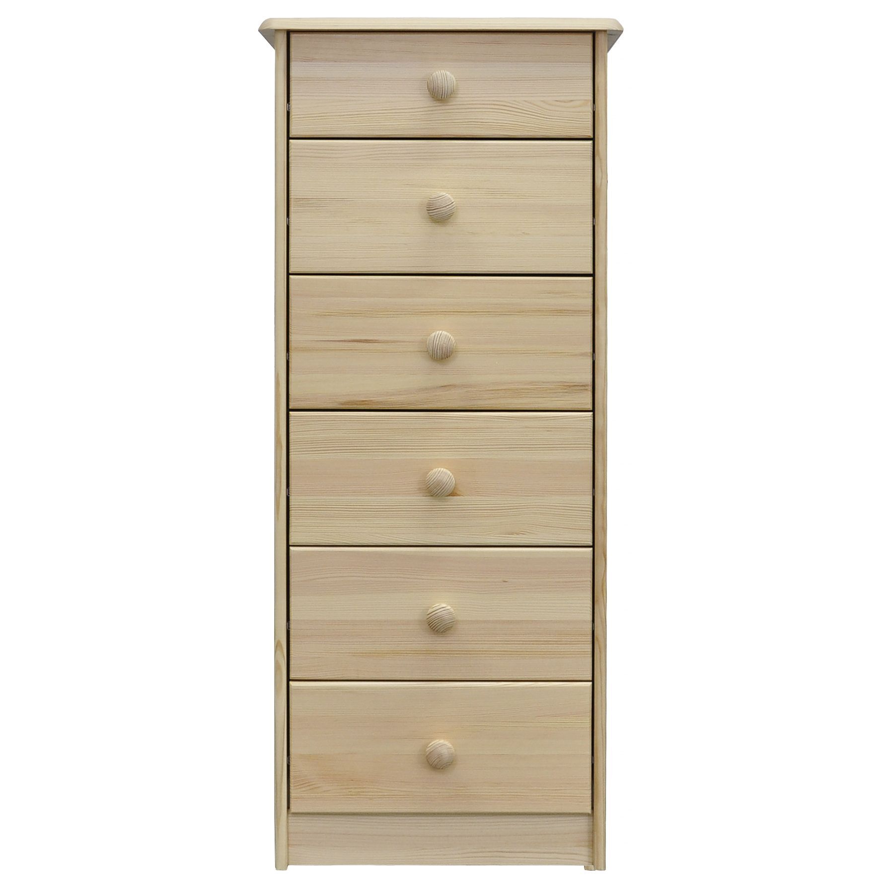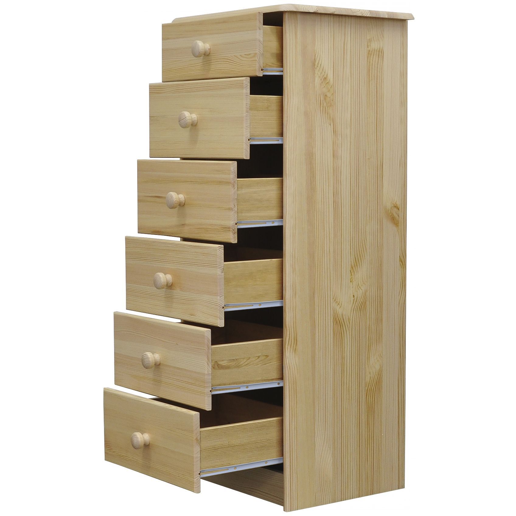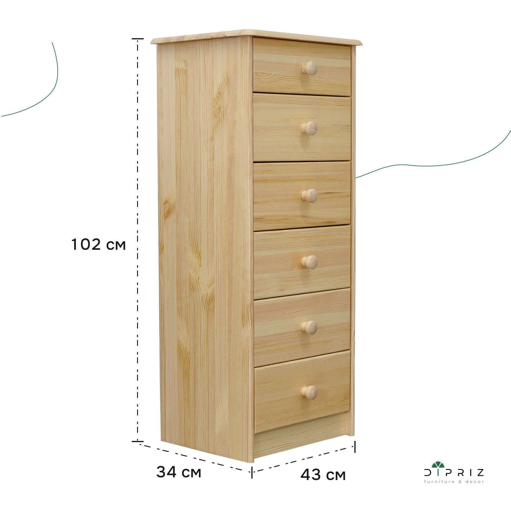 Этот многофункциональный комод из массива дерева включает 6 ящиков, которые идеально подходят для хранения одежды, аксессуаров и других предметов. Благодаря своим размерам (ширина х глубина х высота, см) - 43х34х101.7 см - мебель можно использовать в качестве узкого комода в спальню, высокого комода для прихожей, а также детского комода с выдвижными ящиками. Прочные стенки, крышка и полик добавляют надежности использования мебели и её долговечность.
