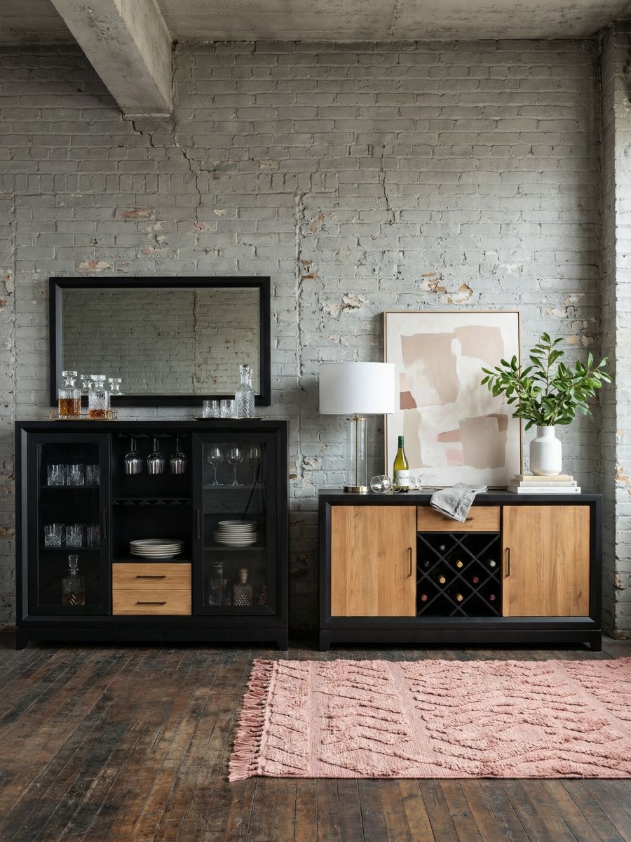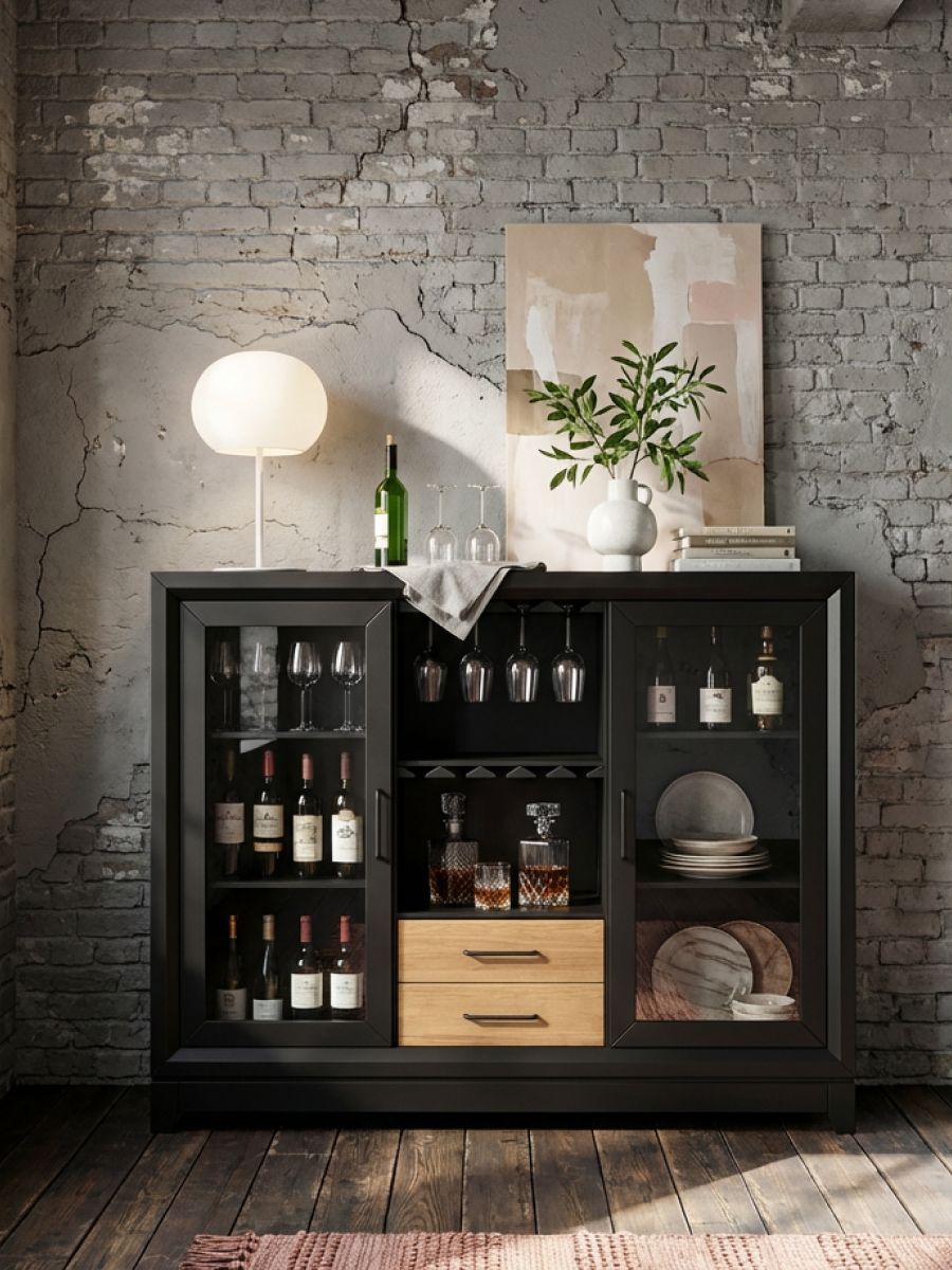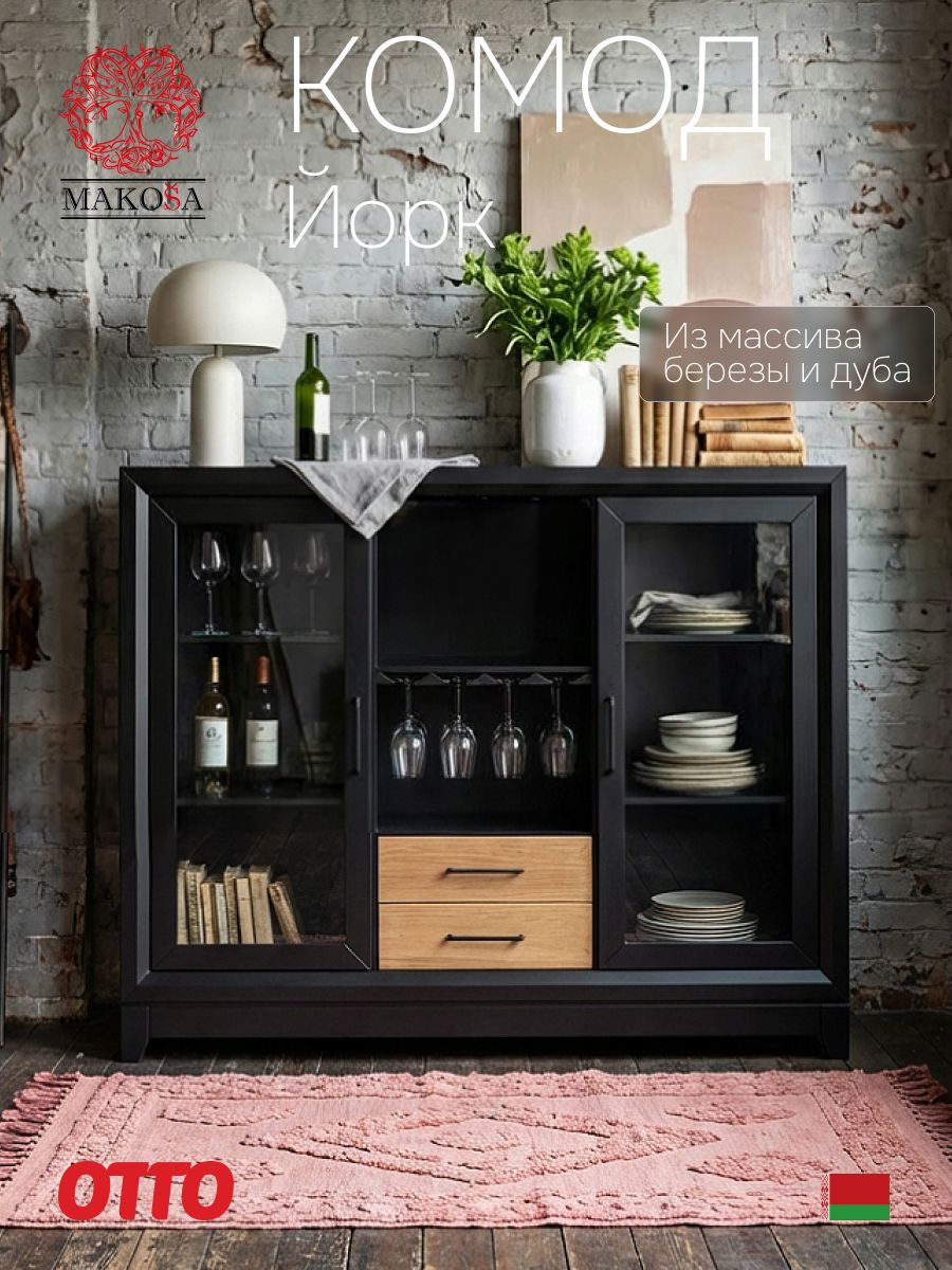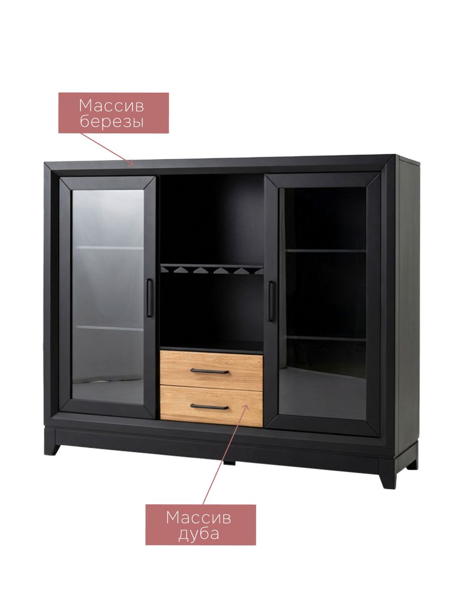Эта многофункциональная мебель сочетает в себе роль комода, витрины, буфета и серванта. Изготовлен из прочных материалов — массива берёзы и дуба с матовым покрытием, что обеспечивает долговечность и эстетичный внешний вид. Черный цвет корпуса контрастирует с натуральным деревянным фасадом, создавая эффектный акцент в интерьере.