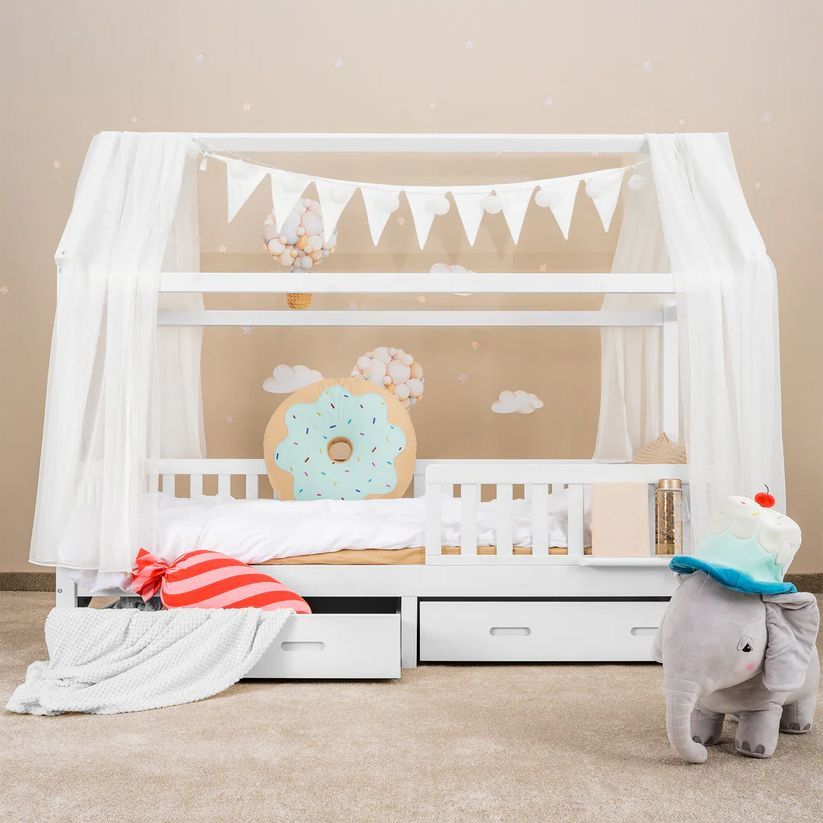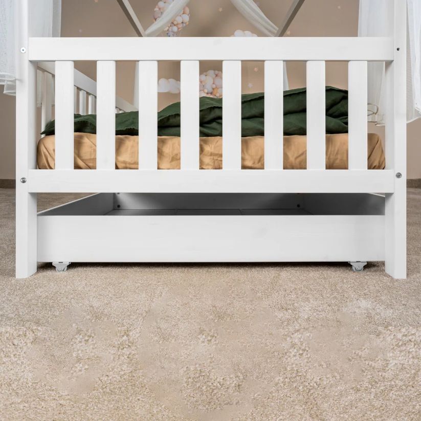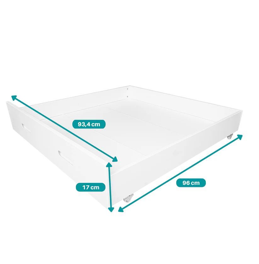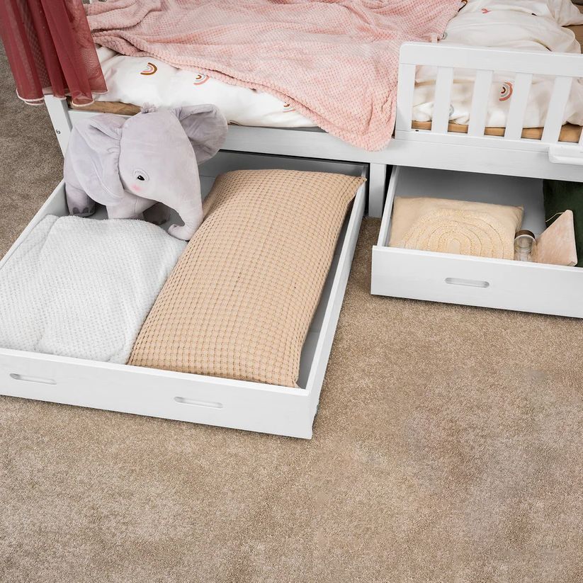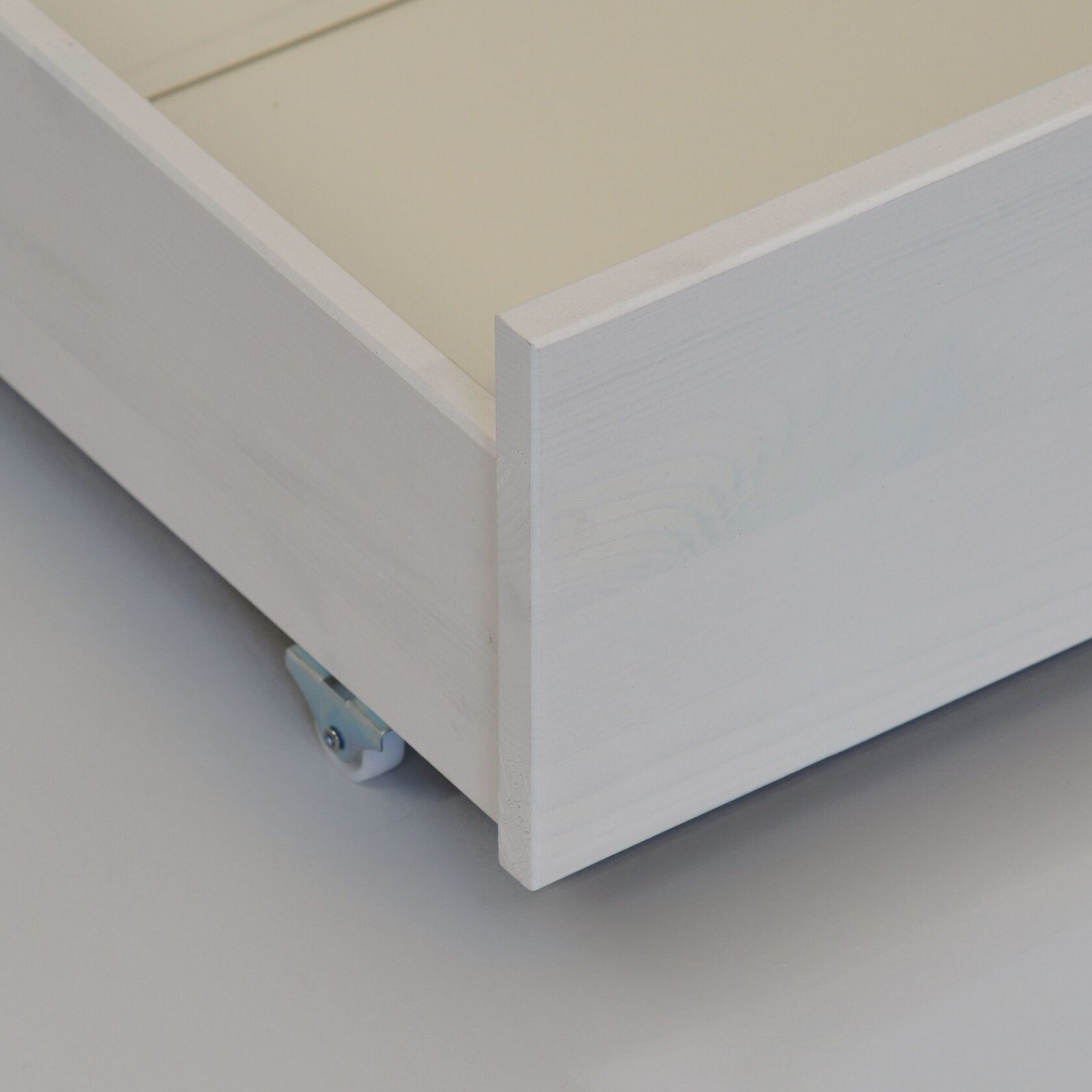 Комплект ящиков (2 шт.) для односпальной кровати домика Альков 90х200 из массива сосны от белорусского производителя ООО «Диприз» выполнен в Скандинавском стиле в белом цвете. Ящики для кровати поставляются отдельно от кровати вместе с полным комплектом фурнитуры и инструкцией для сборки и установки под кровать. Размер ящика в собранном виде (Длина х Ширина х Высота, см) - 96х93.4х17 см. Прочно прилегают к кровати, не шатается и не скрипит, имеет гладкие края. Ящики установлены на металлических колесиках, что способствует их плавному выдвижению. Односпальная кровать Альков доступна к покупке в нашем каталоге (SKU: 1378169259). Детская кровать-домик Альков (размер спального места: 90x200 см) от белорусского производителя ООО "Диприз" в Скандинавском стиле. Кровать из массива сосны создаст уютную, творческую обстановку в комнате вашего ребенка. Особенностью детской кровати является наличие бортиков, что обезопасит малыша от падения с кровати во сне. Кровать включает в себя 4 бортика безопасности, а также настил из массива сосны размером 90х200 см. К детской кровати-домику можно дополнительно установить балдахин, оборудовать подсветкой и украсить по своему усмотрению. Благодаря своей конструкции кровать прочная, не скрипит, а размер спального места 90х200 см позволяет легко выдерживать даже взрослого человека. Кровать изготовлена из натуральной древесины - массива сосны, она не скрипит, не пахнет краской, а наполняет помещение тонким и приятным ароматом хвойного дерева. В процессе производства использовались только качественные безопасные материалы и покрытия. Максимально допустимая нагрузка 100 кг на одно спальное место позволяет использовать ее как детскую и подростковую кровать, также в качестве односпальной кровати для взрослых. Бортик безопасности длиной 102,2 см и высотой - 29,6 см надежно защитит спящего от случайного травмирования. Габаритные размеры кровати - (ШxВxГ): 97x170x203,4 см, сечение ног 5x5 см, высота боковой царги 33 см, расстояние от пола до низа боковой царги 21 см. Эта модель поставляется в трех видах отделки – без отделки (натуральный) (SKU: 1483274639), в натуральном лаке (SKU: 1378174362) или с покрытием белым воском (SKU: 1378169259). Детскую кровать домик с бортиками легко собрать за счет набора фурнитуры для сборки, который поставляется вместе с кроватью. В комплекте идёт подробная иллюстрированная инструкция, которая поможет легко и быстро собрать кровать. Изделие укомплектовано настилом под матрасы (матрас не входит в комплект, докупается отдельно). Рекомендуемый размер матраса 90х200, макс. высота матраса до 20 см. Возможна установка бортика на правую и левую сторону во время сборки. Бортик можно не устанавливать при сборке.