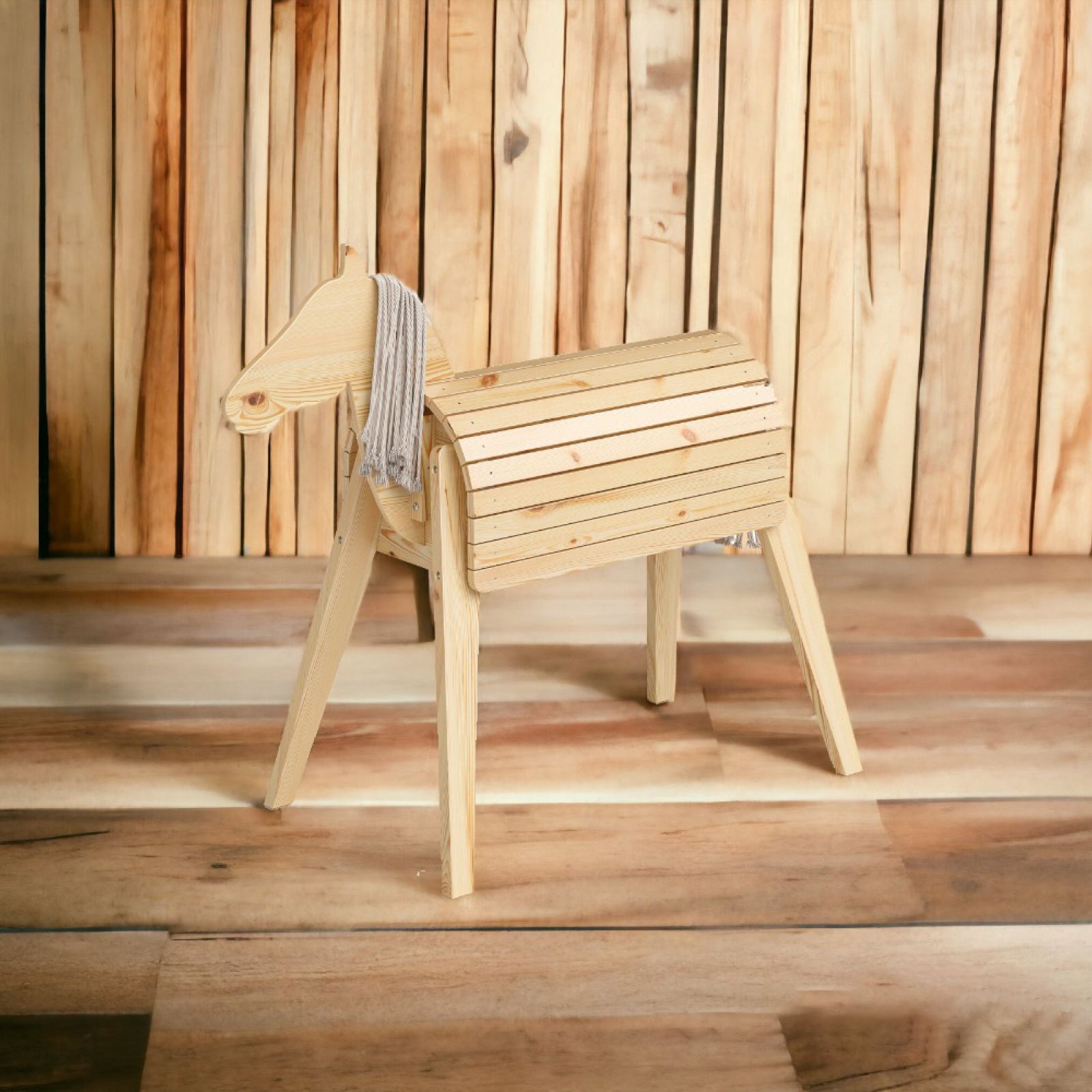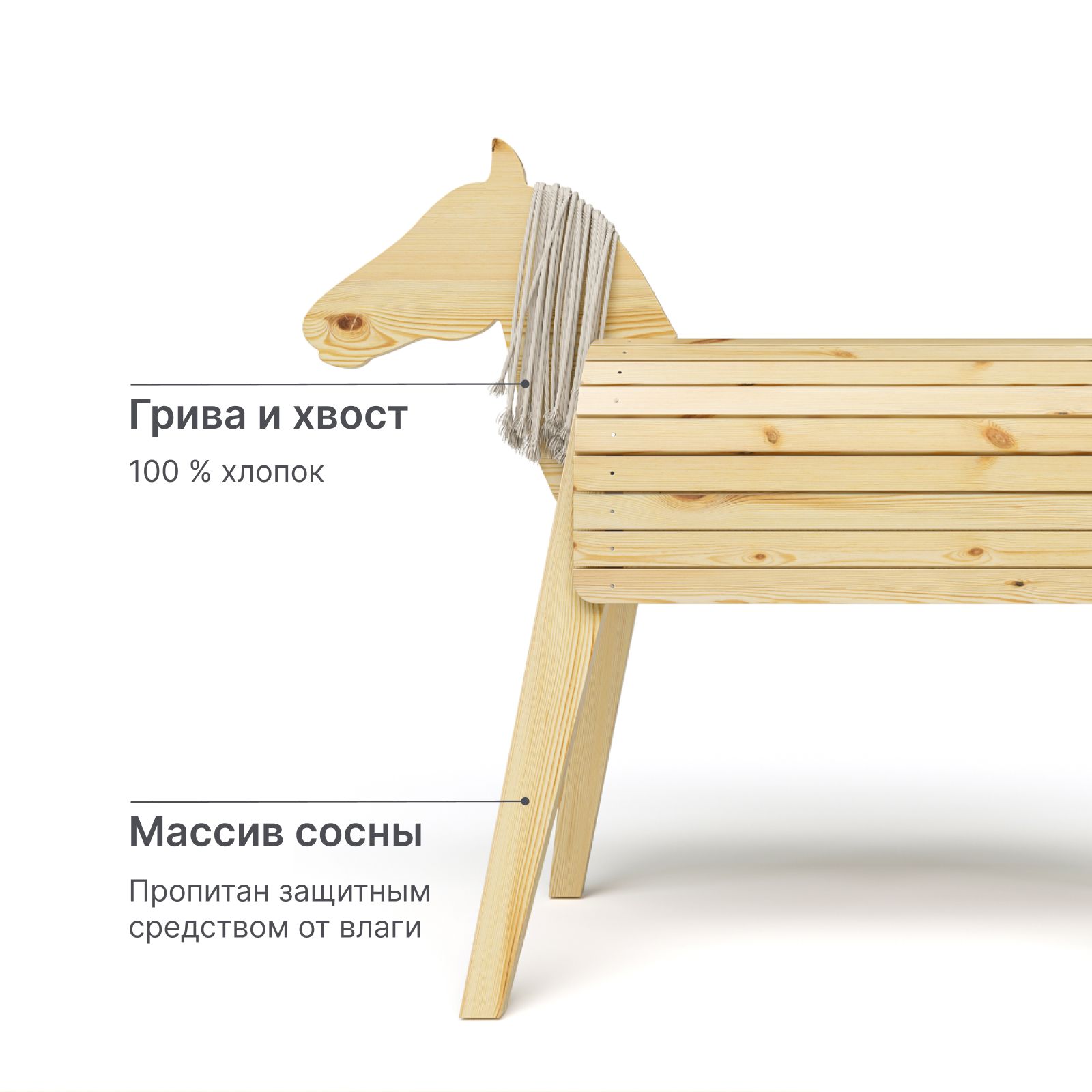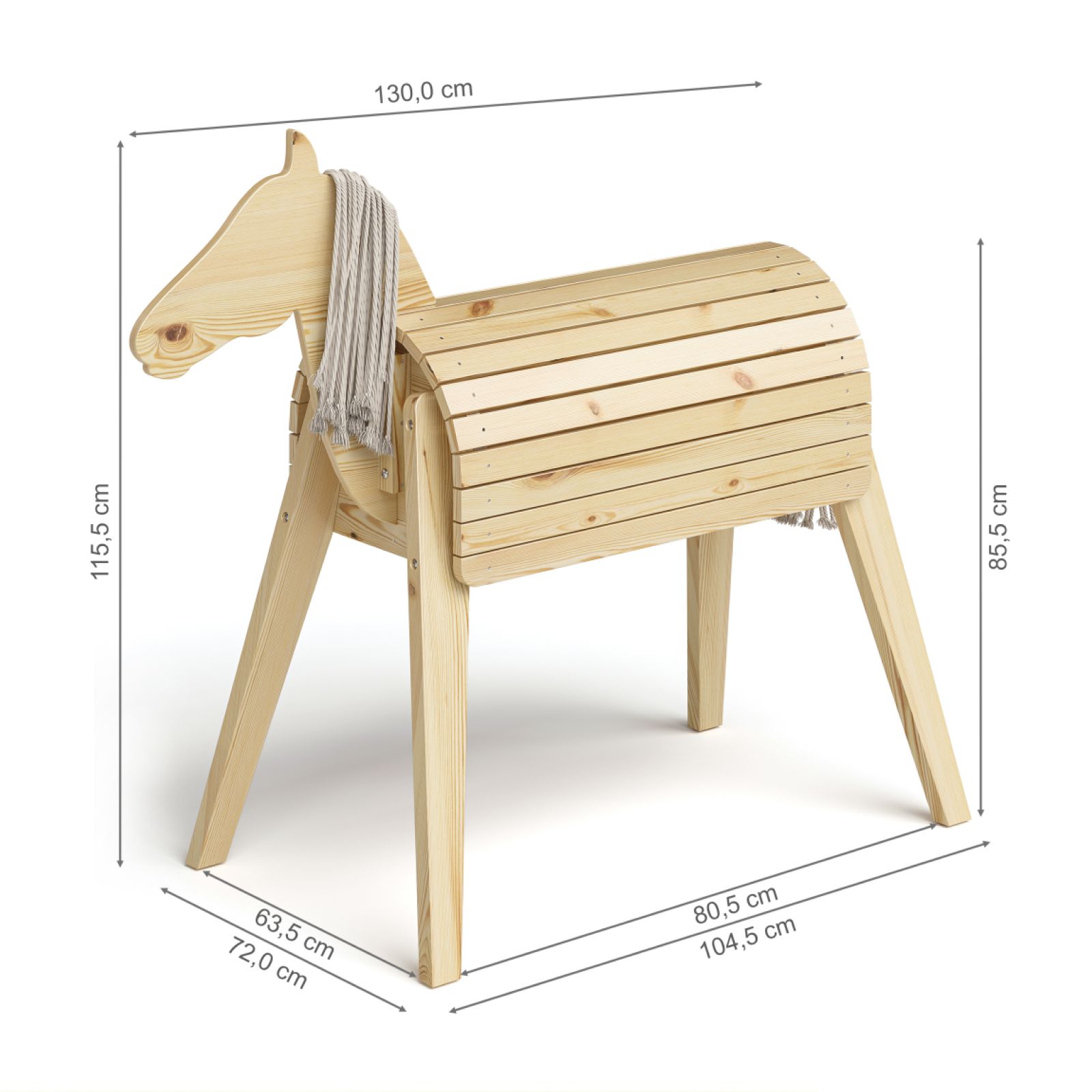 Лошадь Хари — идеальный декоративный предмет для любителей верховой езды, активностей и всех любителей лошадей. Декоративная лошадь высотой спинки 86 см подходит как украшения комнаты, так и для расположения на нем декора. «Хари» также может быть загружен весом до 100 кг. Игровая лошадка специально разработана для возможных активностей на открытом воздухе, чтобы выдерживать трудности использования. Прочная сосновая древесина, из которой изготовлена лошадь Хари, гарантирует долгий срок службы и оптимальную устойчивость к внешним воздействиям. «Хари» также характеризуется особенно стабильной структурой. Благодаря расклешенным ножкам коня, возможно безопасно взобраться на спинку высотой 86 см, а гладкая поверхность и закругленные края всегда обеспечивают безопасное использование. Внешний вид изделия очень детализирован и предлагает множество возможностей. Хлопковую гриву и хвост можно заплести по своему желанию. Таким образом, вы можете украсить лошадку по своему вкусу. Деревянный конь – идеальное сочетание праздничного волшебства и декоративной красоты. Этот конь, изготовленный из качественного дерева, станет любимым украшением в каждой комнате, так и стильным элементом интерьера. Удивительная проработка деталей делает его непременно привлекательным, а его потрясающая прочность обещает долговечность. Независимо от того, представляет ли он воспоминания о далёких конных прогулках, деревянный конь добавит нотку сказочной атмосферы и веселой развлекательности в жизнь каждой семьи. Разработан с любовью и вниманием к деталям, этот декоративный конь порадует всех своим внешним видом, становясь прекрасным подарком для любого случая.