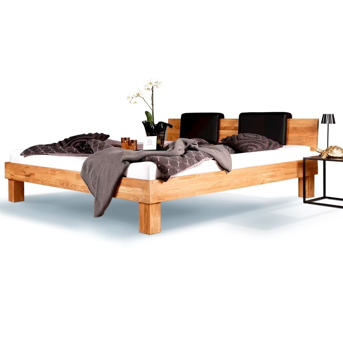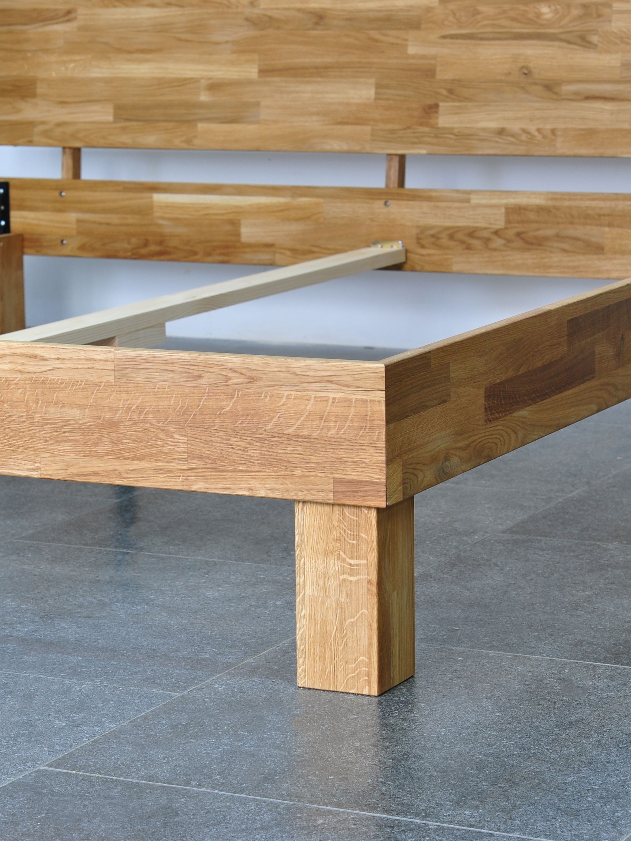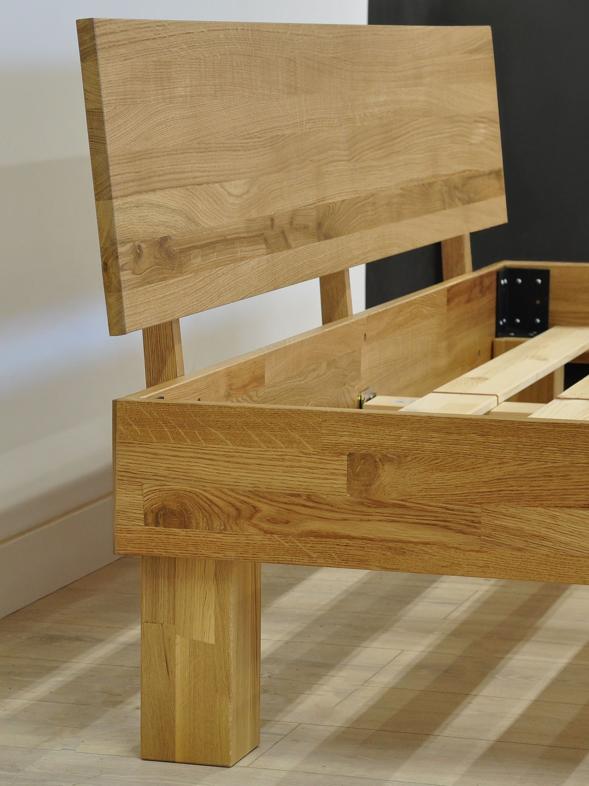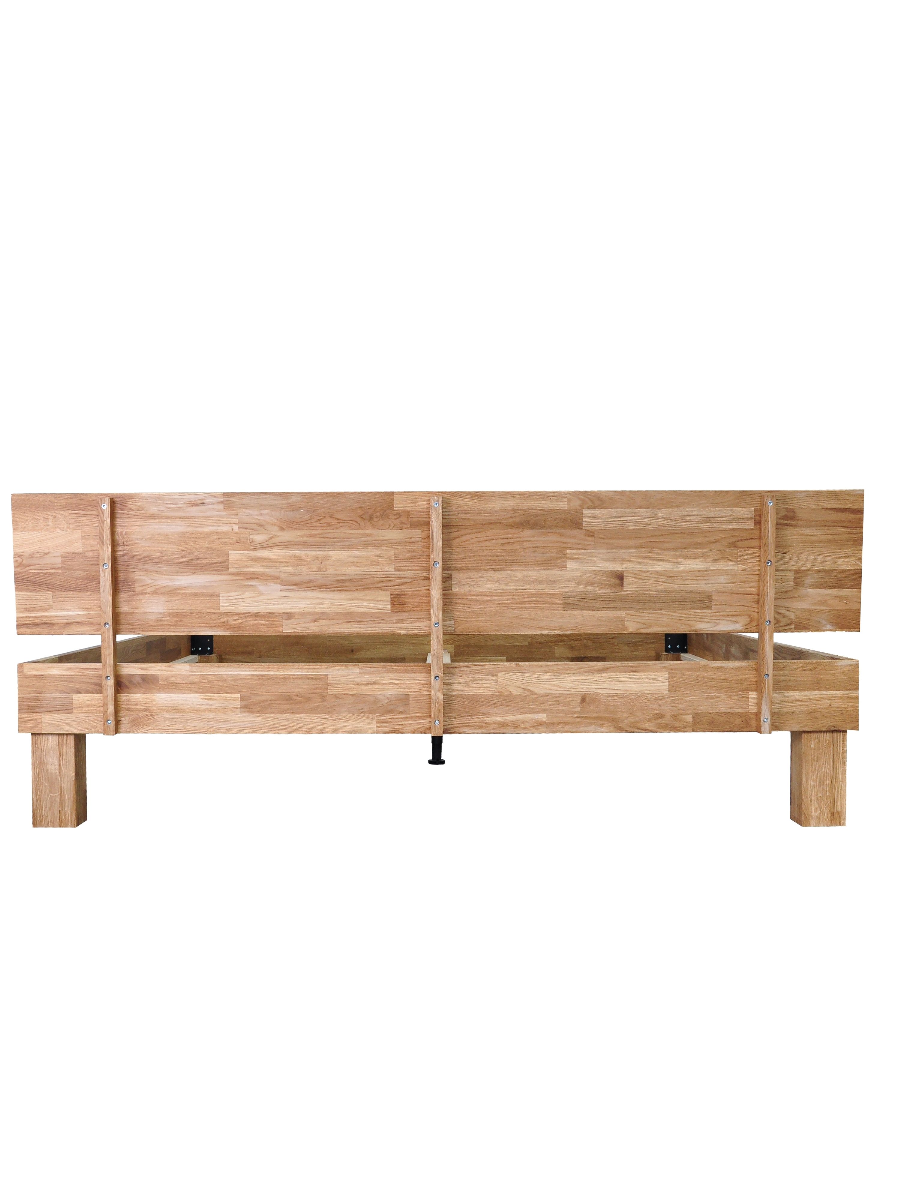 - Массив дуба премиум-класса: Кровать выполнена из цельноламельного дуба толщиной 20 мм, пропитанного натуральным маслом для долговечности и устойчивости к повреждениям.